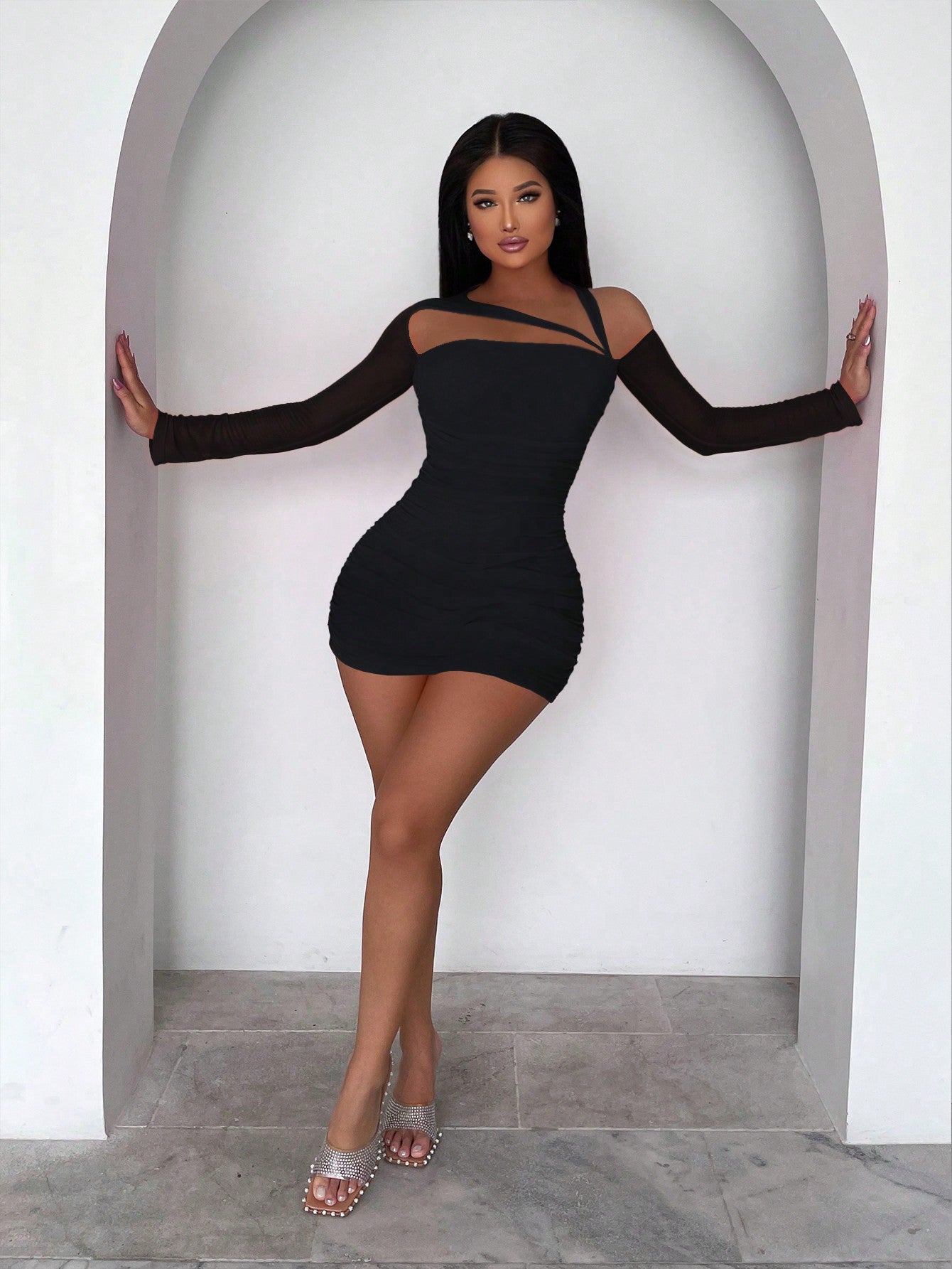 VaVaBold Women's Solid Color Asymmetrical Neckline Long Sleeve Bodycon Dress