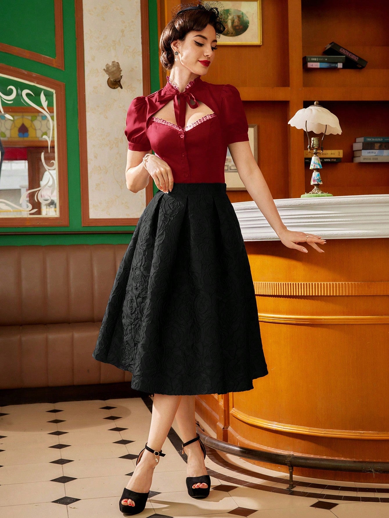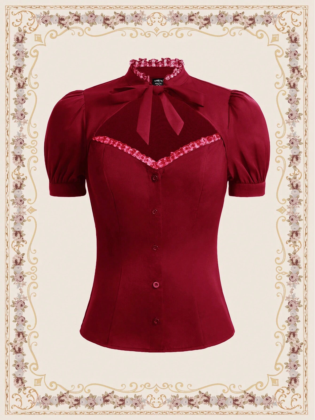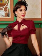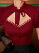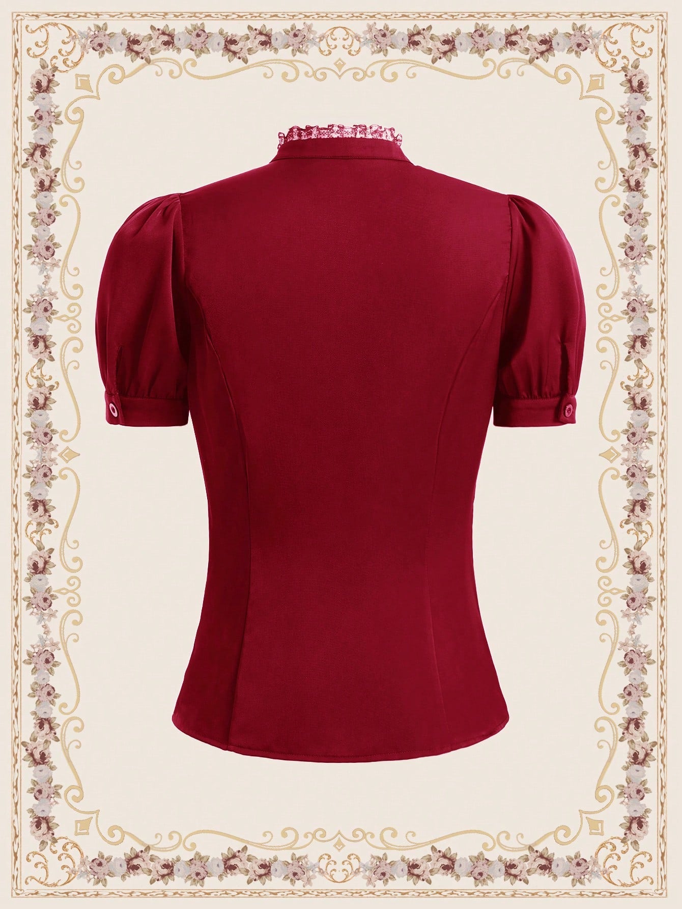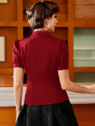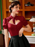Vintamour Vintage Elegant Women's Shirt, Spring/Summer, Small Stand Collar, Lace Trim, Puff Sleeves,