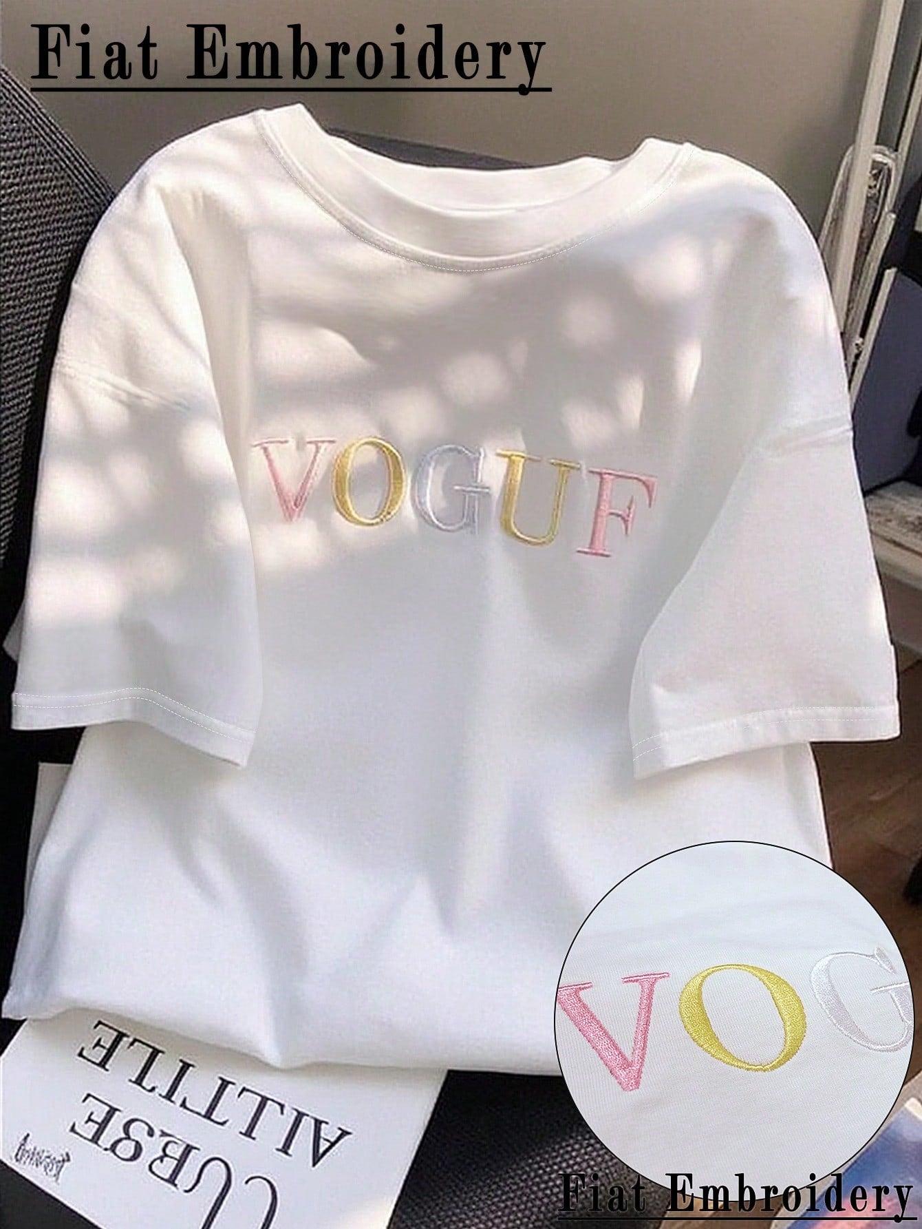 Women's Summer Macaron Color Fitted T-Shirt With Voguf Embroidery Design