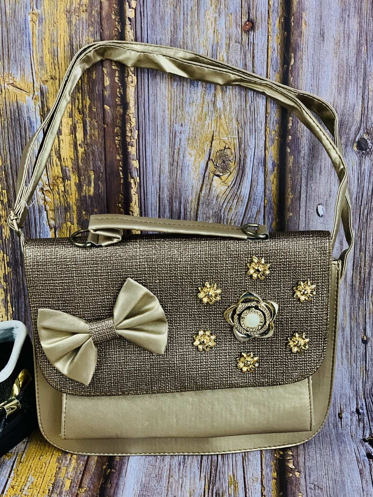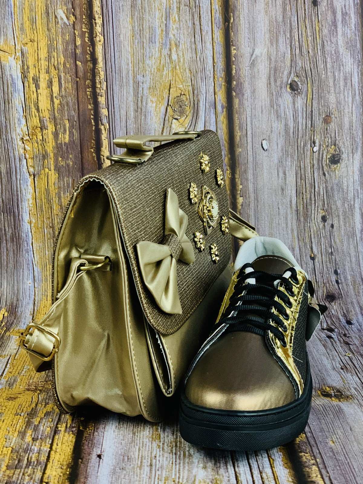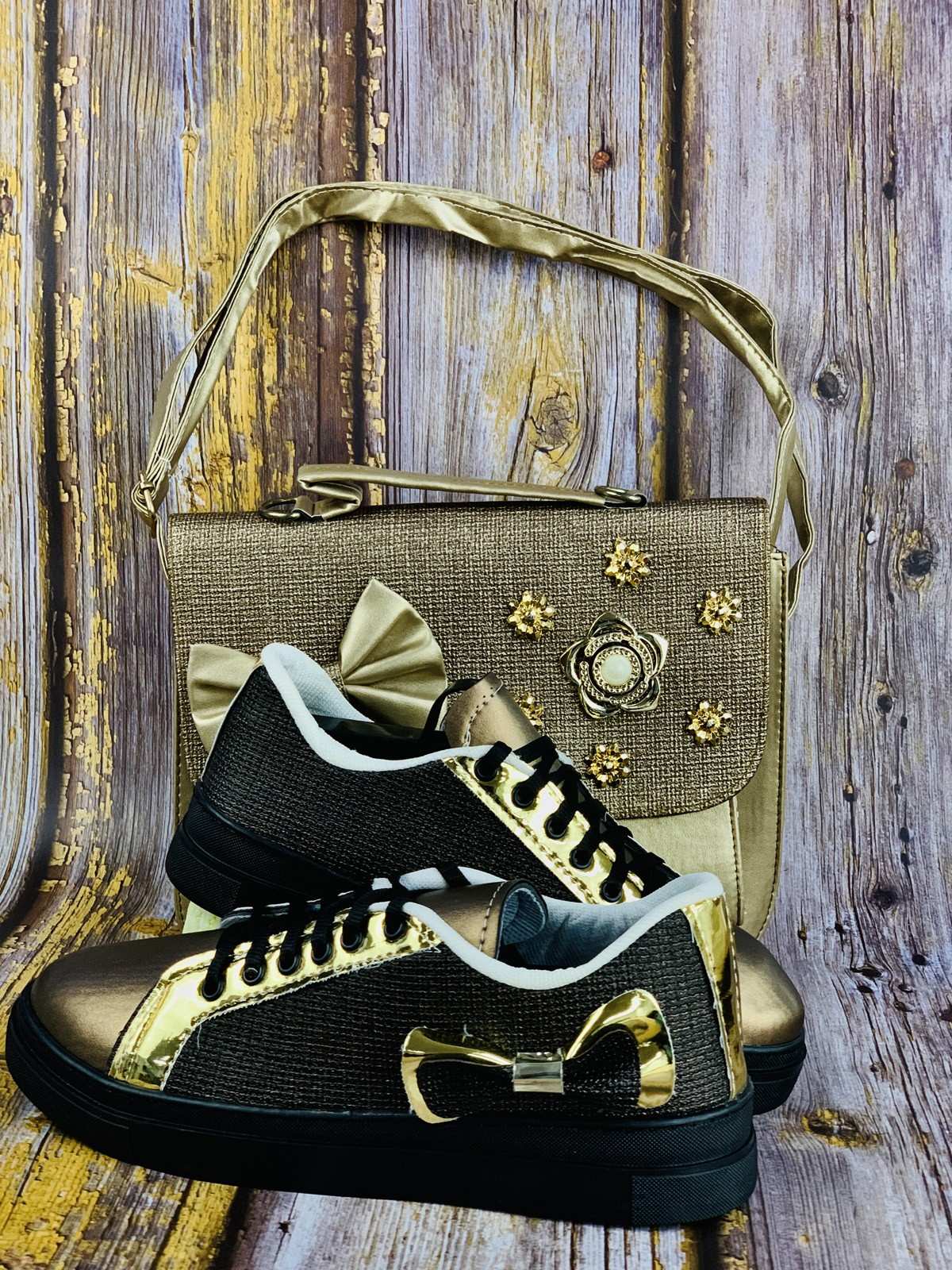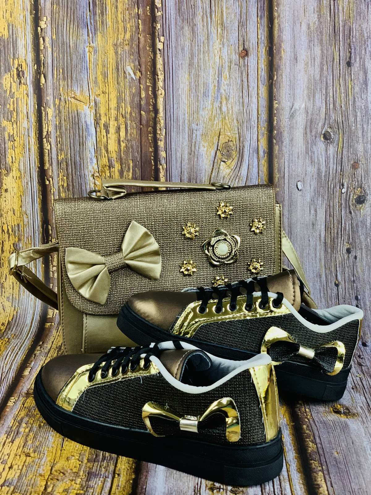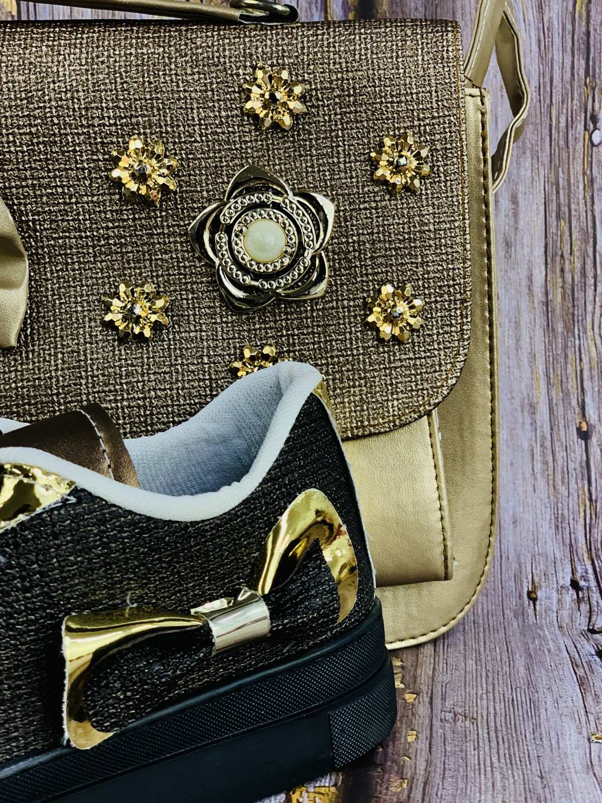 Gold and black bag, shoes and purse with a decorative bow in the form of a flower with fur