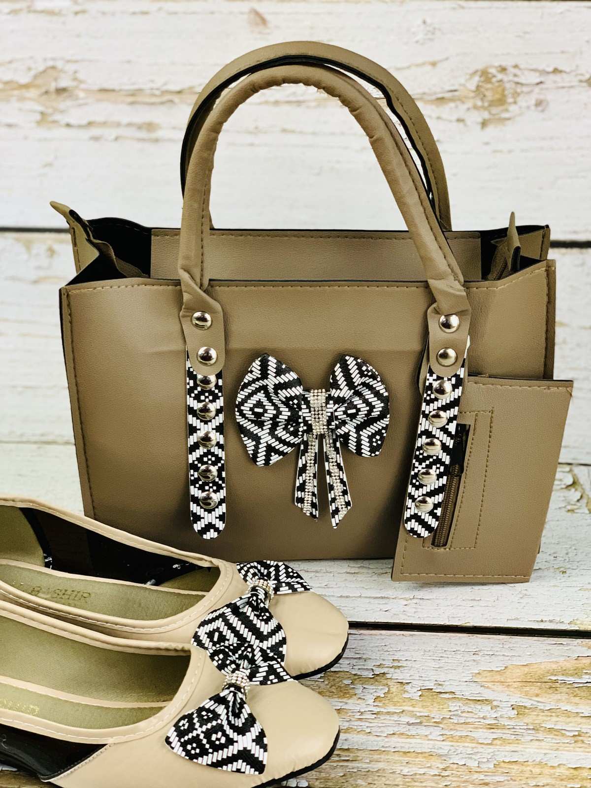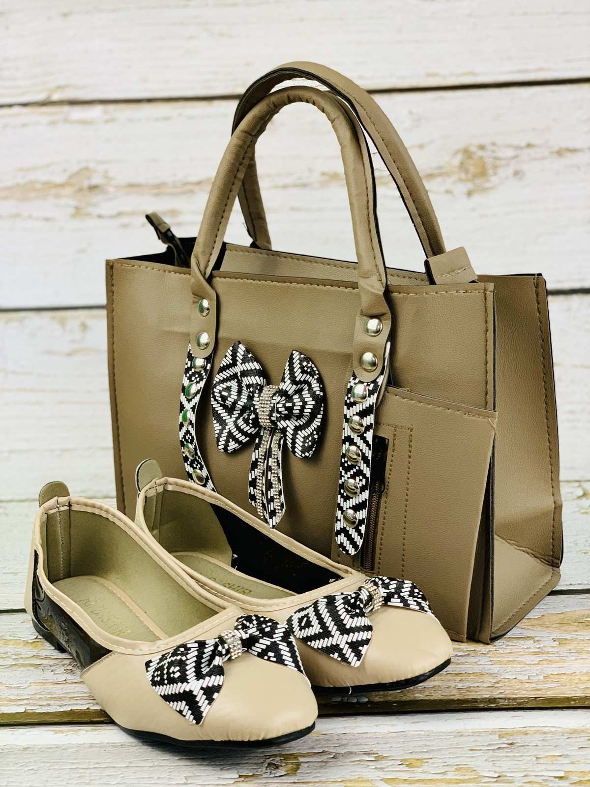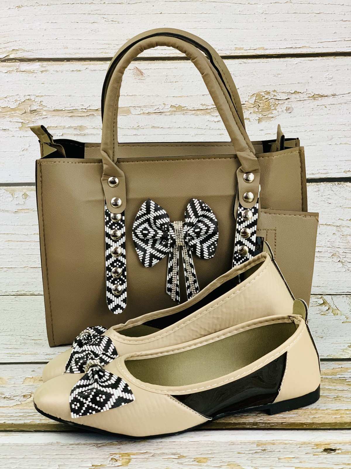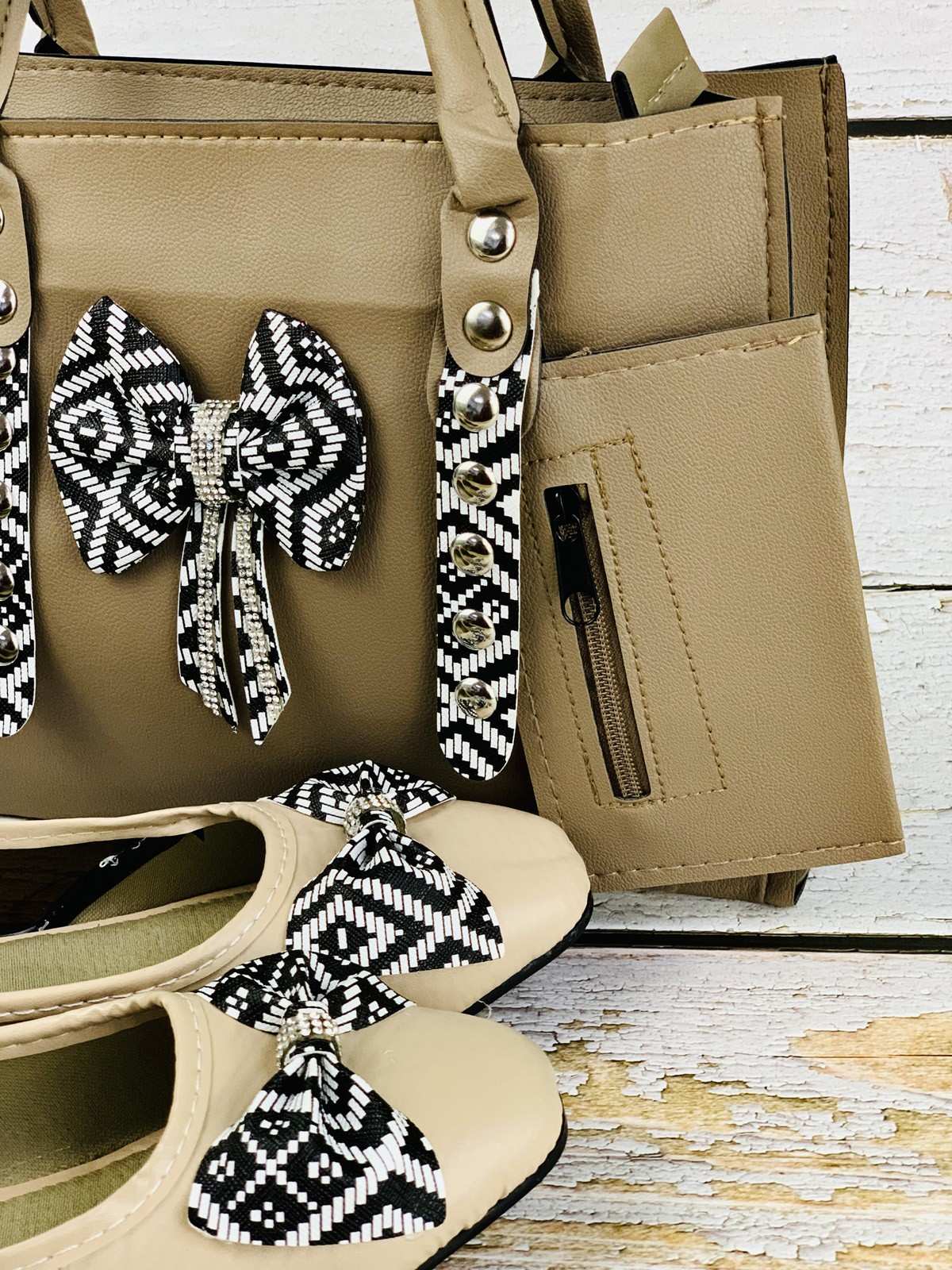Women - Light and dark beige bag, shoes and purse, decorative knot