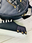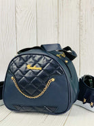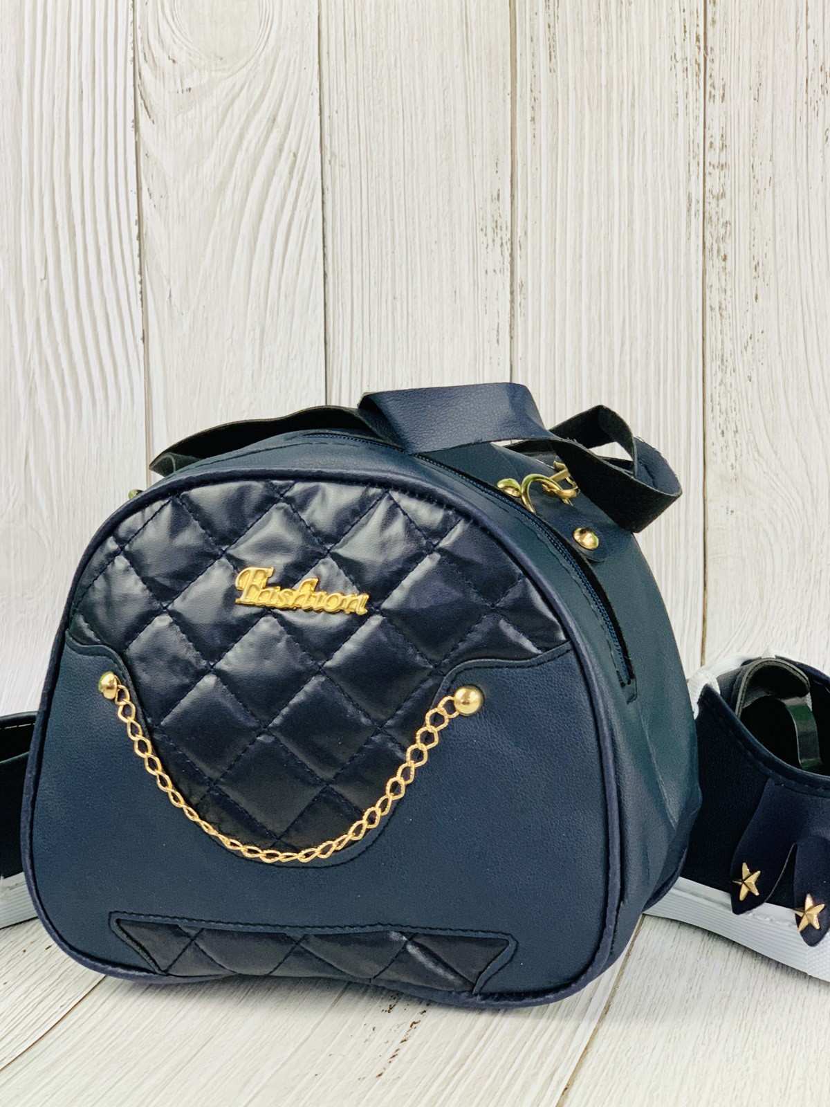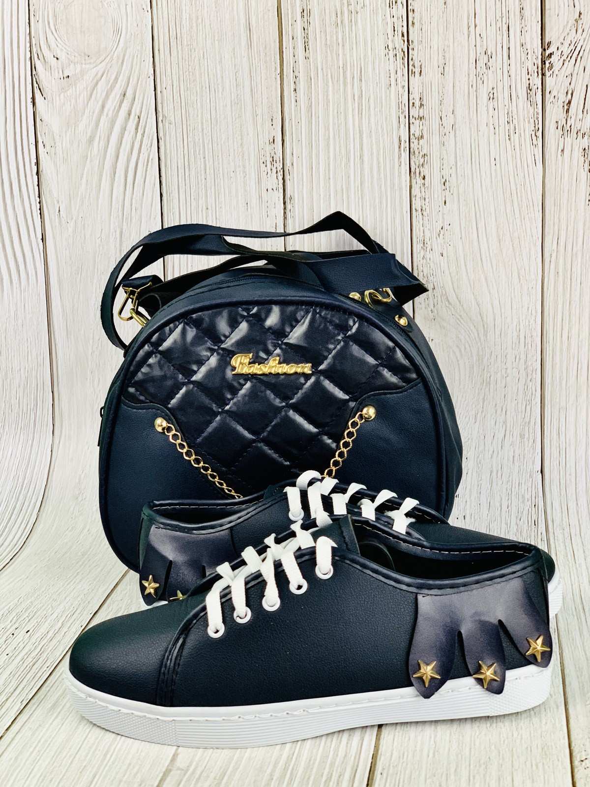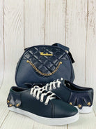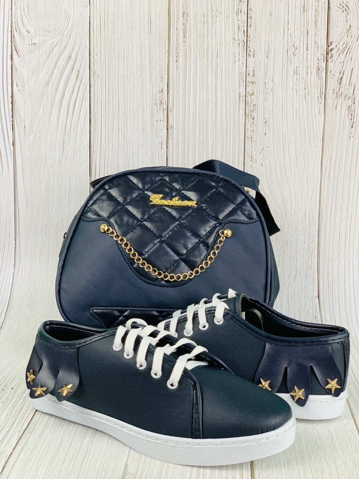 Navy bag and shoes with a decorative bow in the shape of a flower