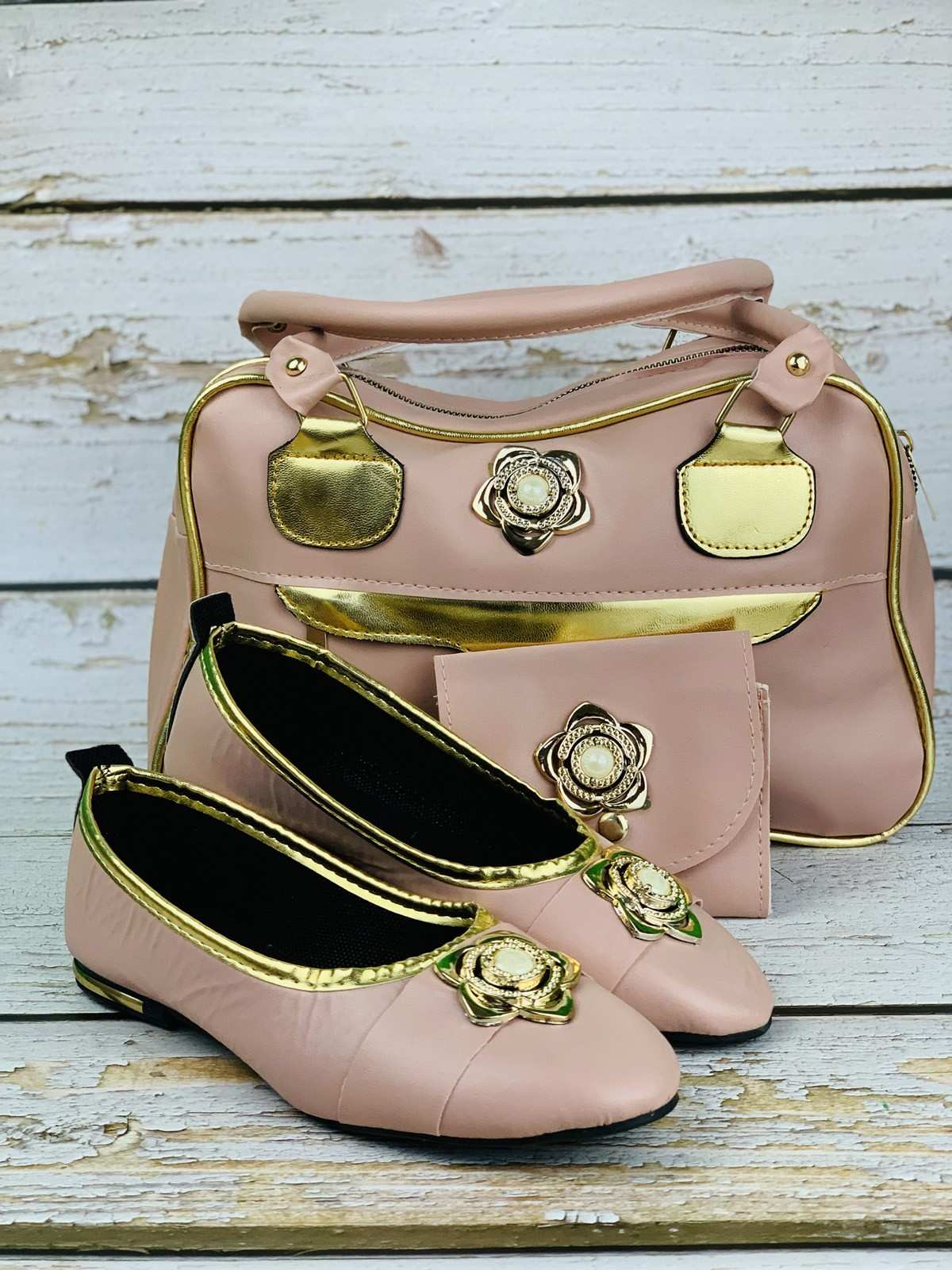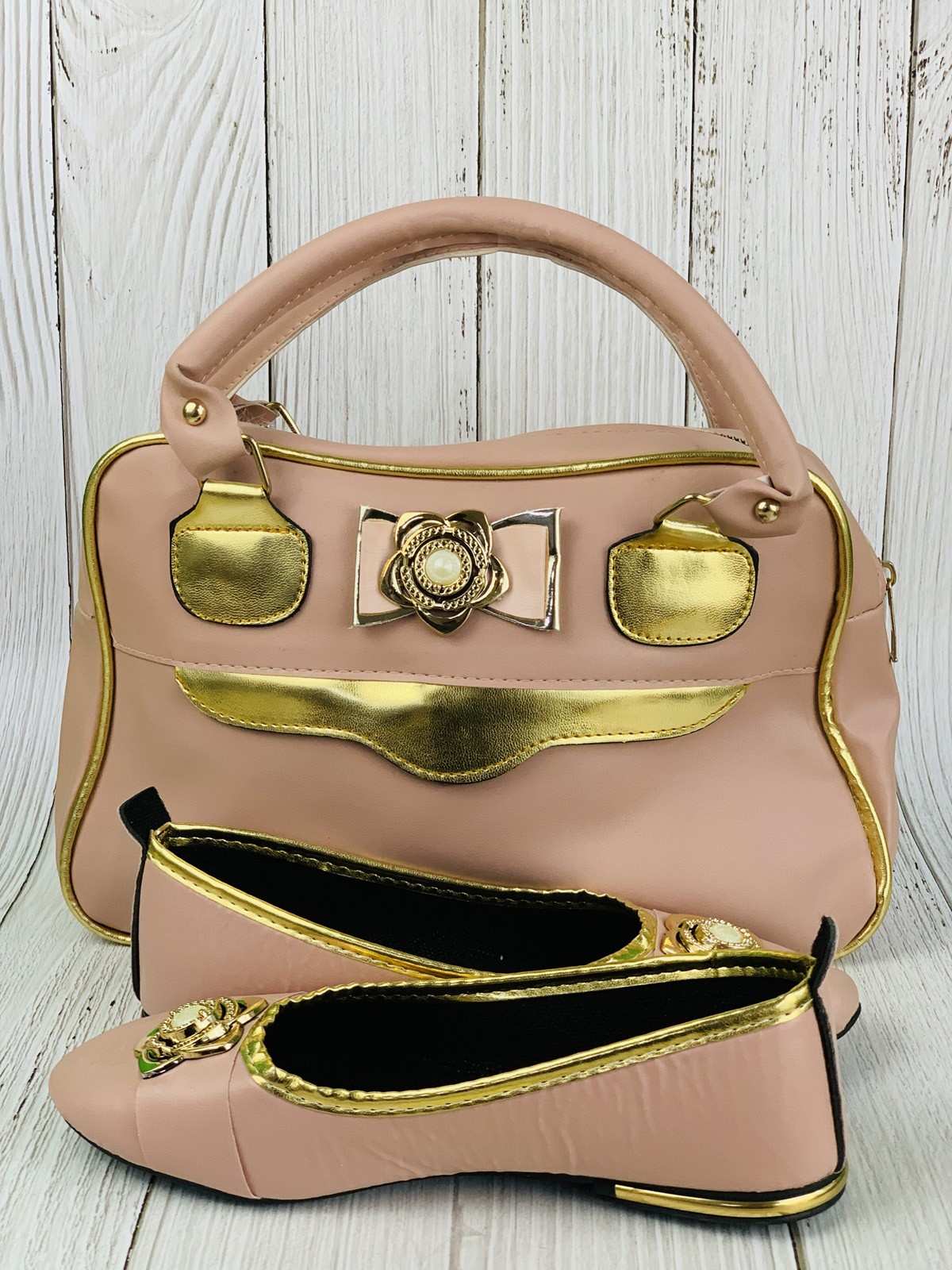 Pink bag and shoes with a decorative bow in the shape of a flower