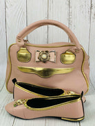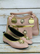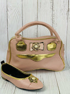 Women - Pink bag and shoes with a decorative bow in the shape of a flower