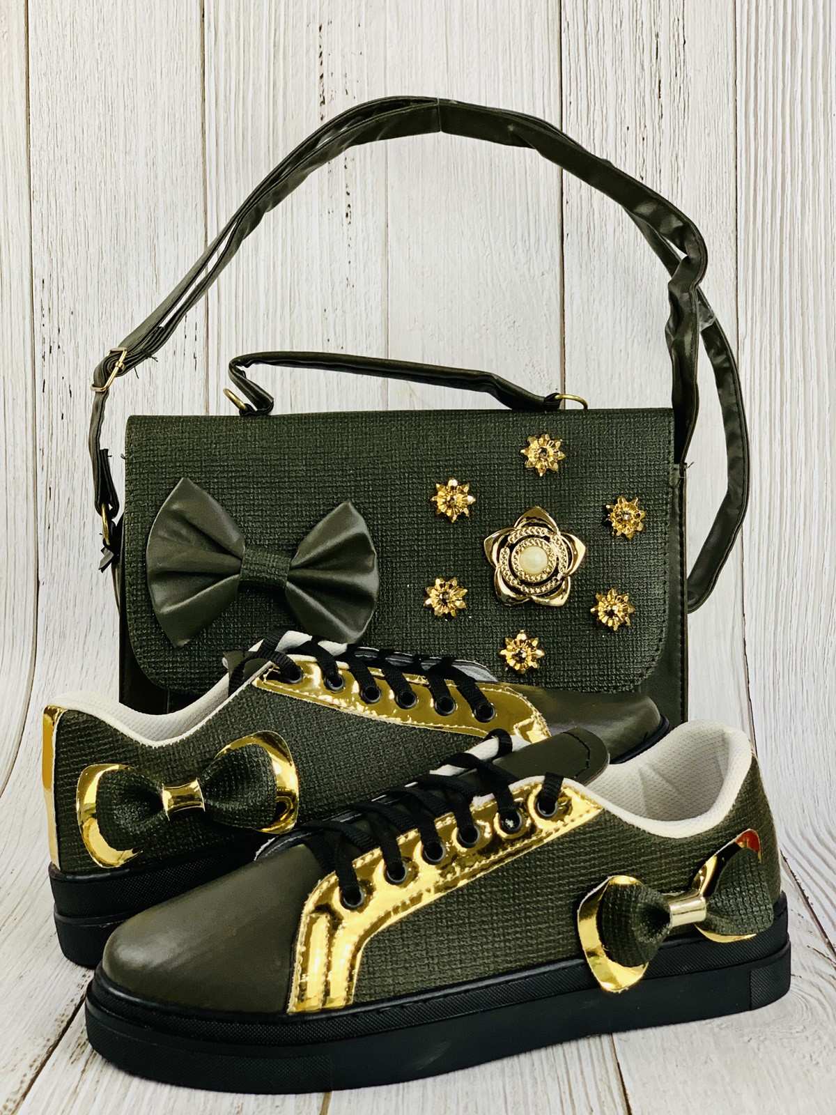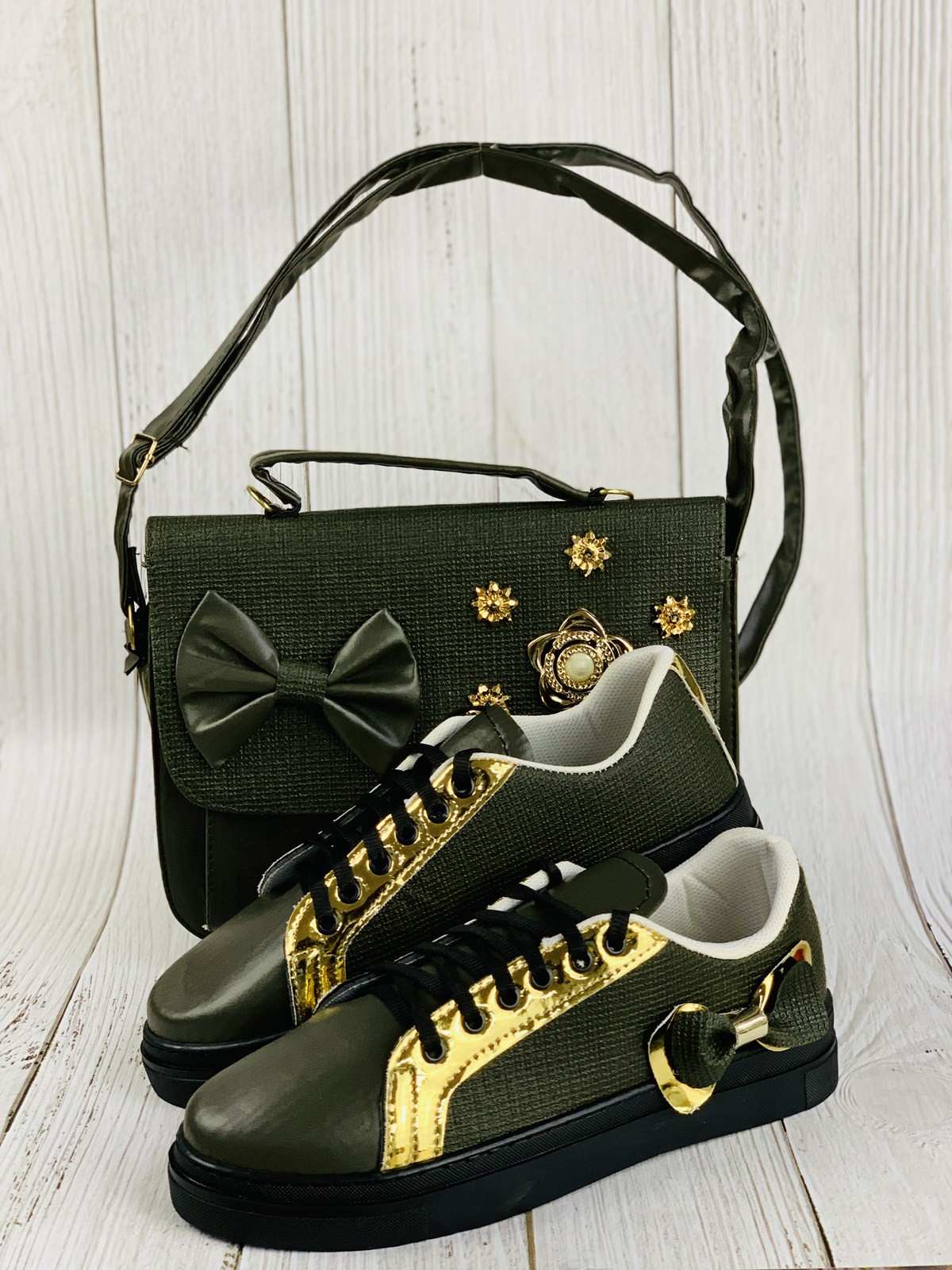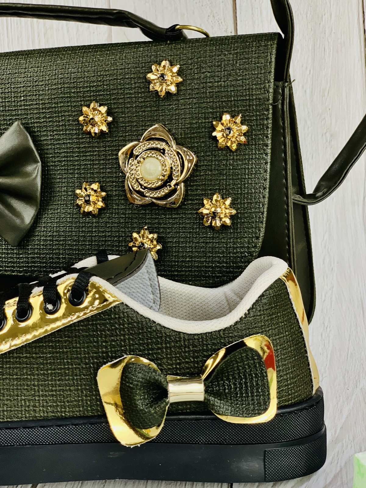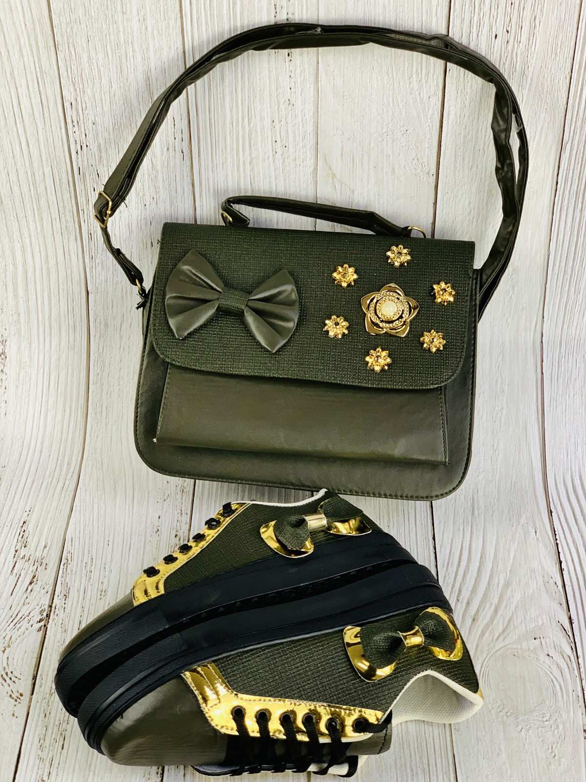 A bag, shoes and a purse, golden and olive, with a decorative knot in the form of a flower with fur