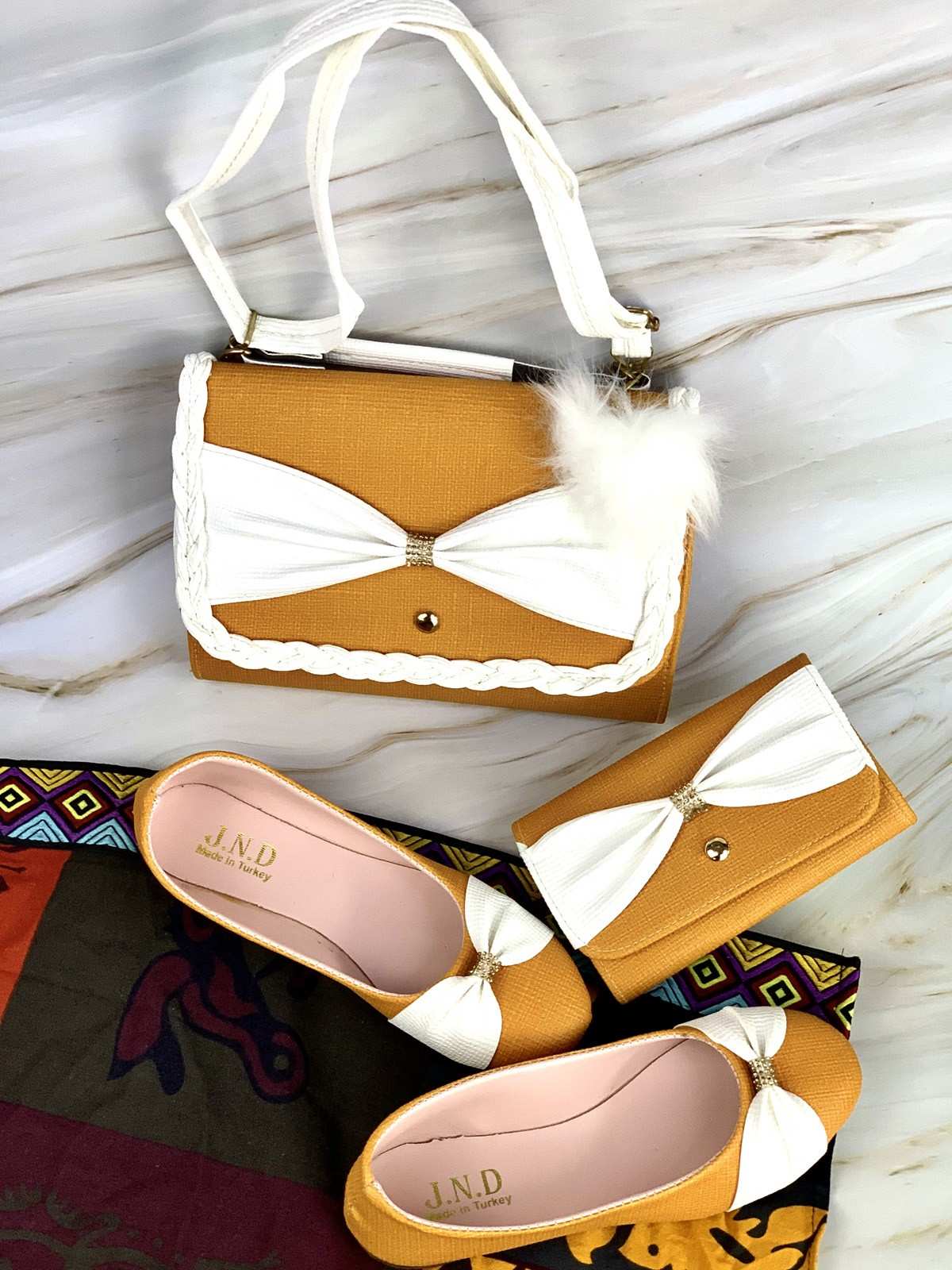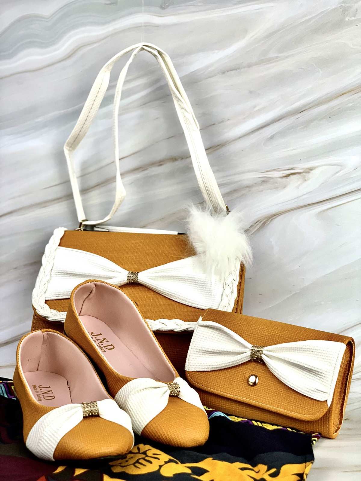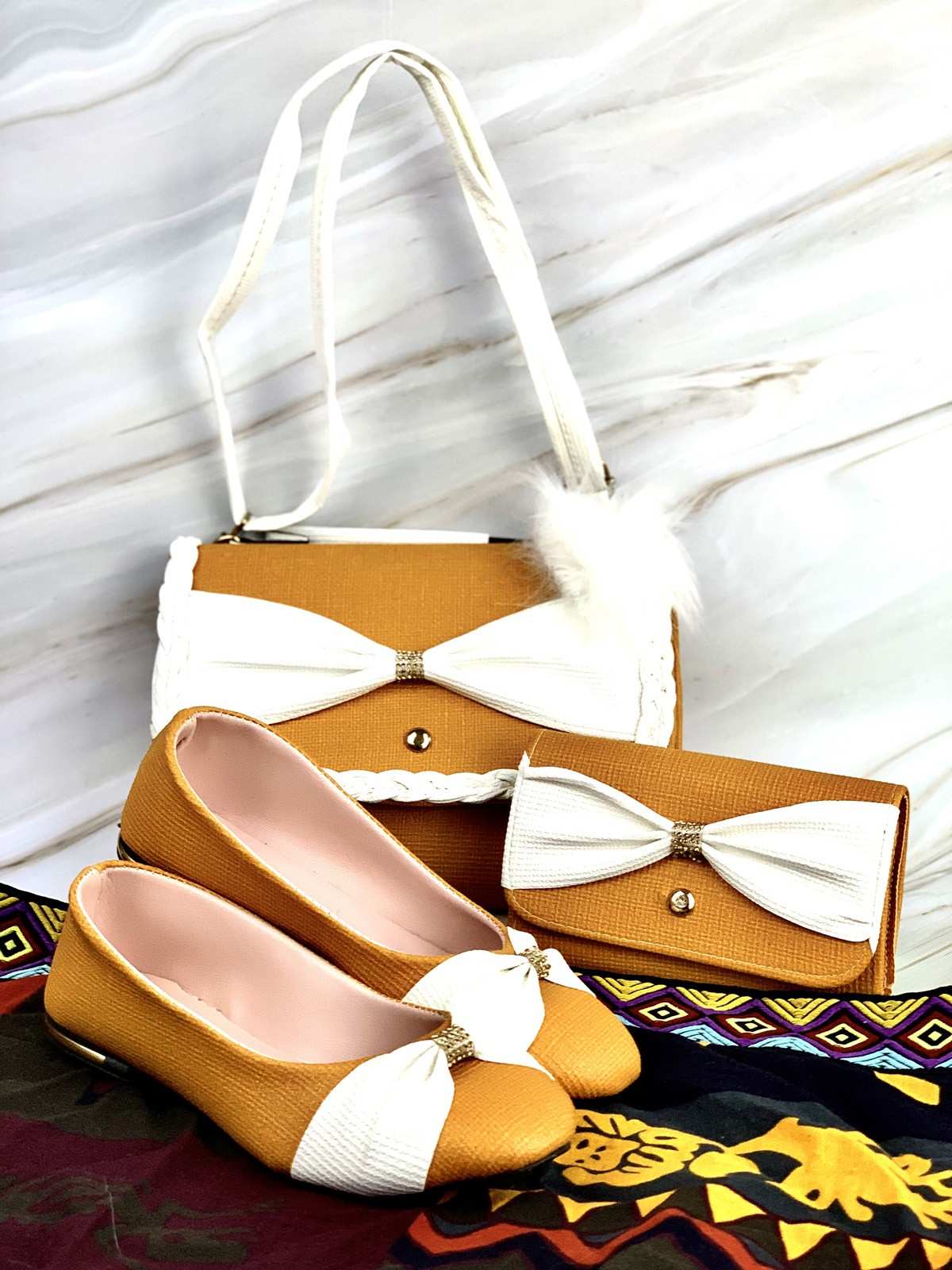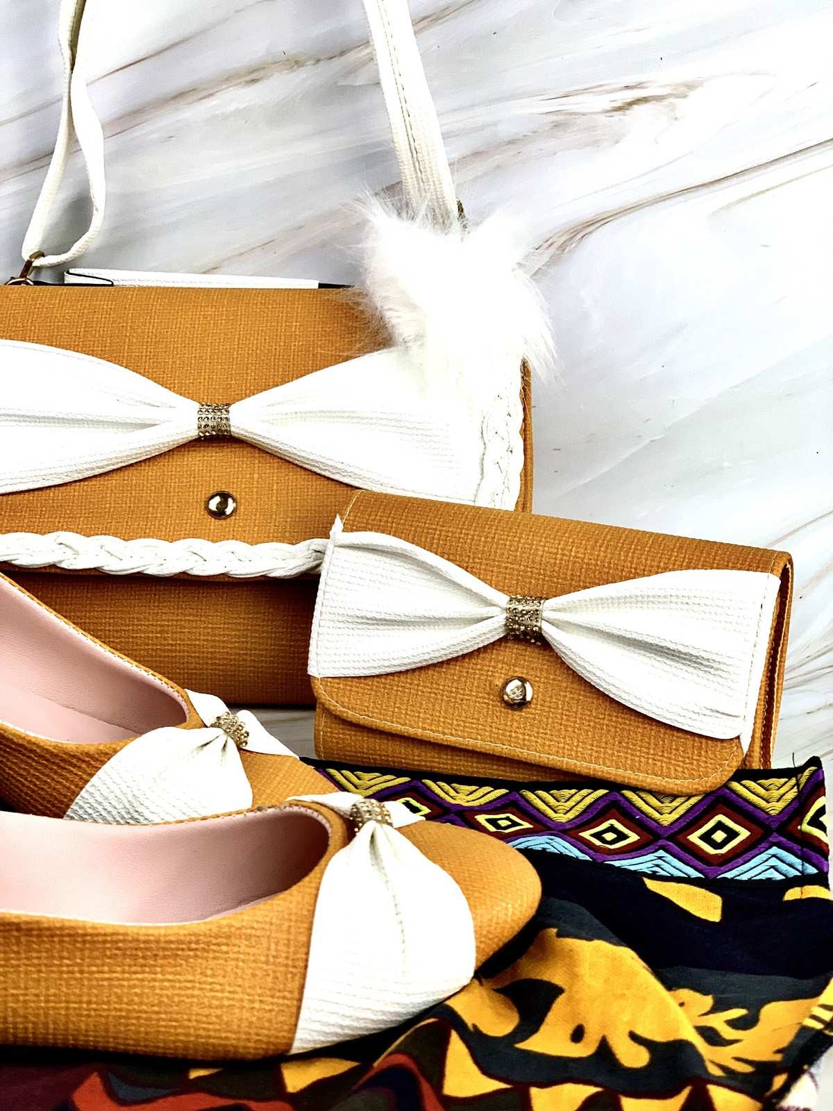A bag, shoes, and a white and honey purse with a decorative knot