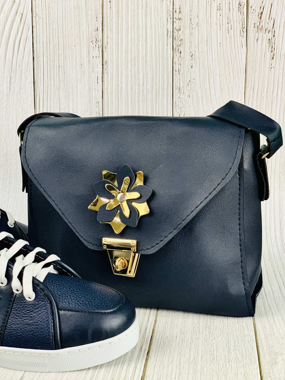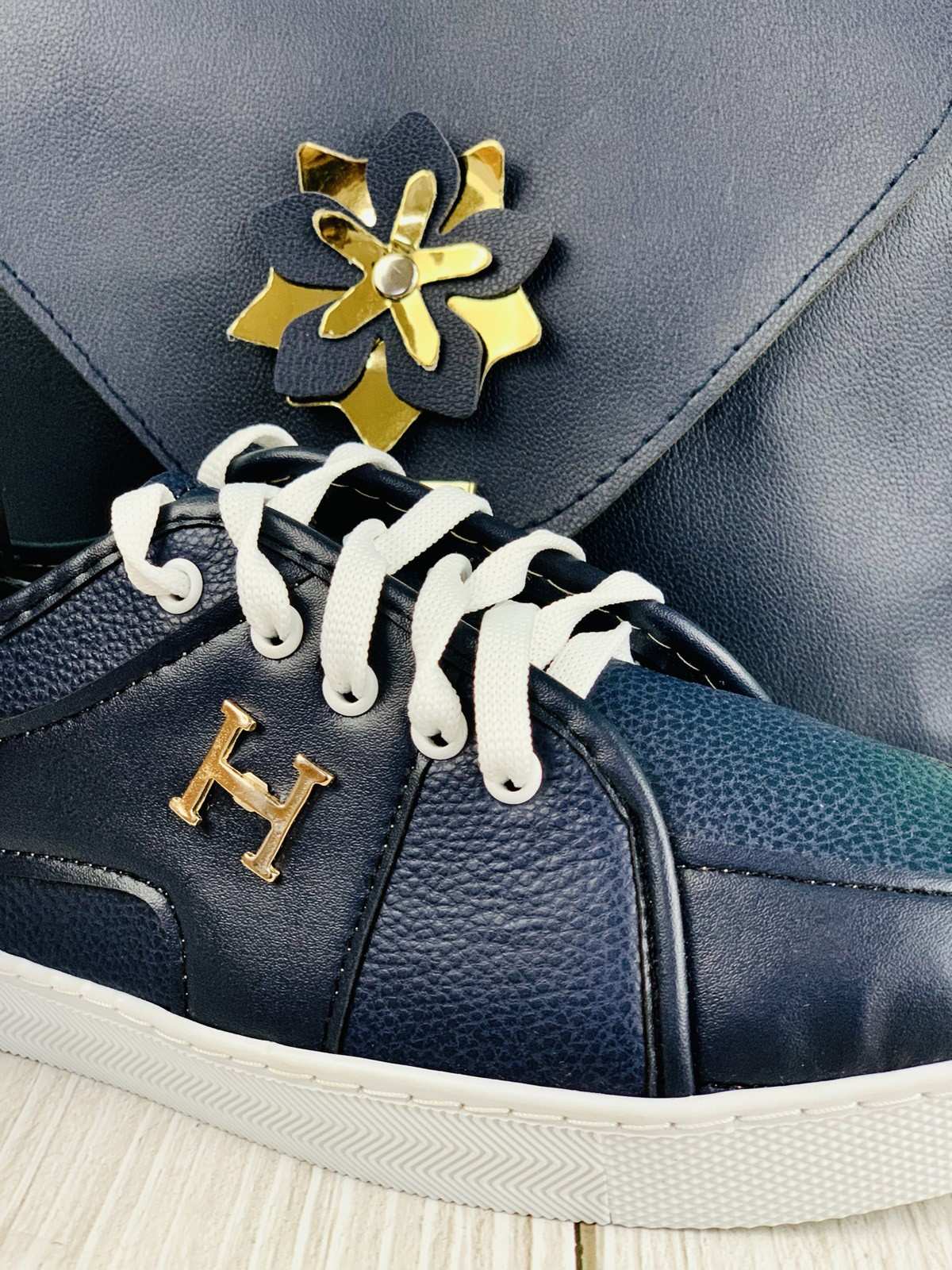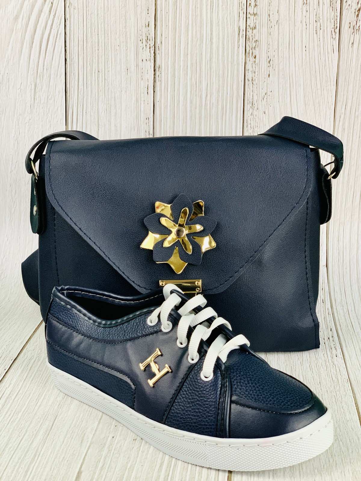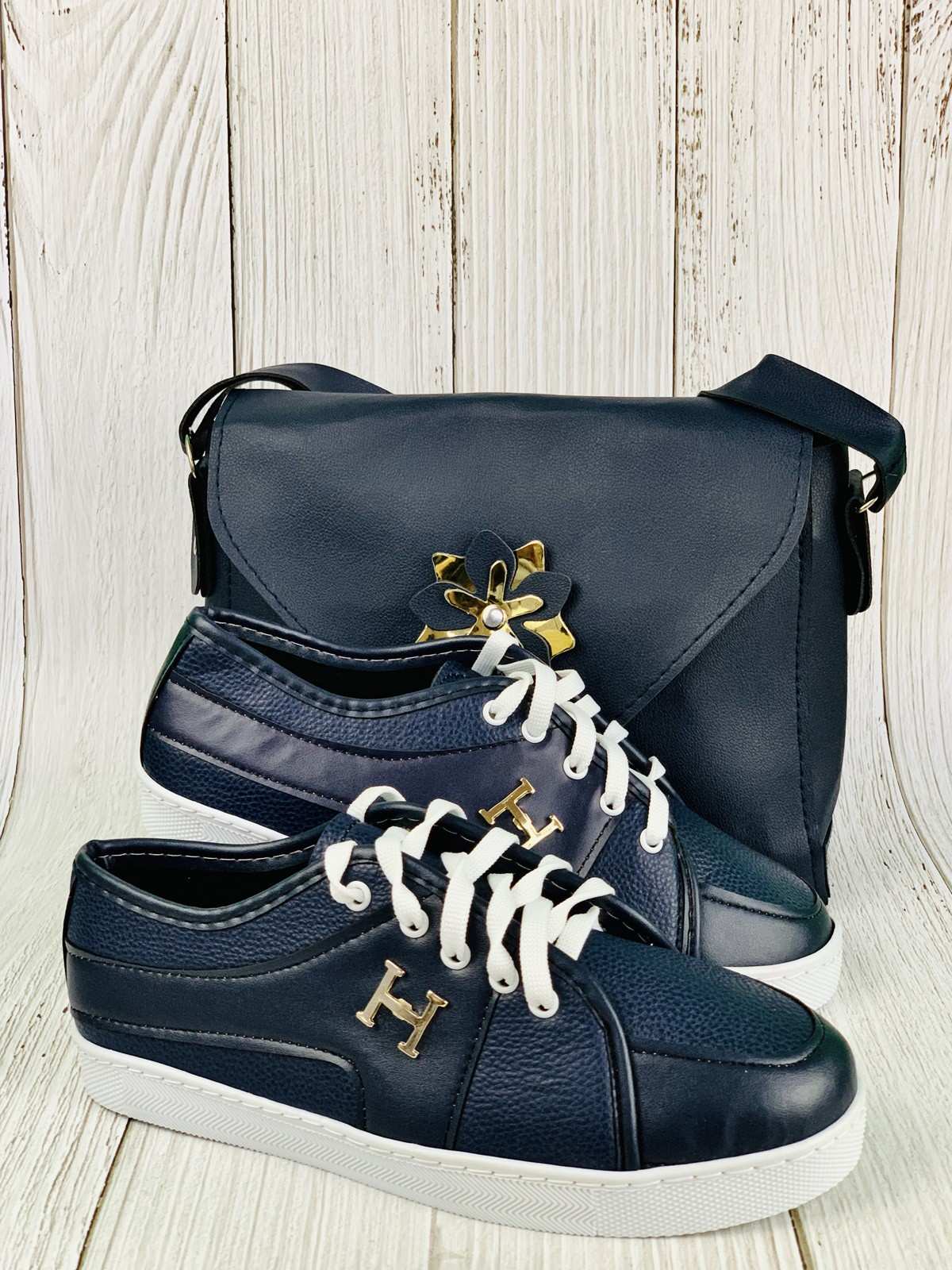 Navy bag and shoes with a decorative bow in the shape of a flower and the letter H