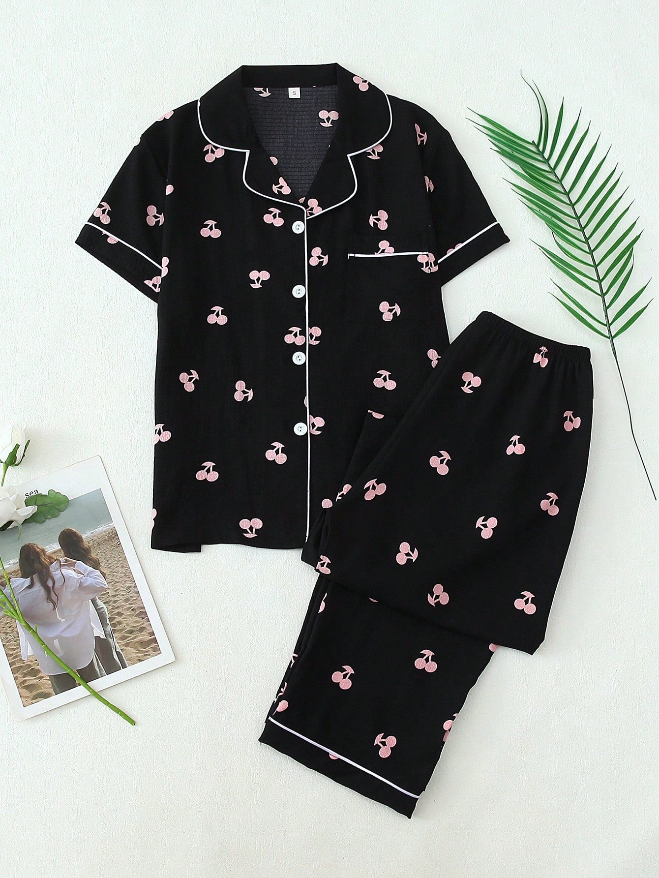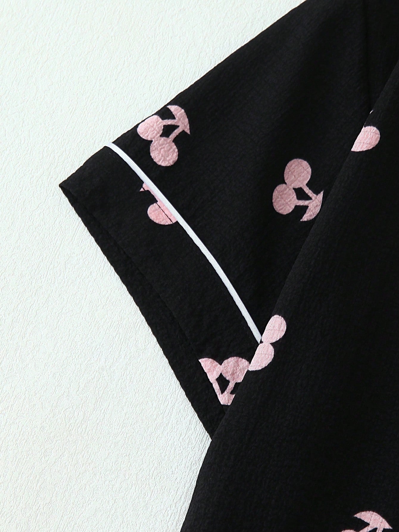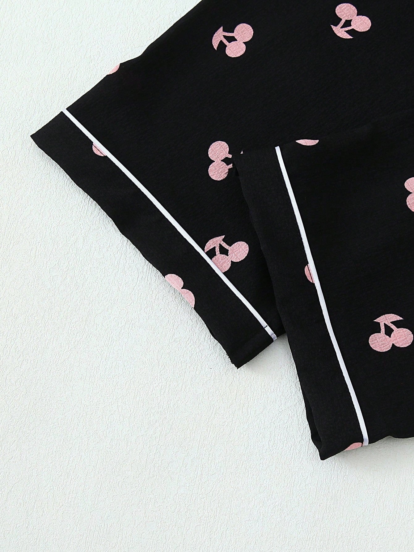 2 Pieces Cherry Print Short Sleeve Buttoned Top And Bow Shorts Pajama Set For Women, Suitable For Home