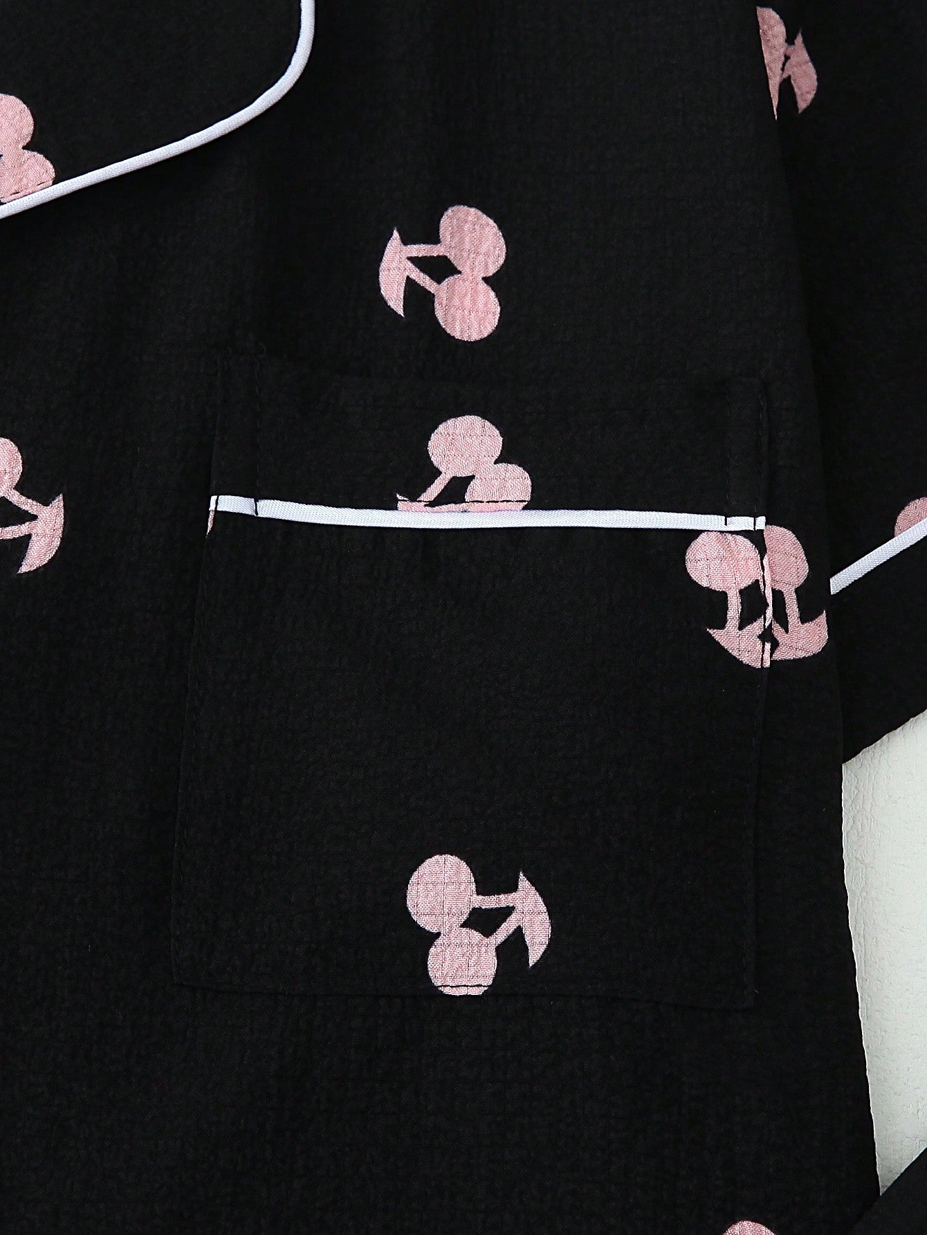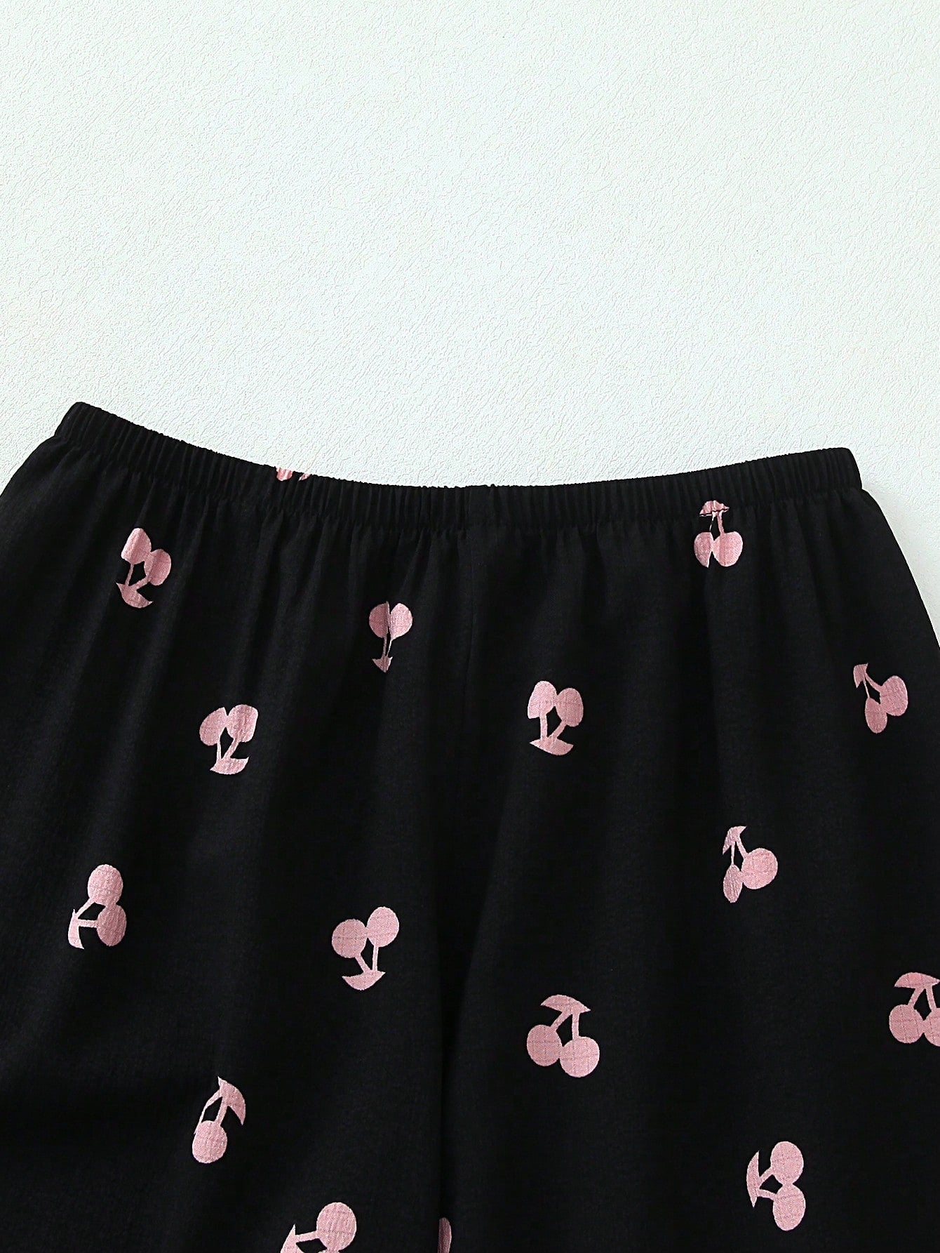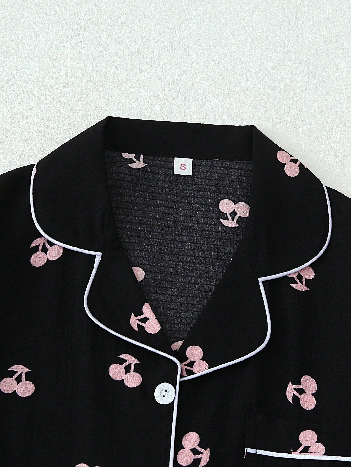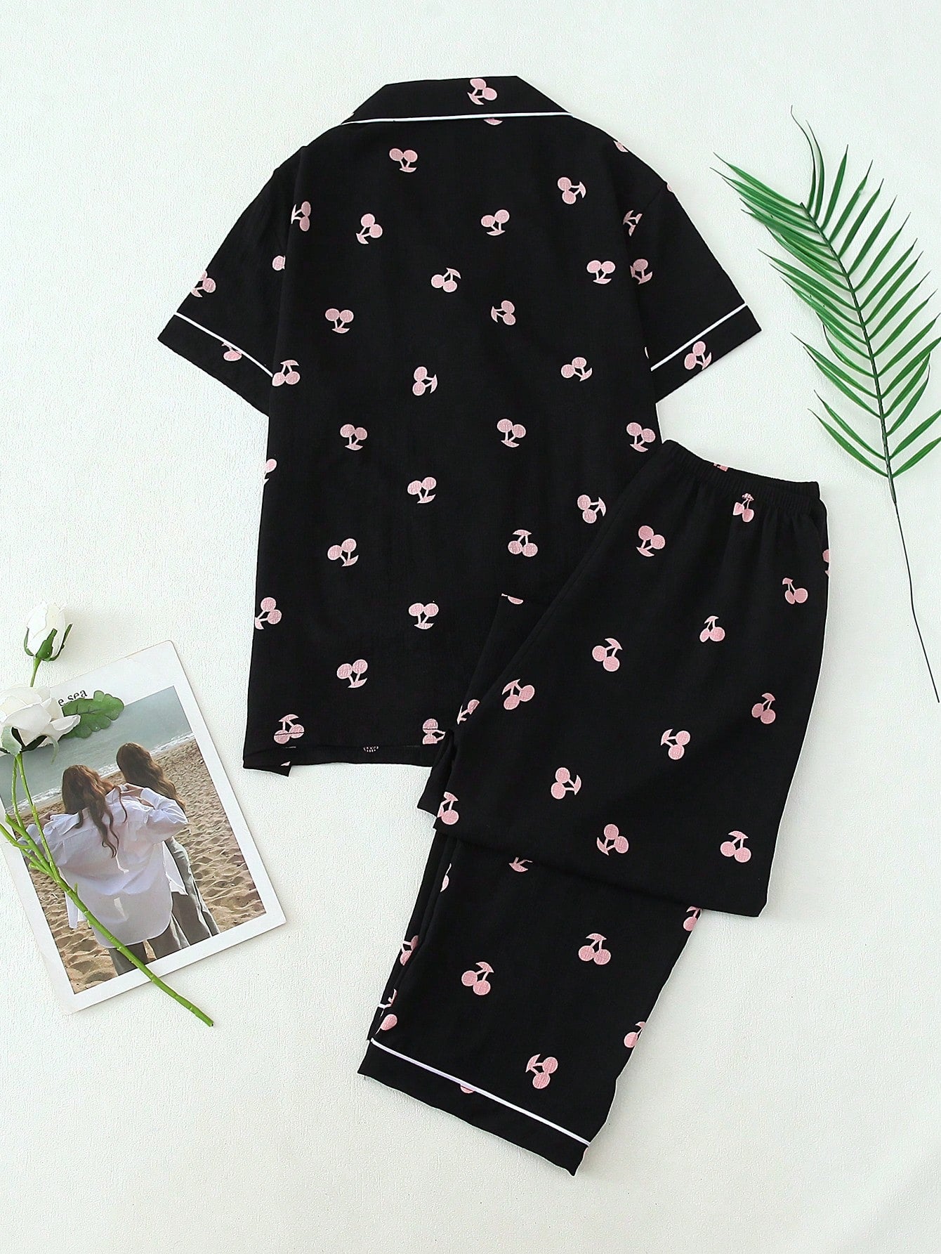 2 Pieces Cherry Print Short Sleeve Buttoned Top And Bow Shorts Pajama Set For Women, Suitable For Home