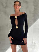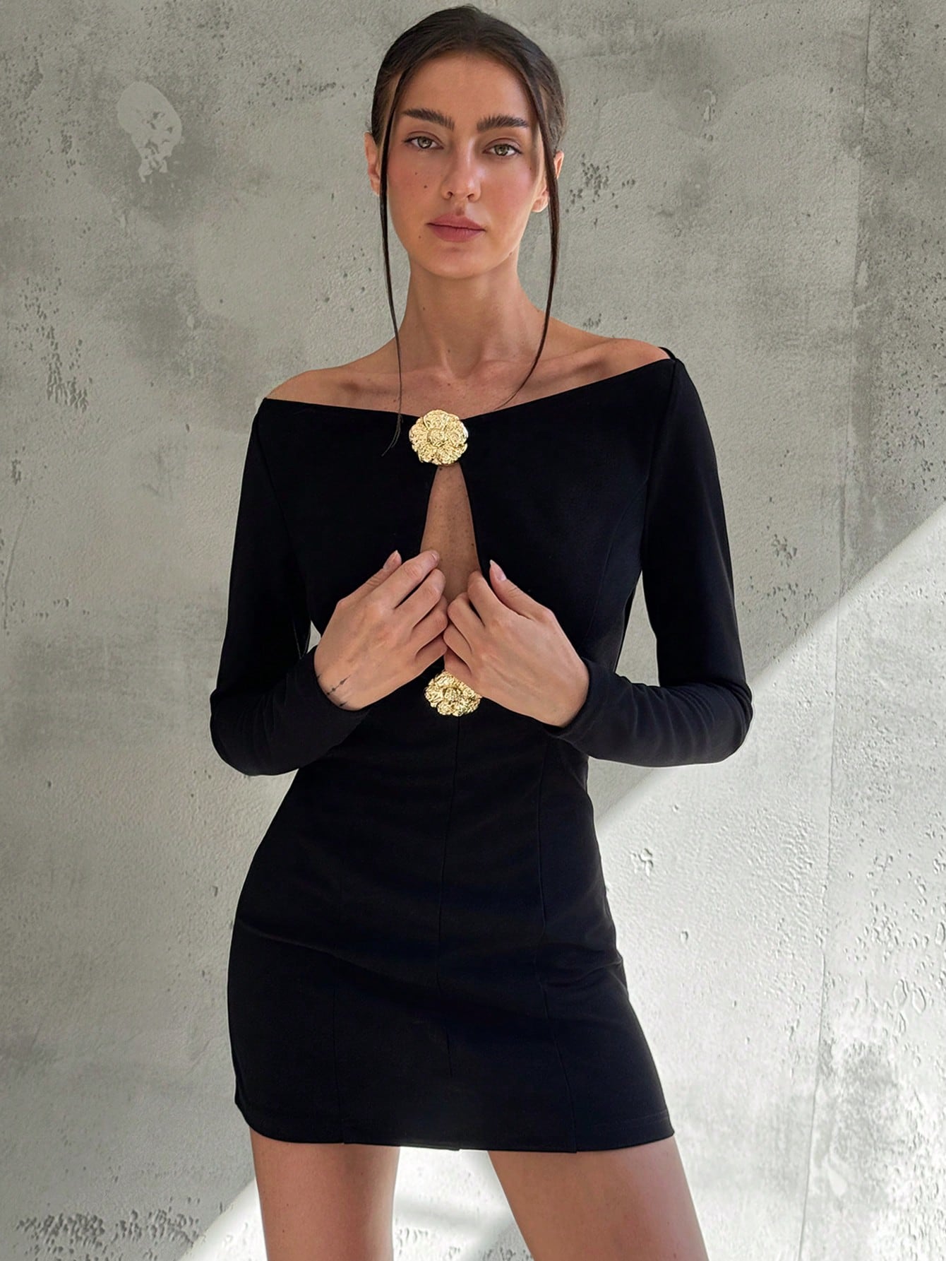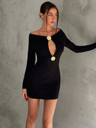 Aloruh New Autumn-Winter Metal Buckle Decor Sexy Hollow Out Black Long Sleeve Short Dress
