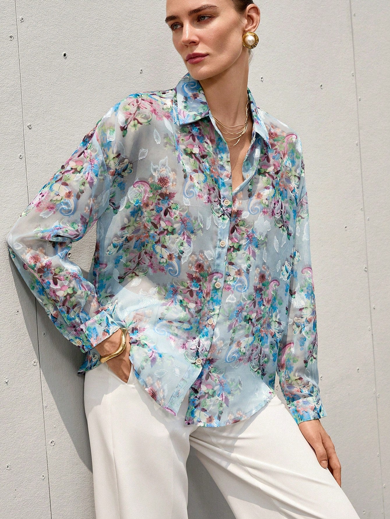 Aveloria Modichic French Romantic Floral 3D Print Lapel Collar Sheer Long Sleeve Shirt For Women