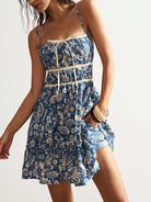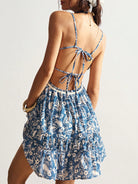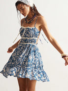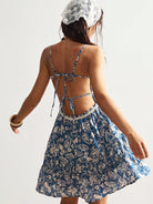 women Bohemela Summer Boho Blue & White Floral Casual Vacation Woven Print Open Back Mini Dress For Women