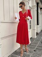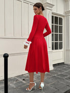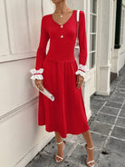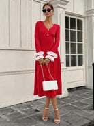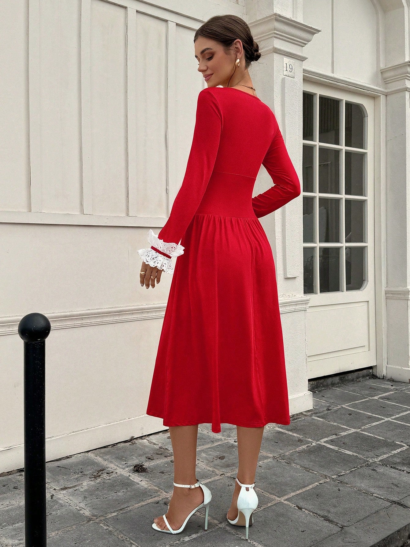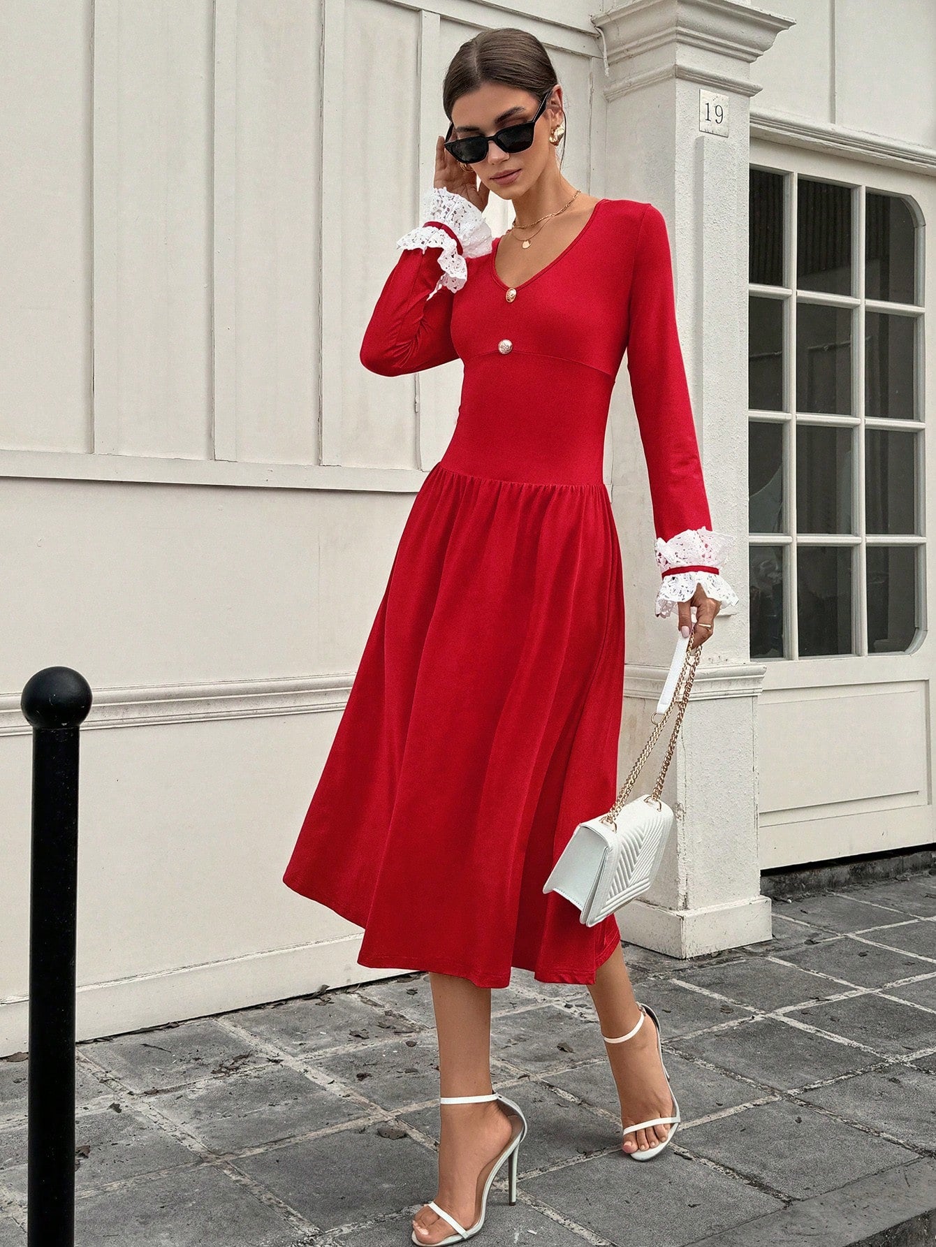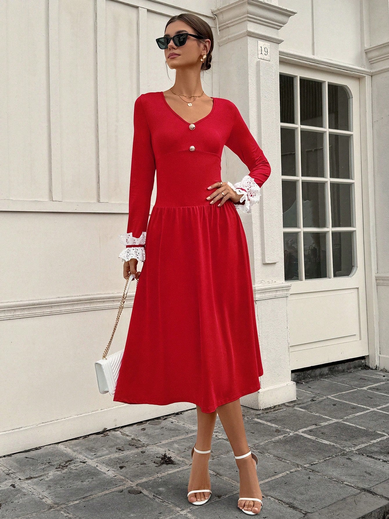 women Chiquease Women's V-Neck Long Sleeve Floral Lace Patchwork A-Line Elegant Dress