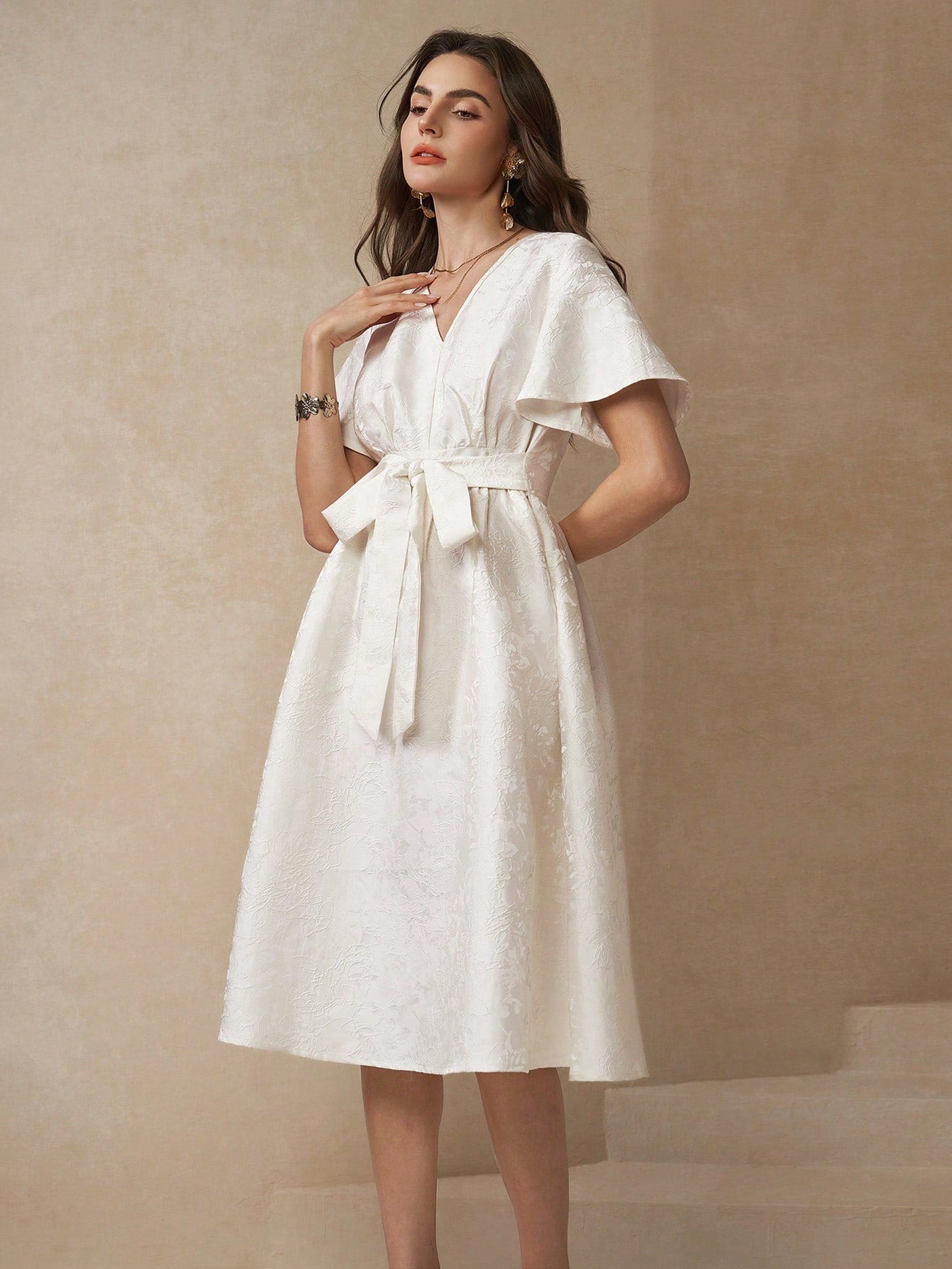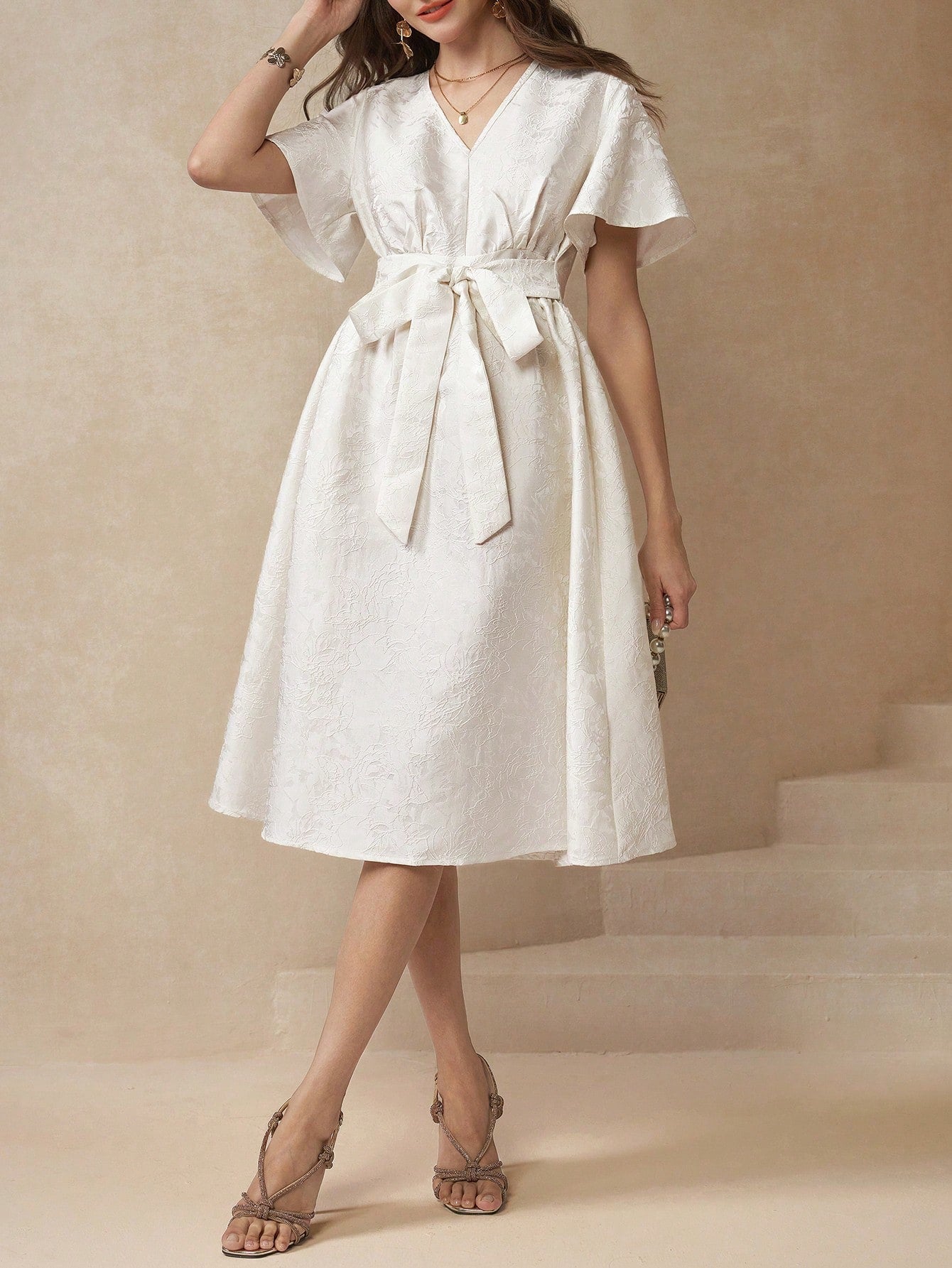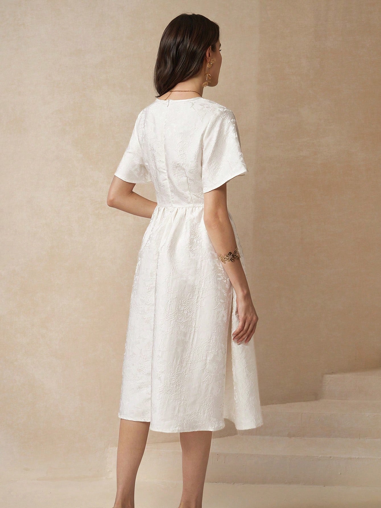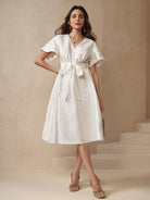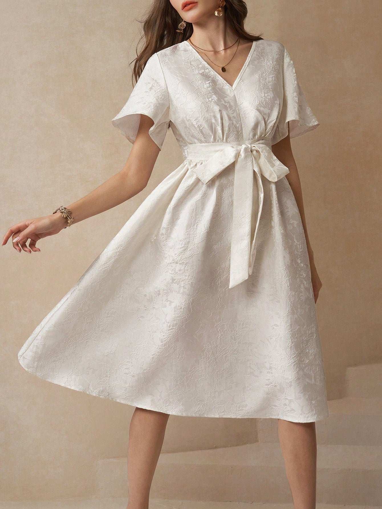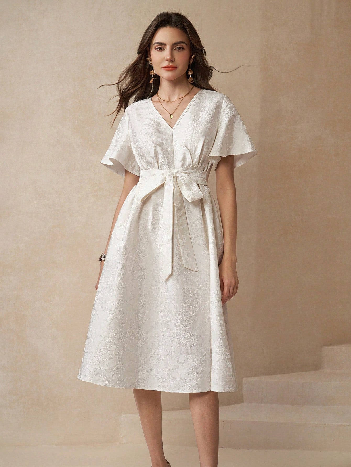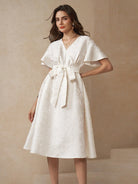 Clasi Women V-Neck Short Sleeve Tie-Bow A-Line Embroidery White Elegant Everyday Casual & Social Midi