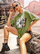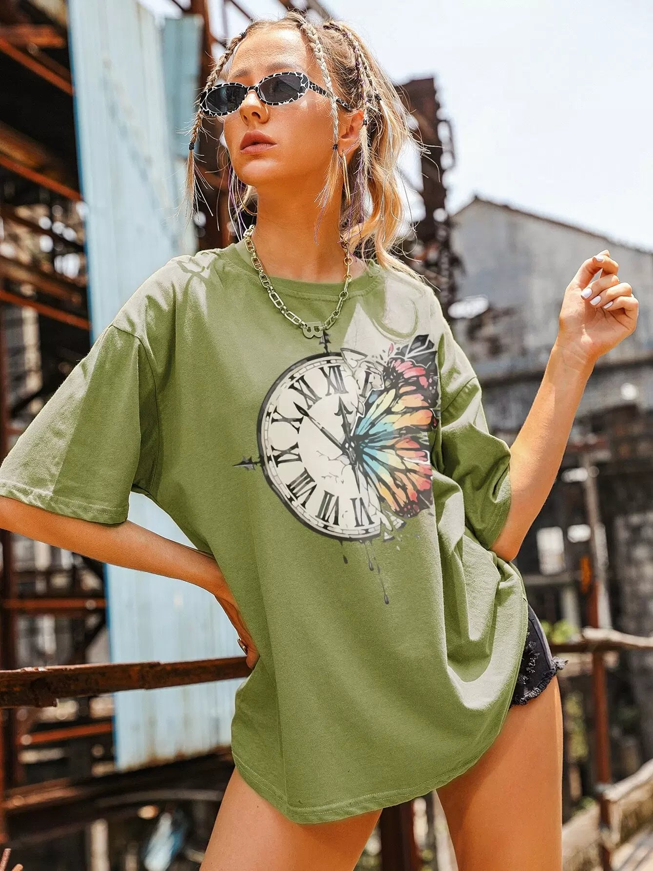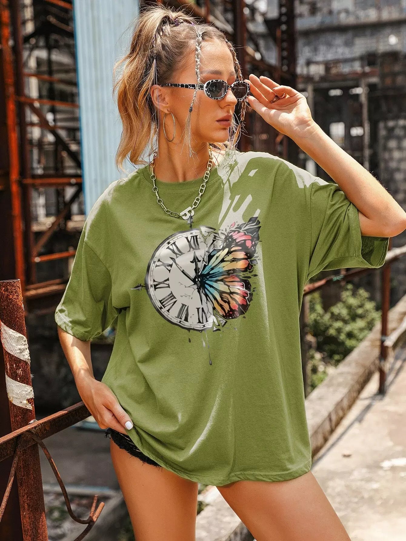 Women - Clock & Butterfly Graphic Drop Shoulder Oversized Tee