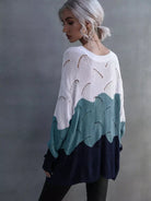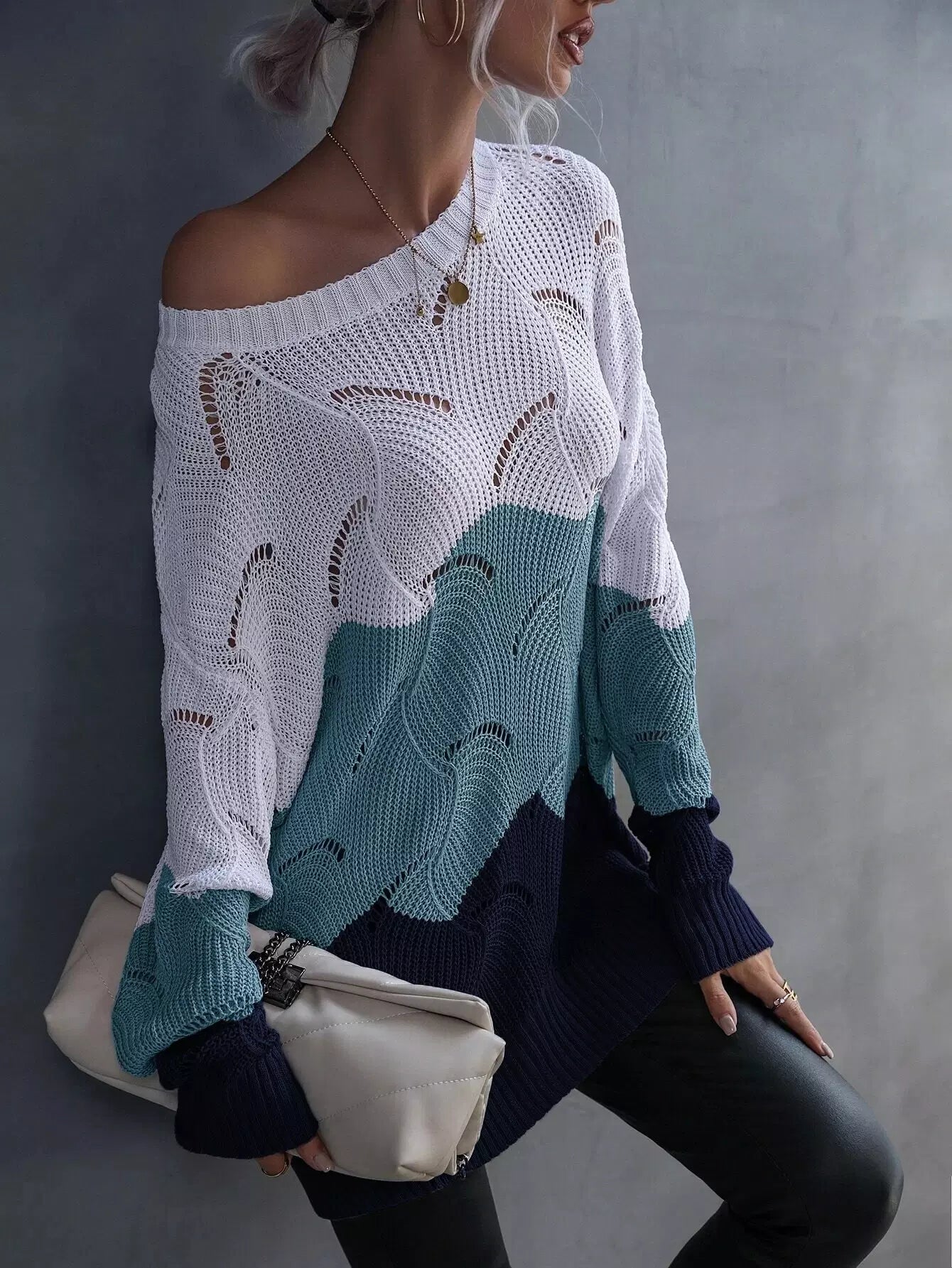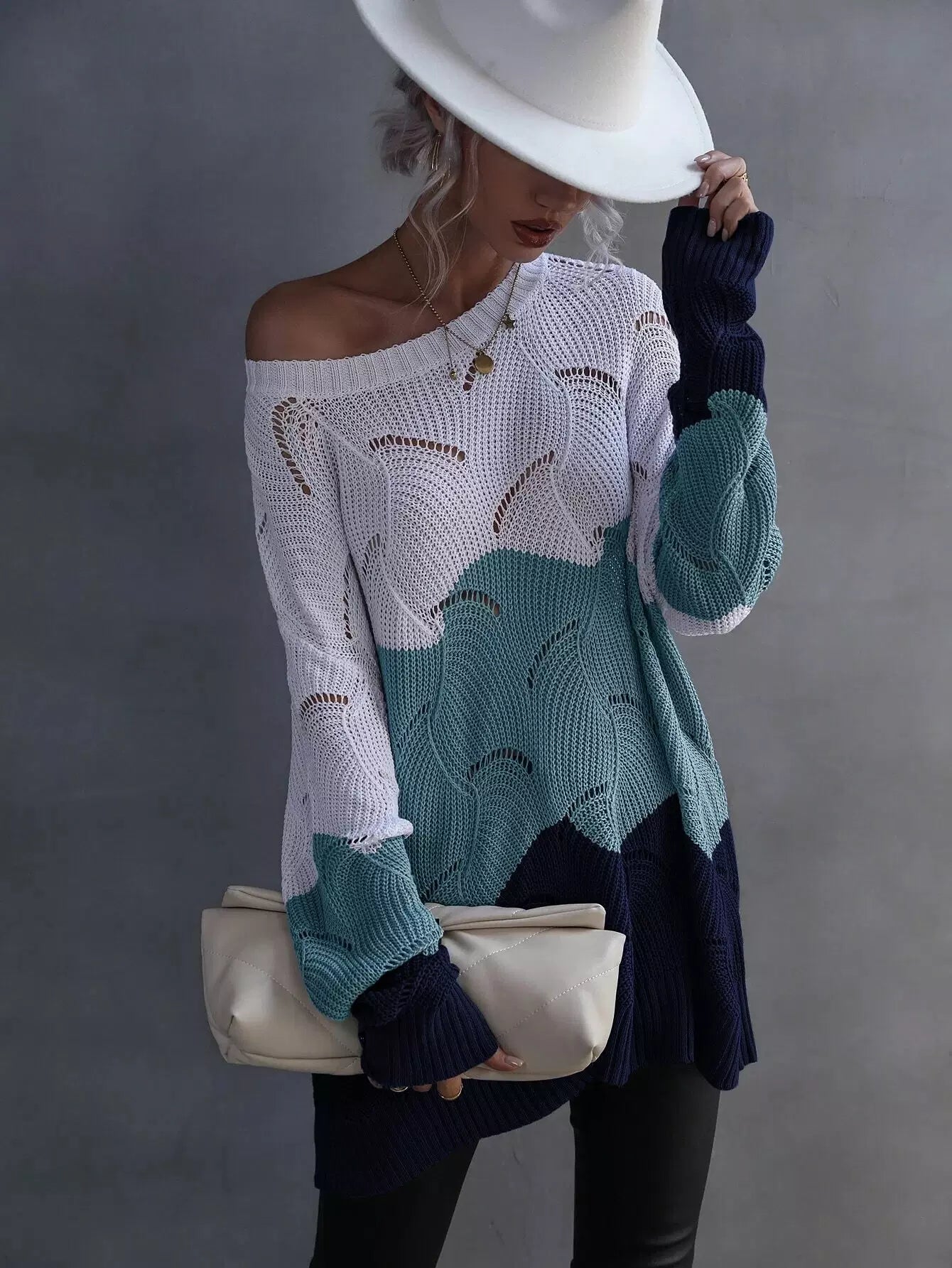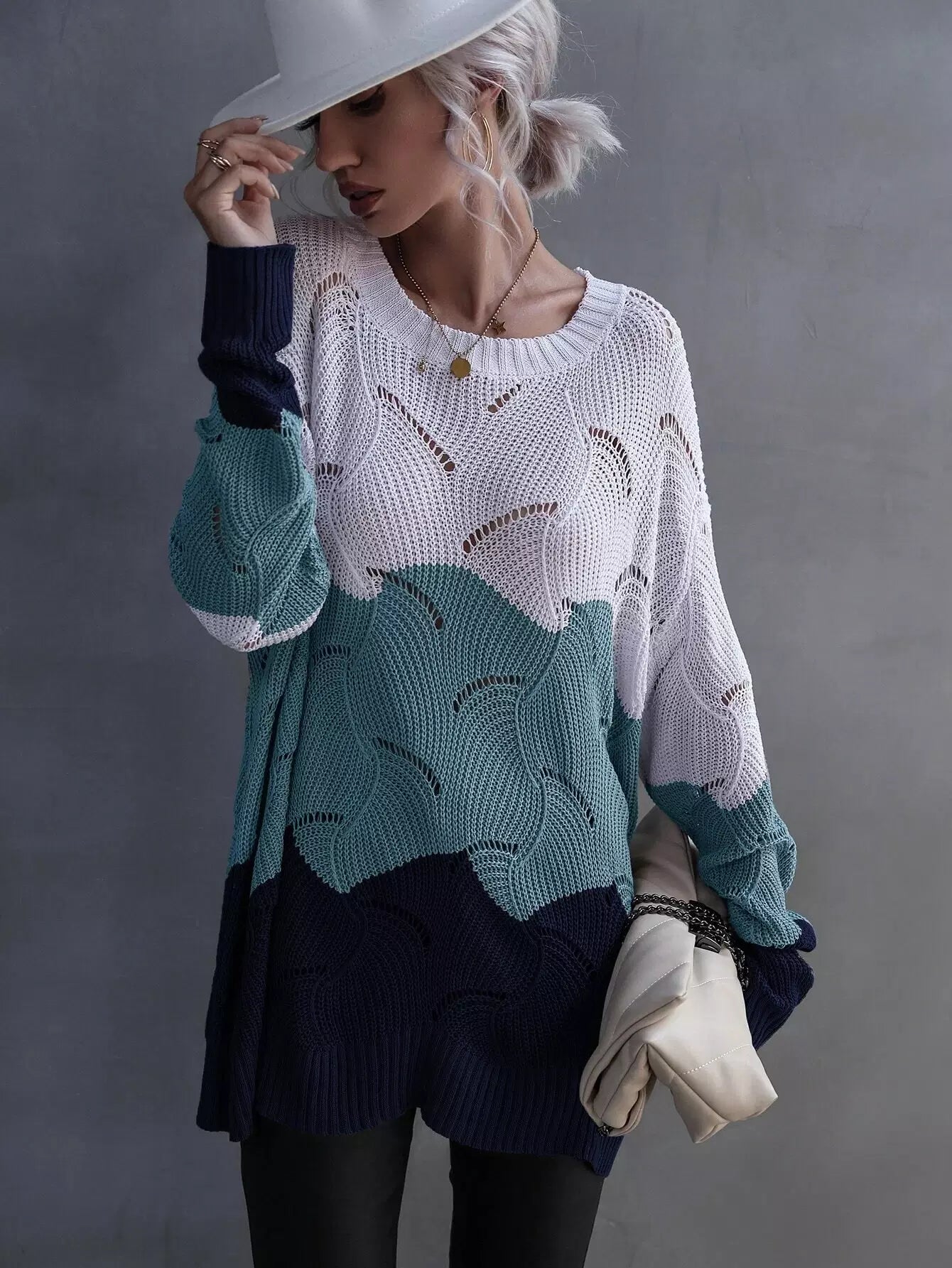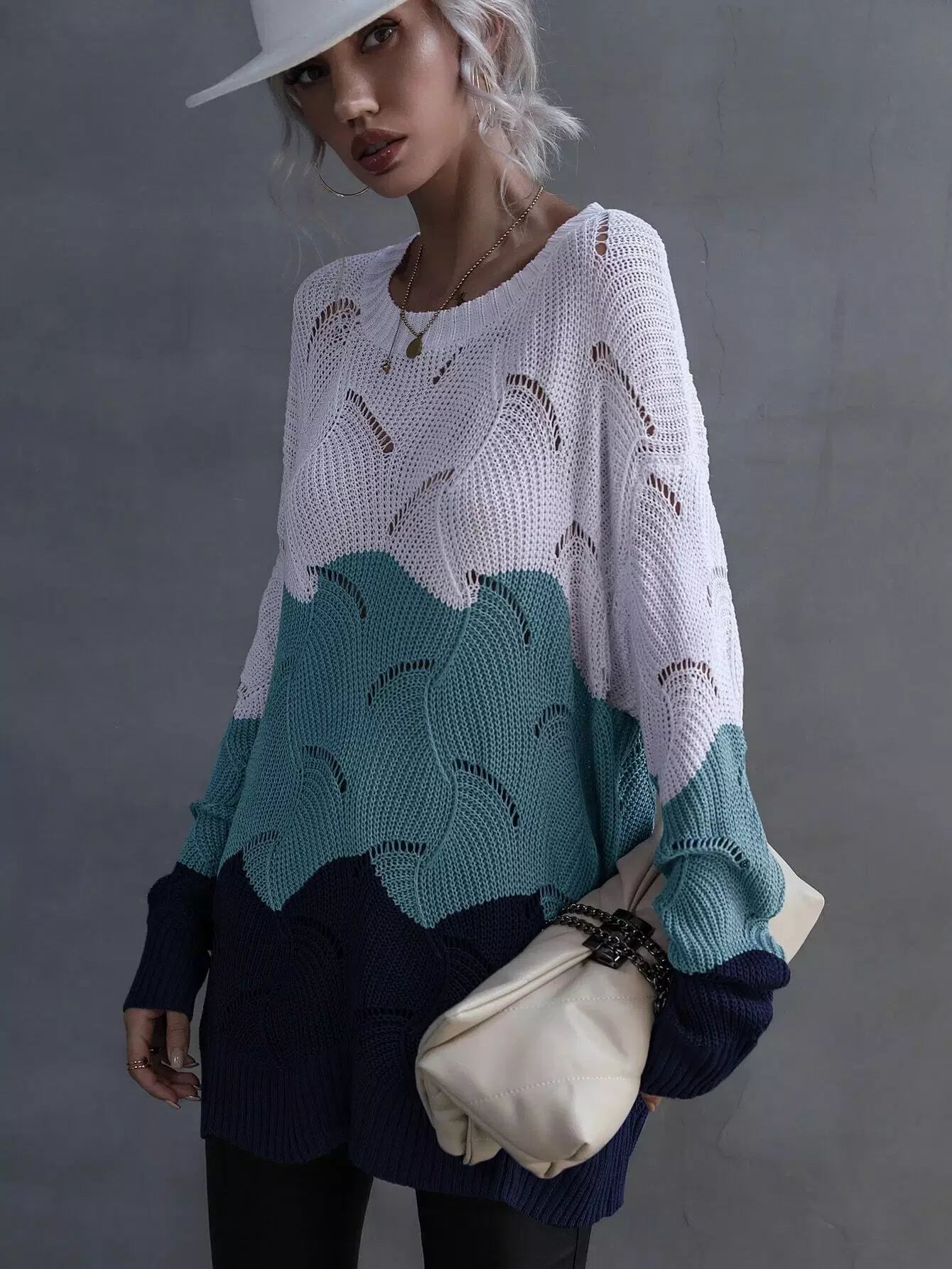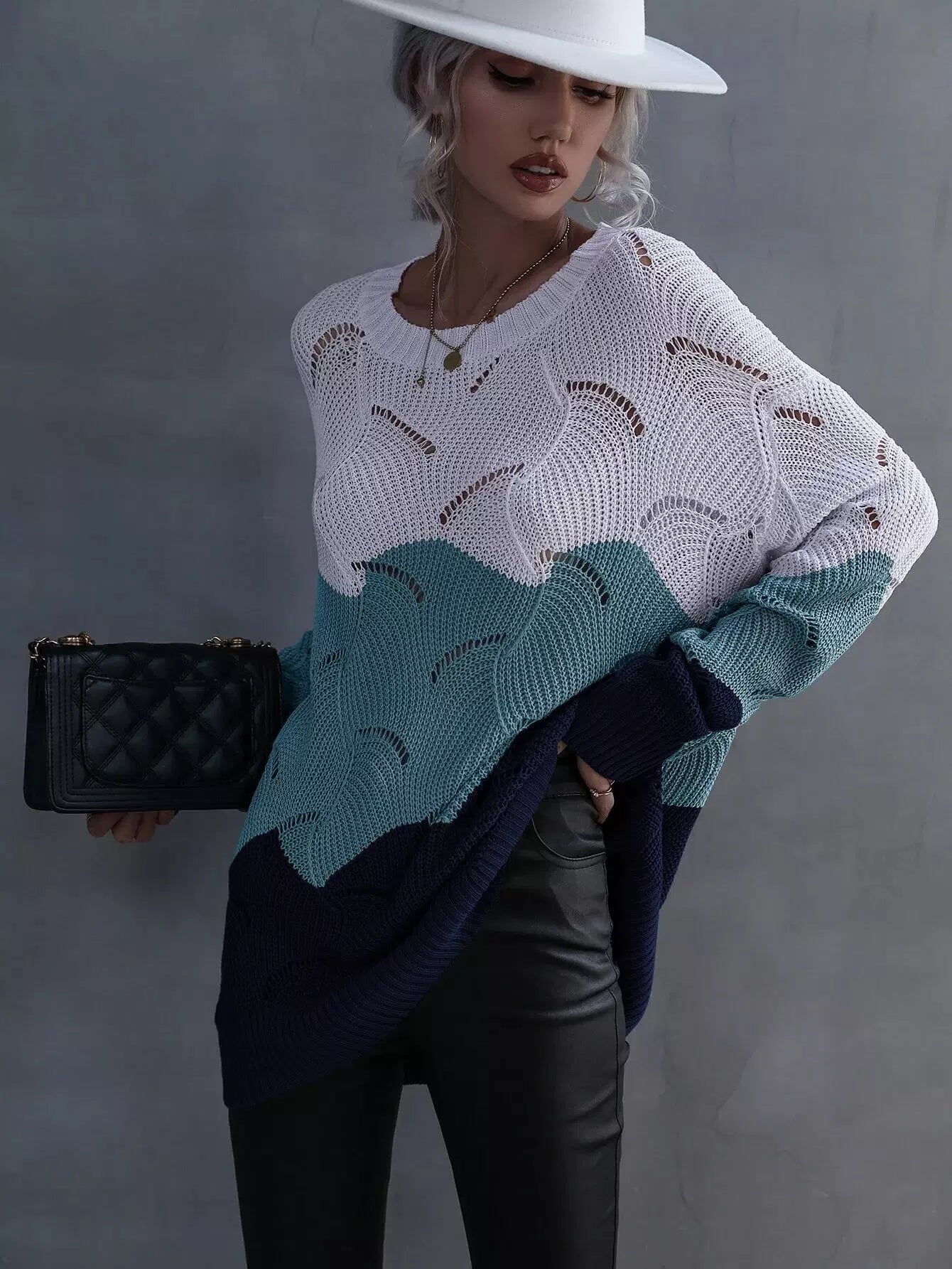 Color Block Pointelle Knit Drop Shoulder Sweater