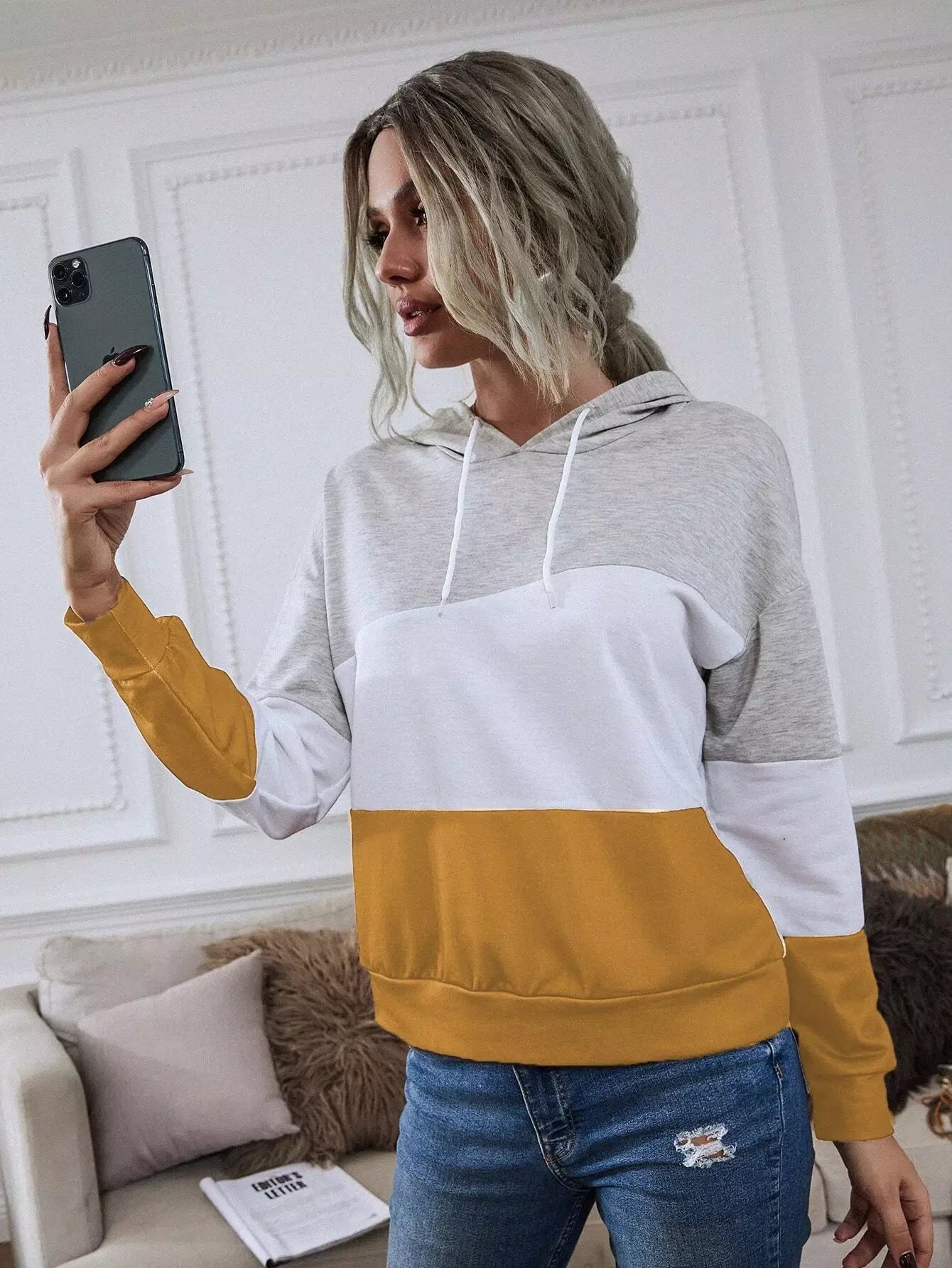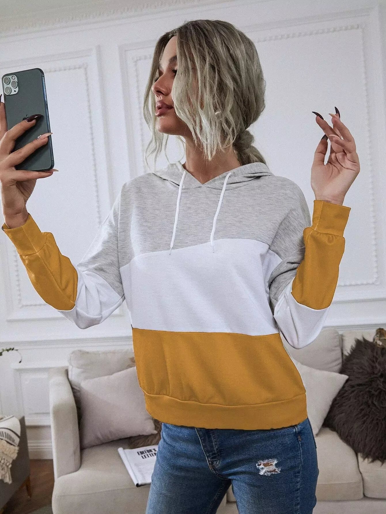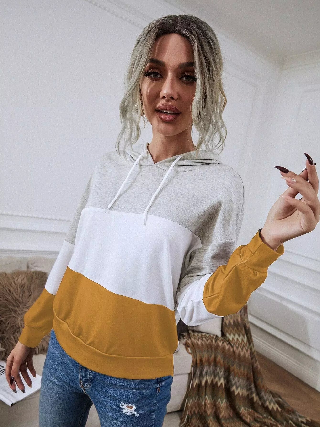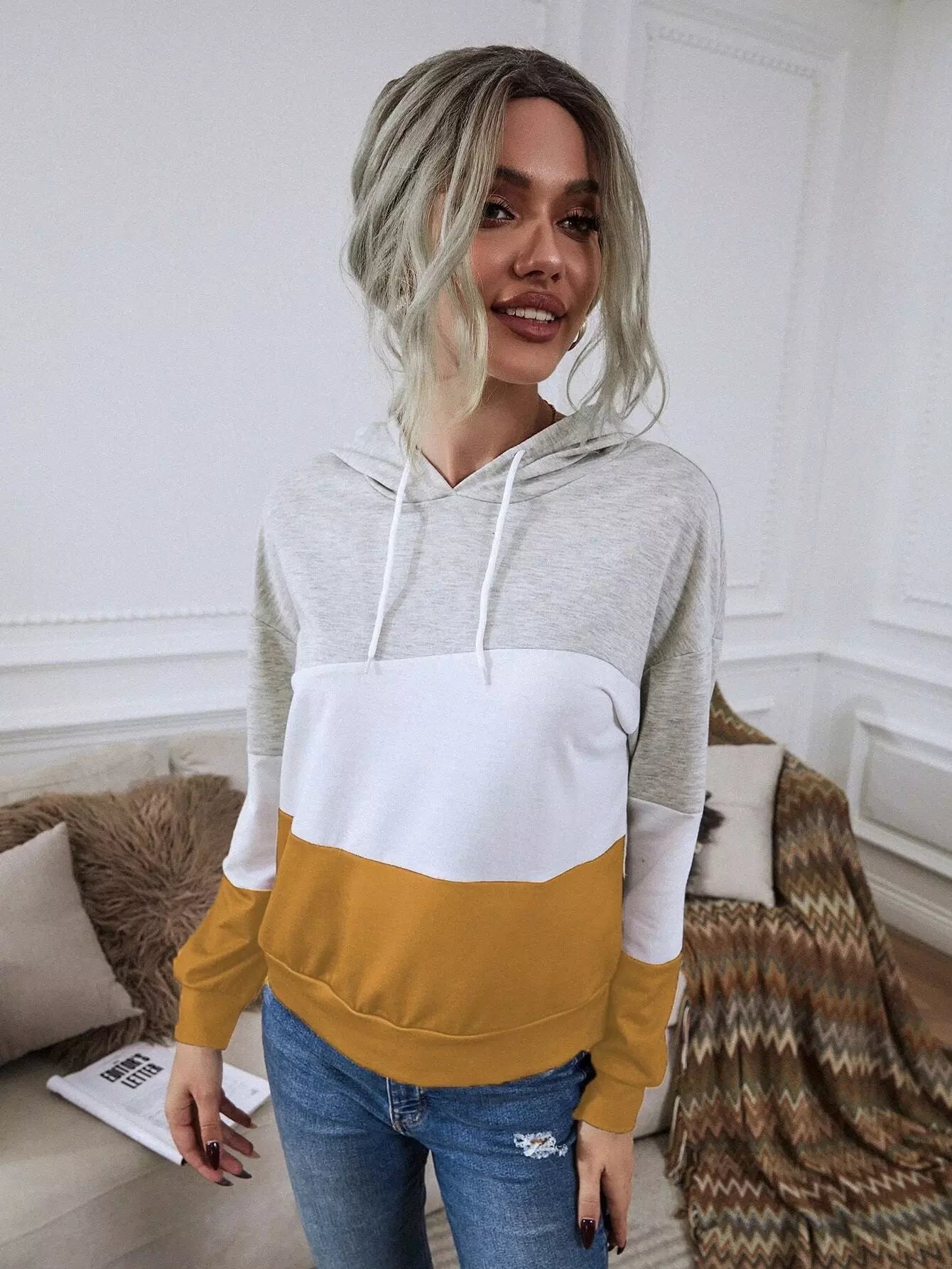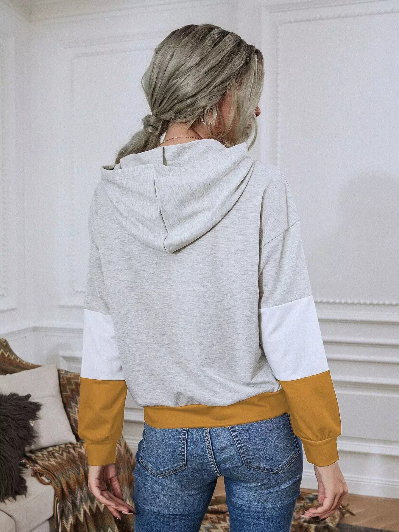 Colorblock Drop Shoulder Drawstring Hoodie