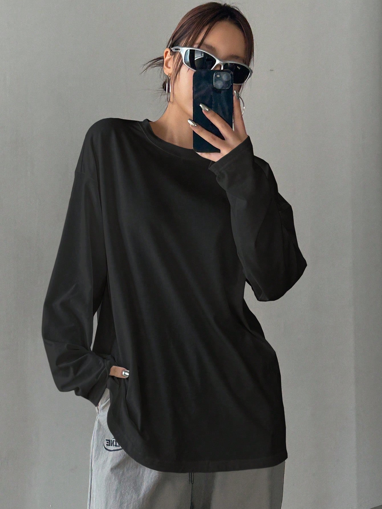 DAZY Solid Color Round Neck Loose-Fit Long Sleeve T-Shirt, Long Length,Fall Clothes