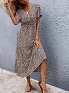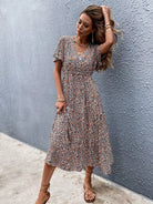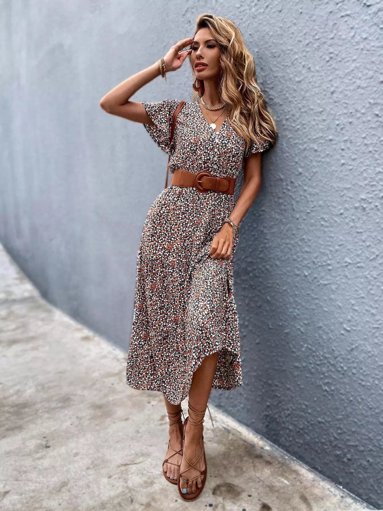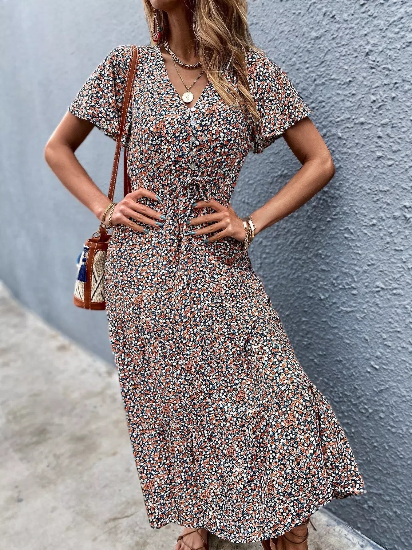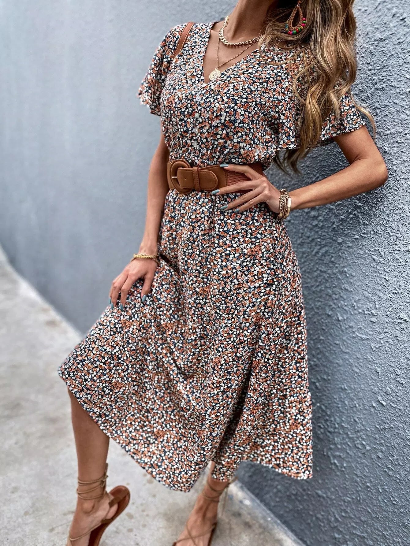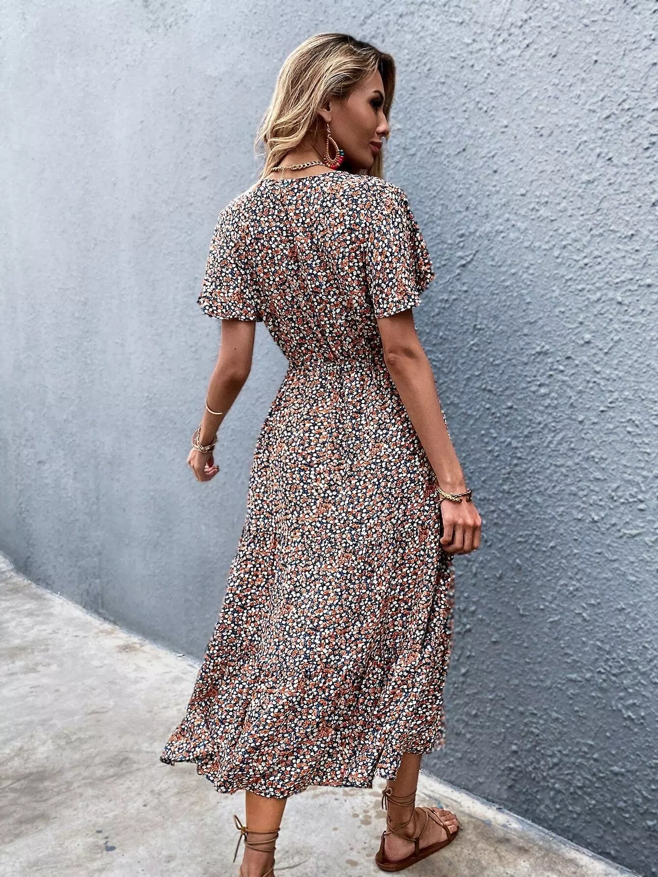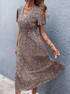 Ditsy Floral Flutter Sleeve Drawstring Dress Without Belt