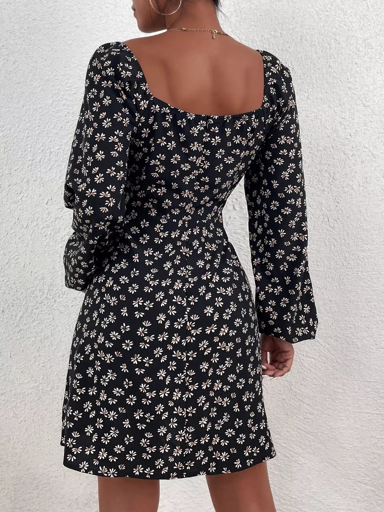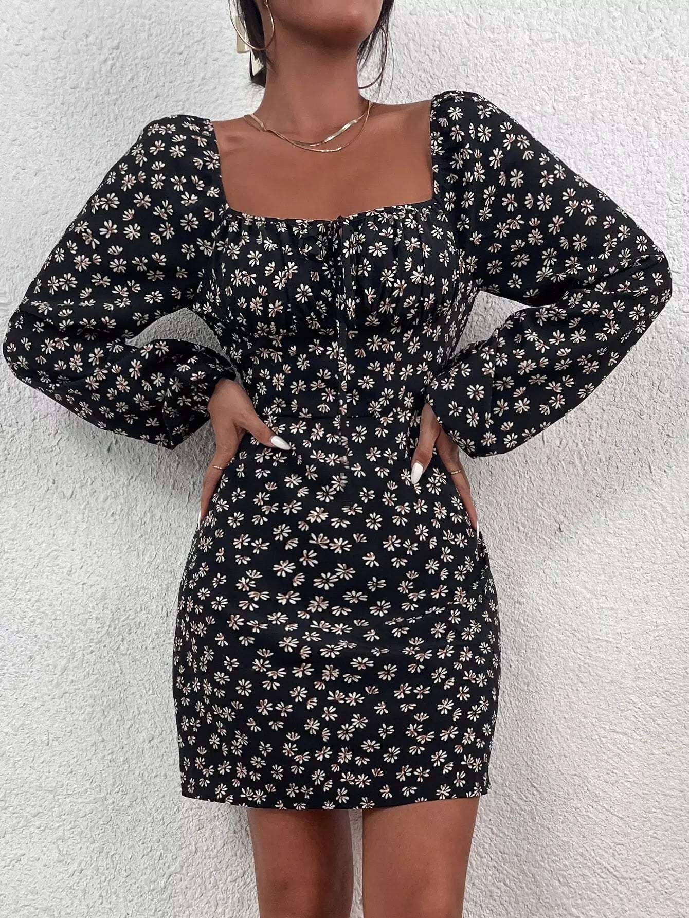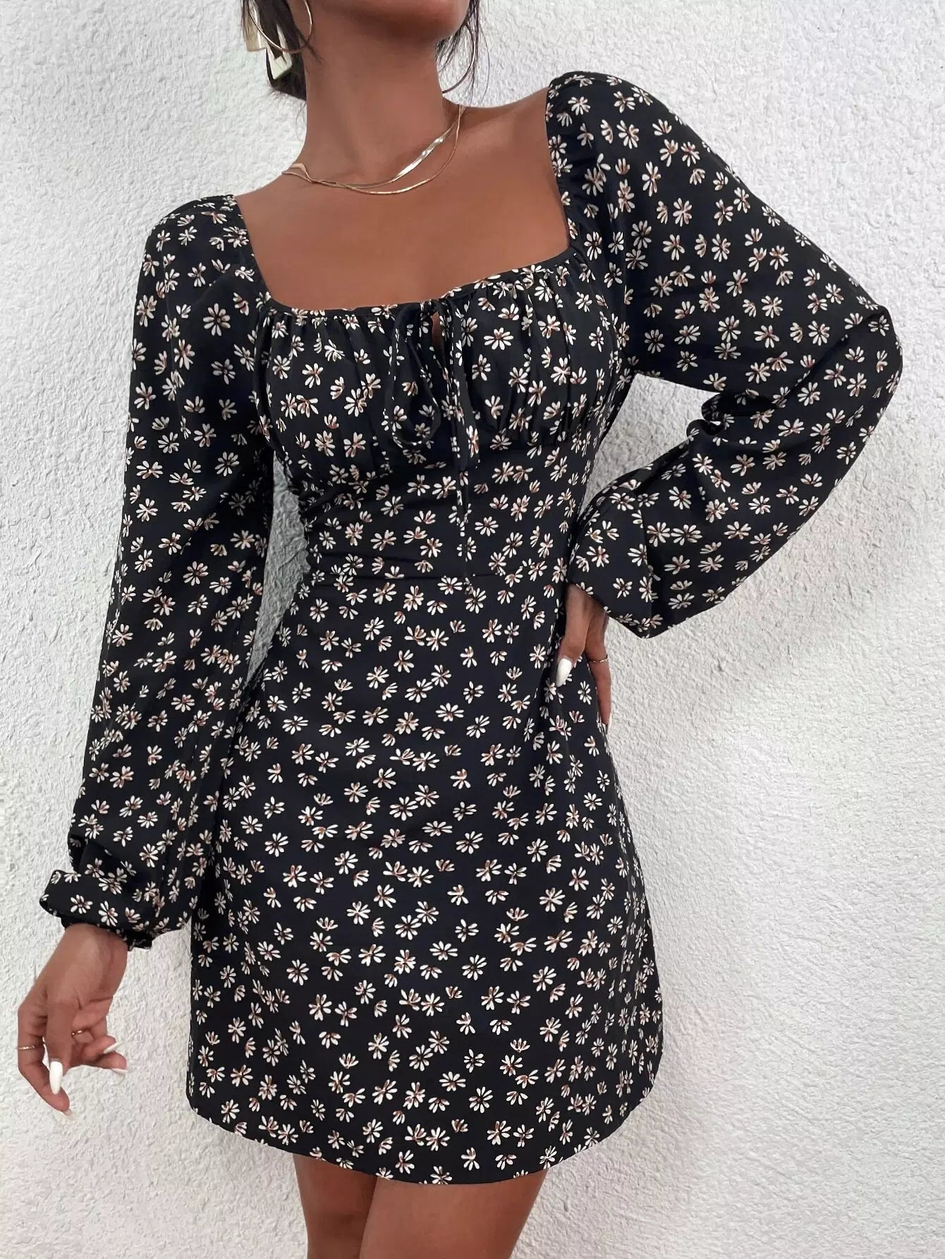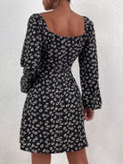 Ditsy Floral Print Lantern Sleeve Ruched Bust Dress