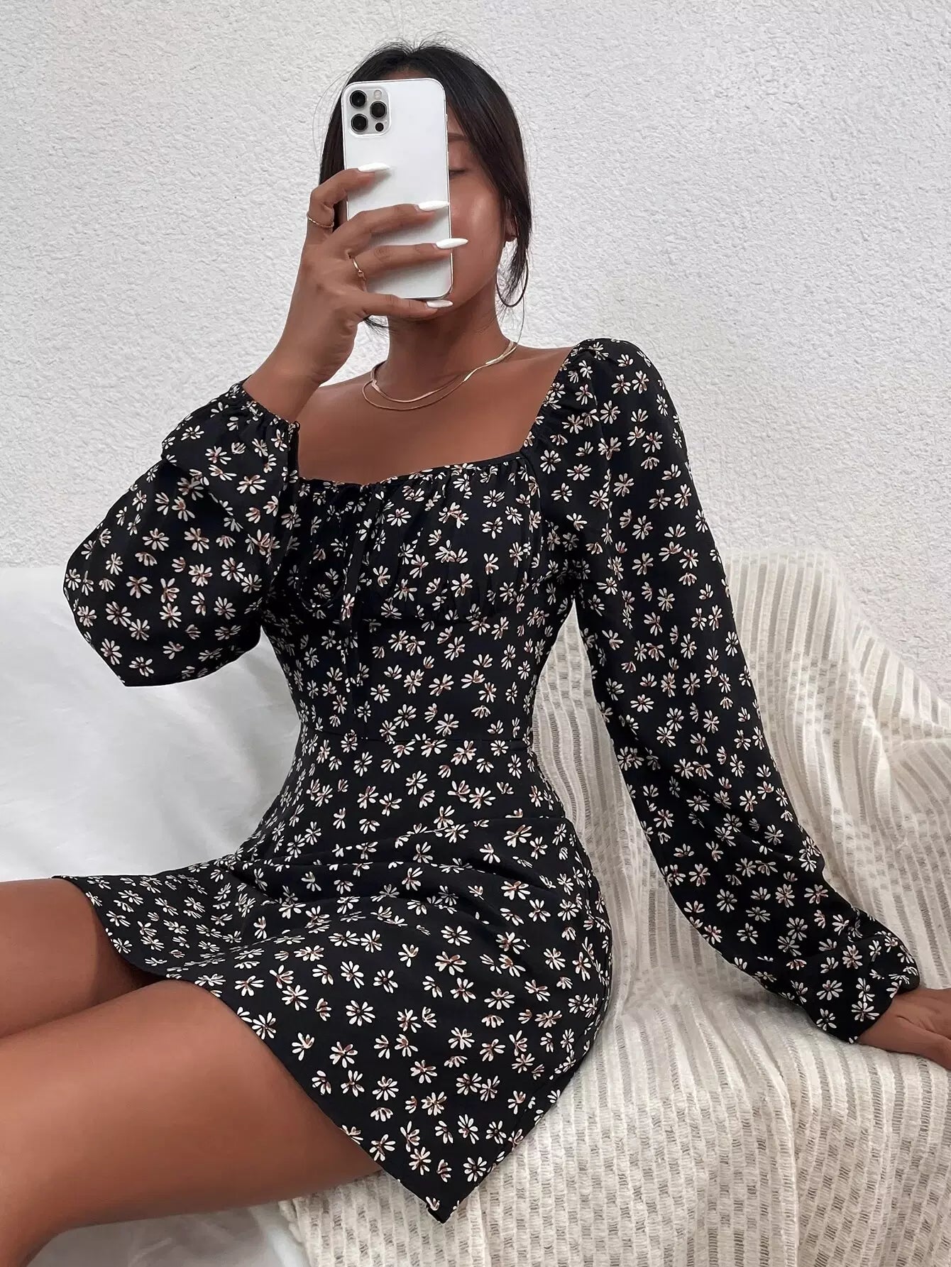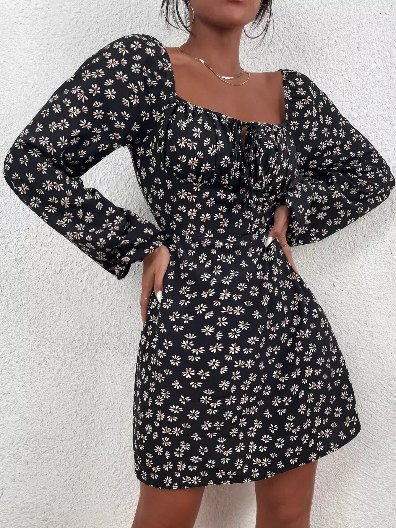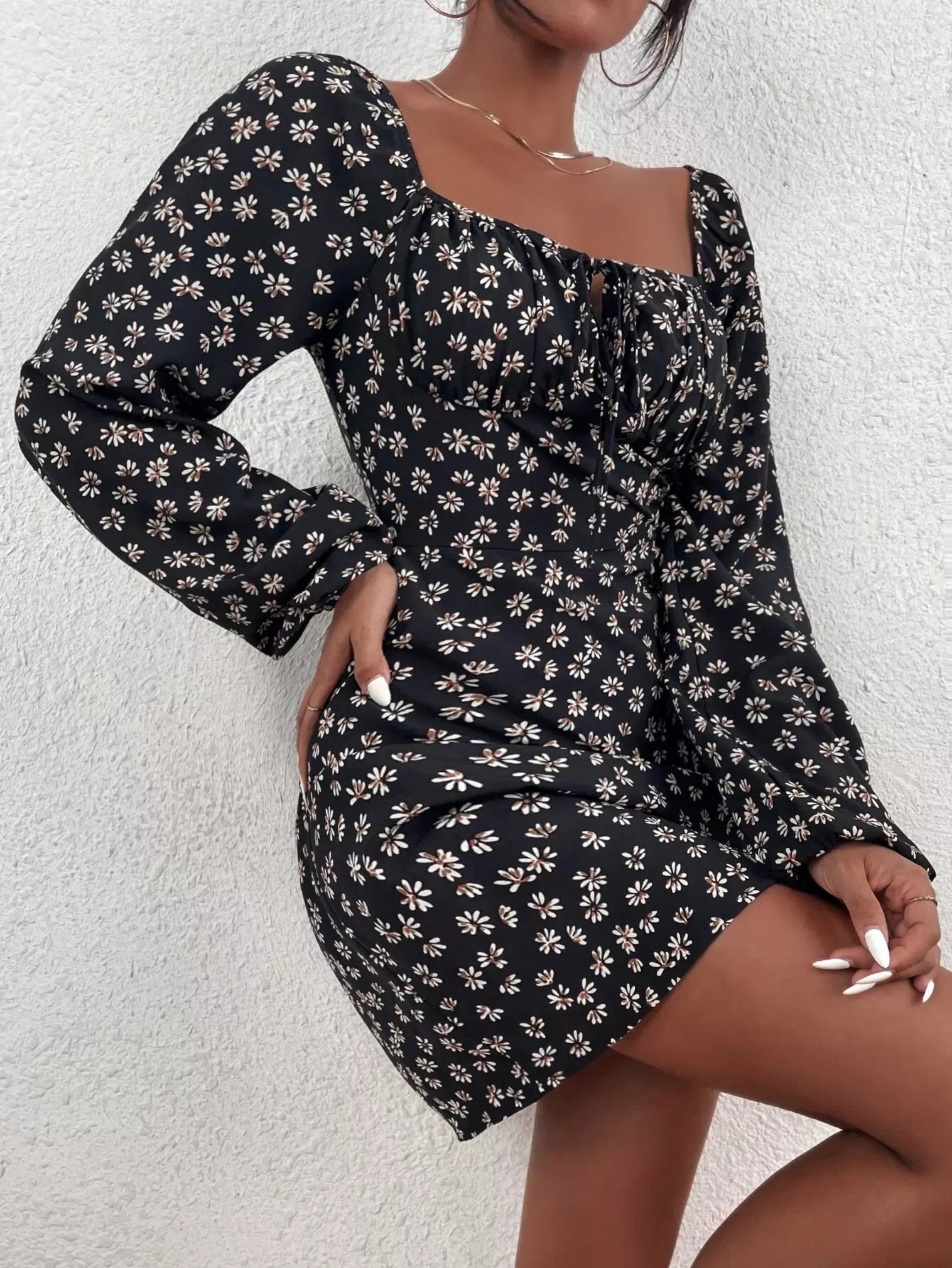 Ditsy Floral Print Lantern Sleeve Ruched Bust Dress