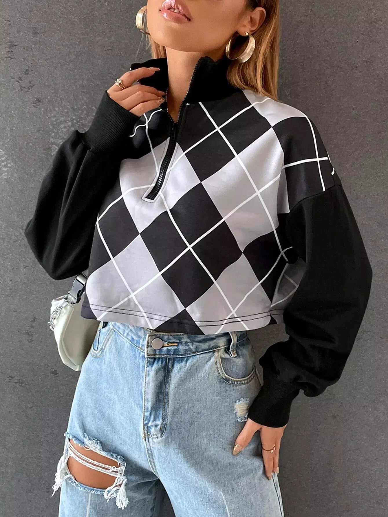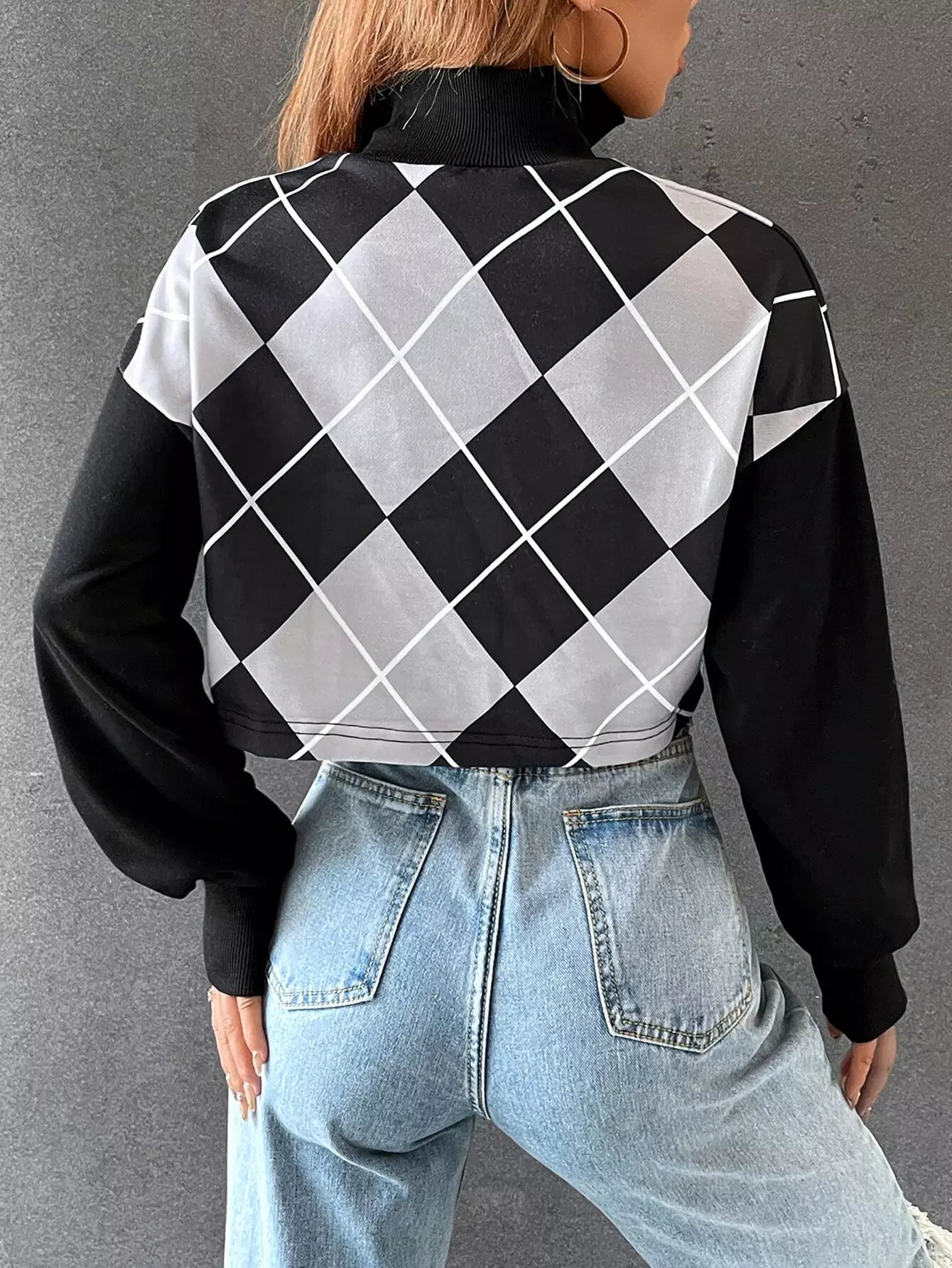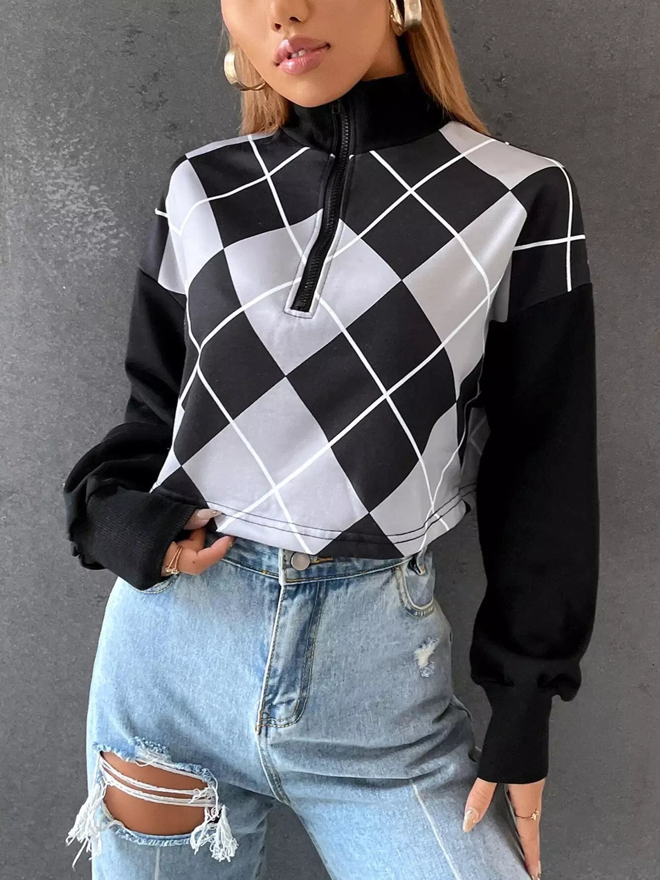 Drop Shoulder Argyle Print Zip Half Placket Sweatshirt