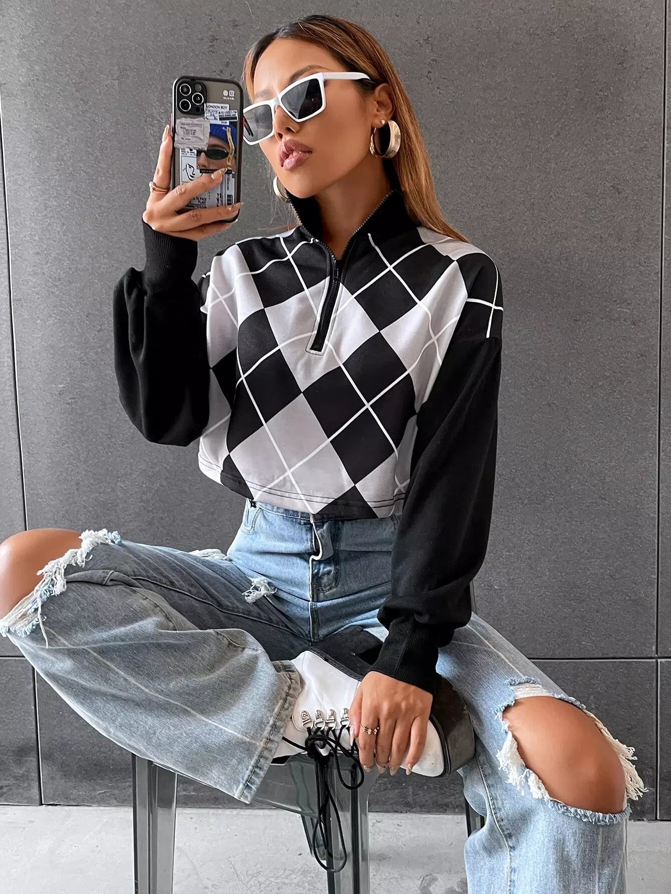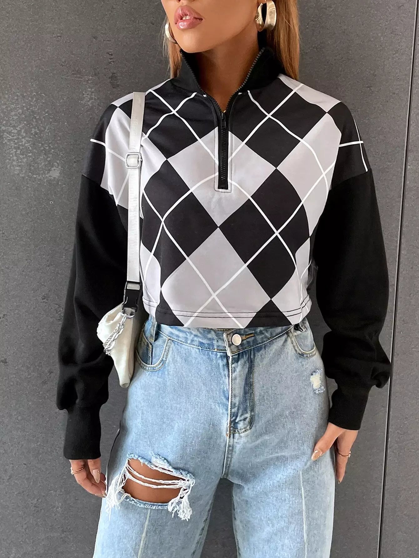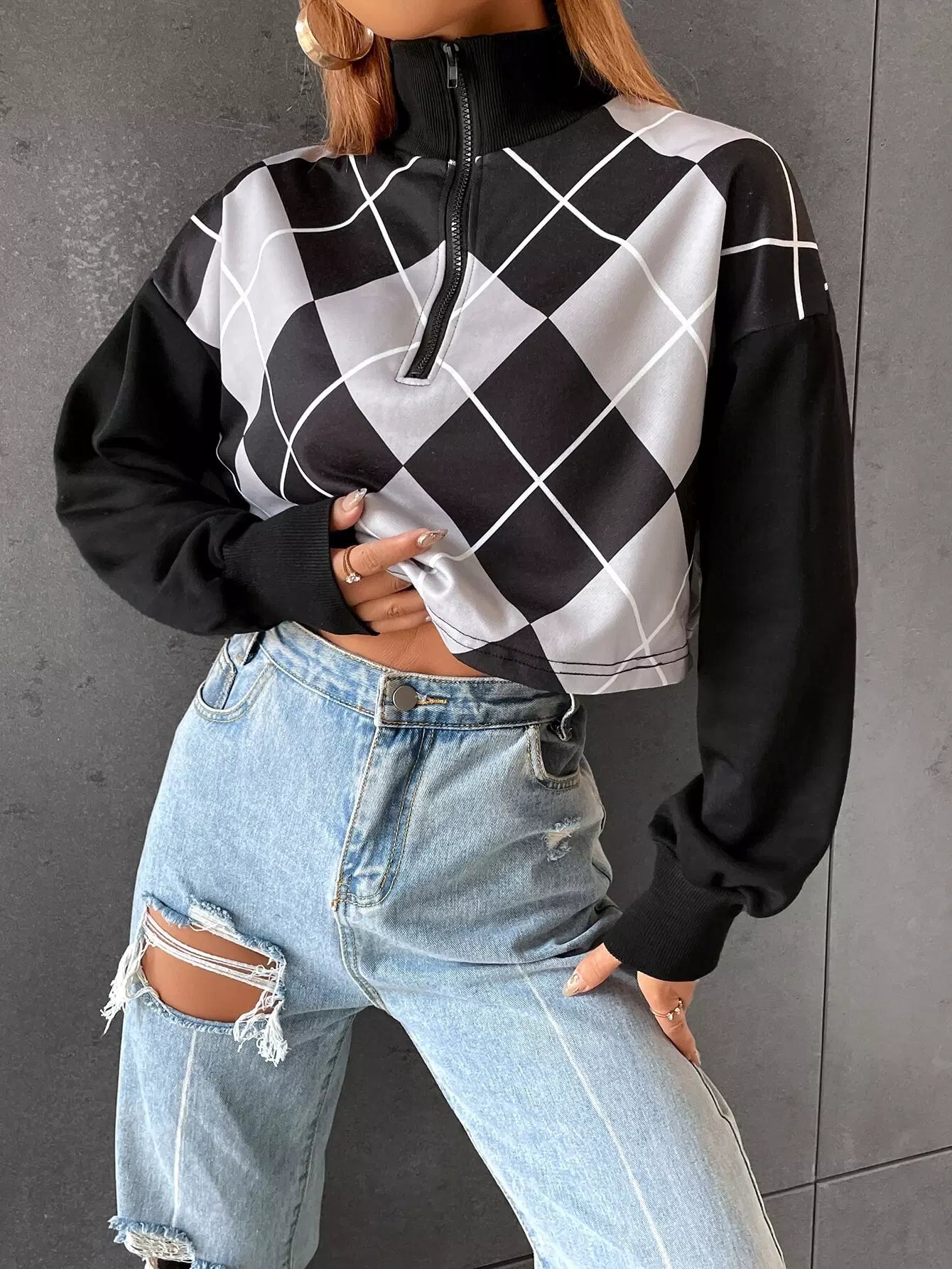 Drop Shoulder Argyle Print Zip Half Placket Sweatshirt