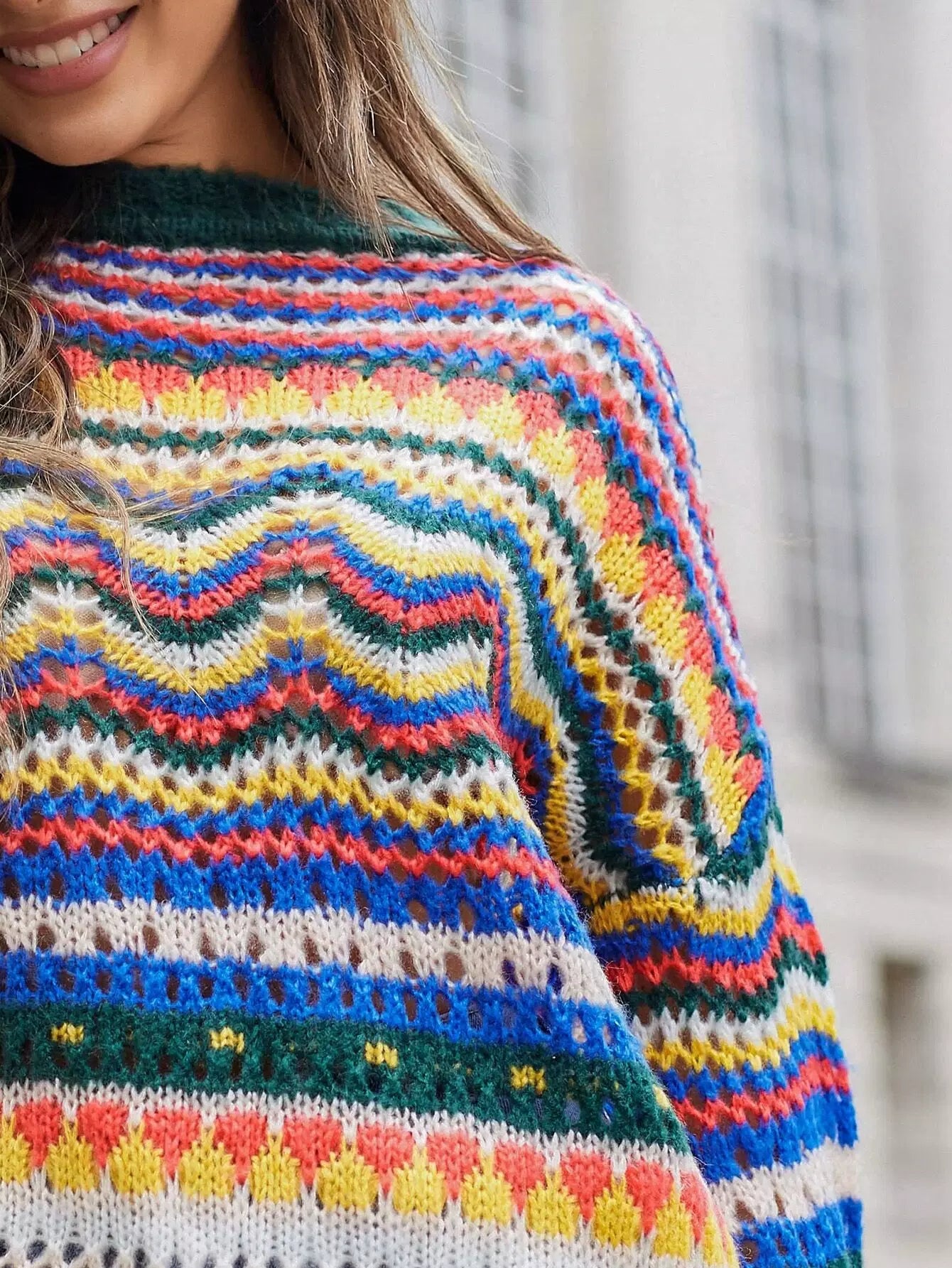 Drop Shoulder Bell Sleeve Colorblock Pointelle Knit Sweater