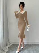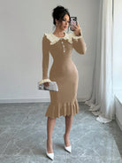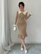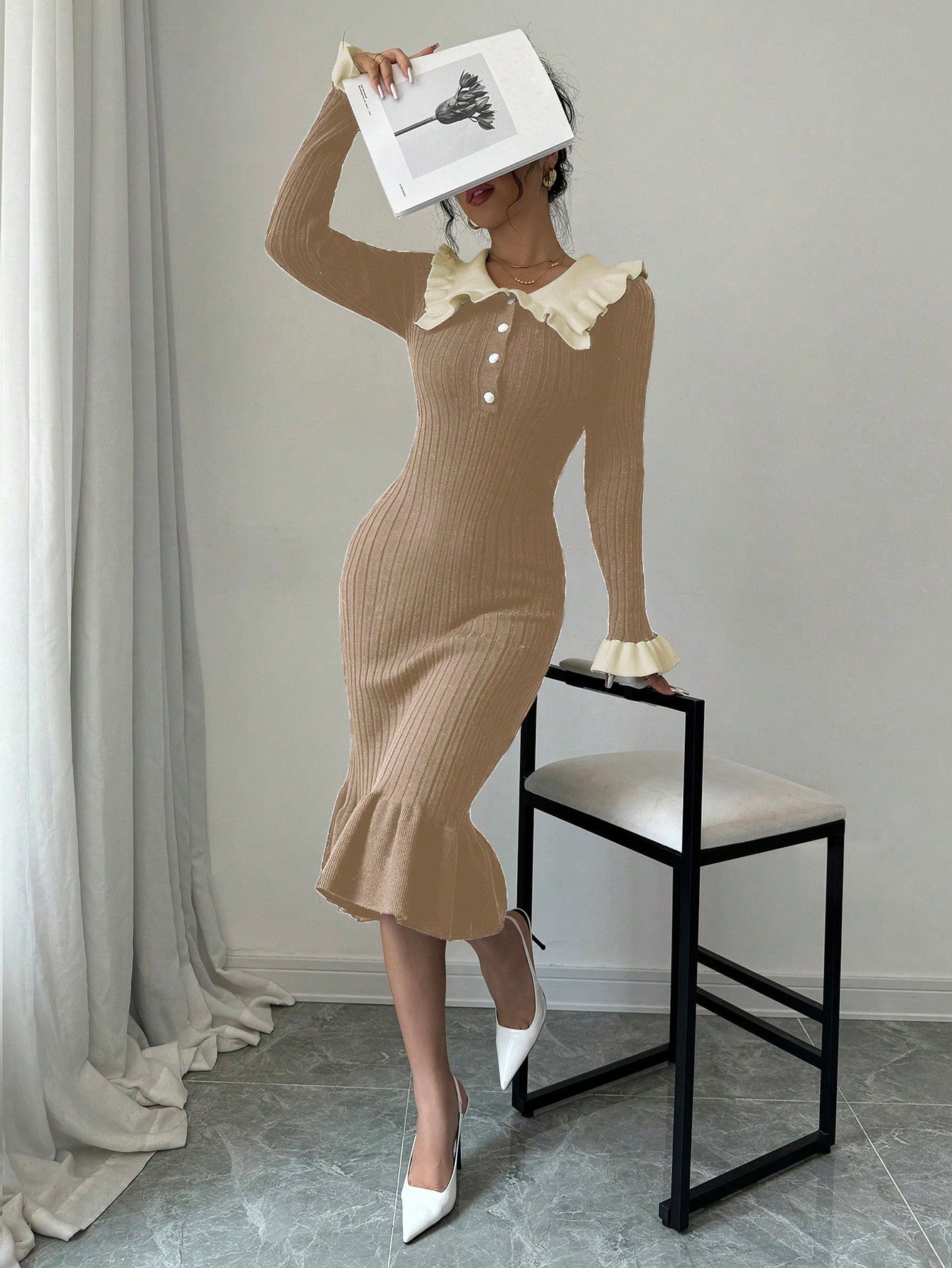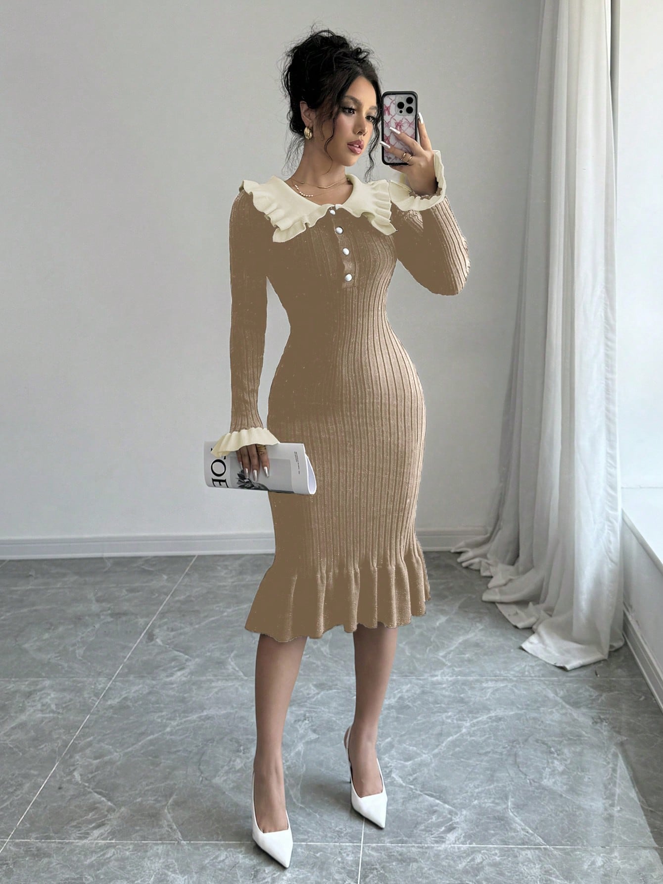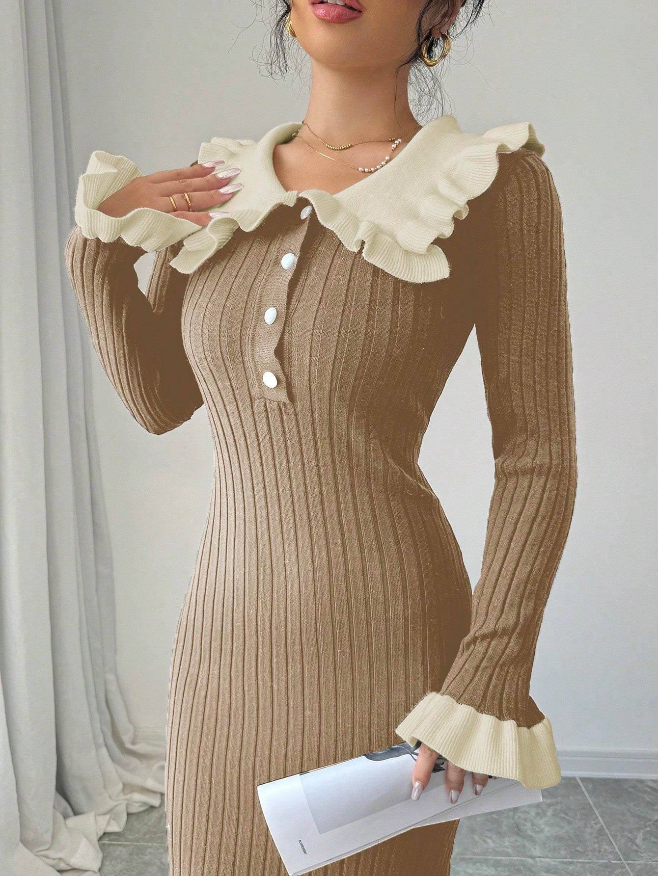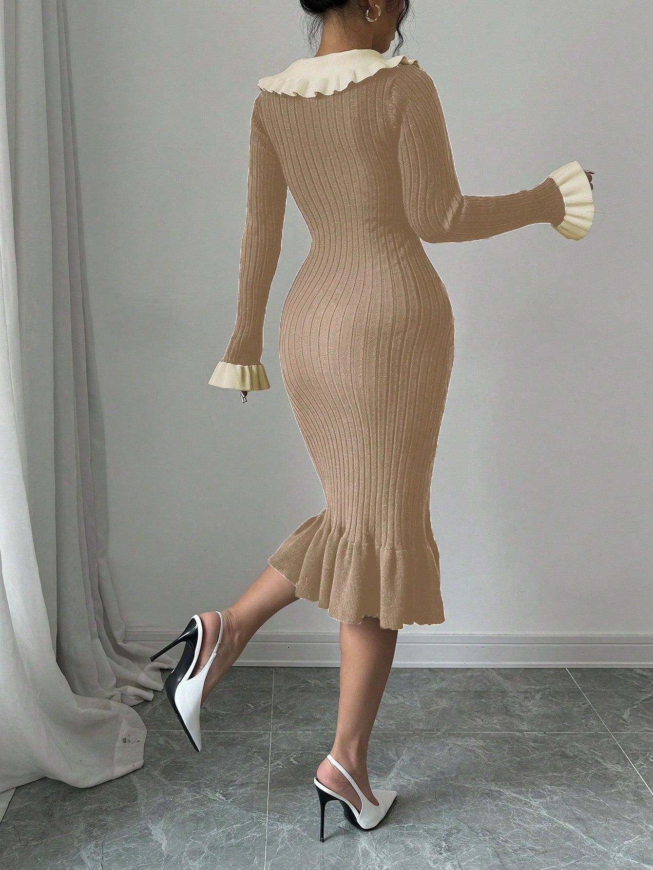 Elenzga Women's Elegant Color Block Ruffle Hem Knitted Dress With Bell Sleeves