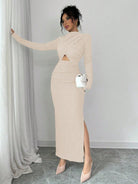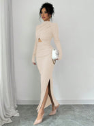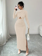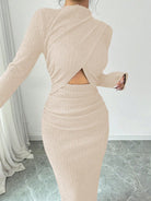 women Elenzga Women's Solid Color Stand Collar Long Sleeve Ruched Waist Cutout Casual Dress