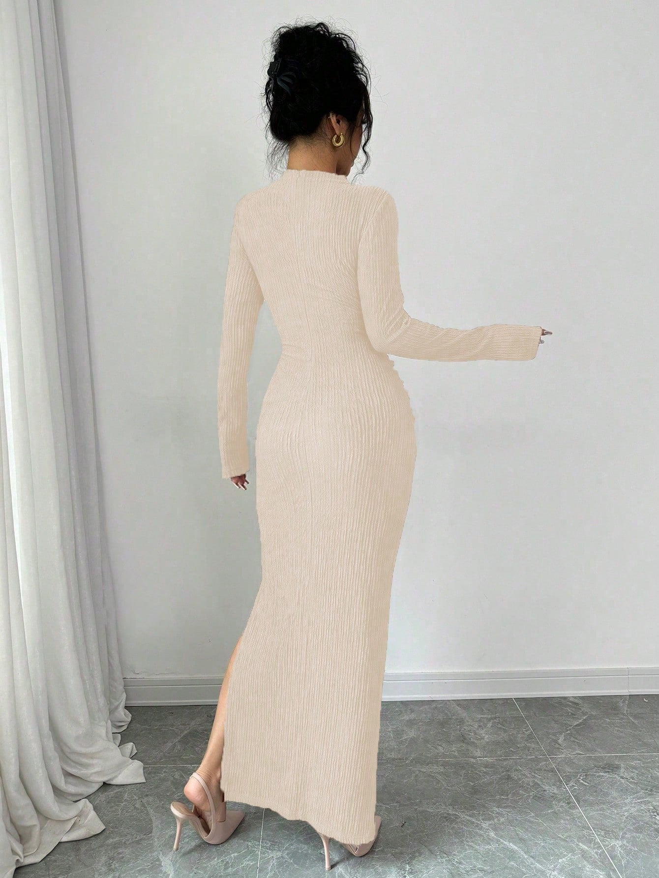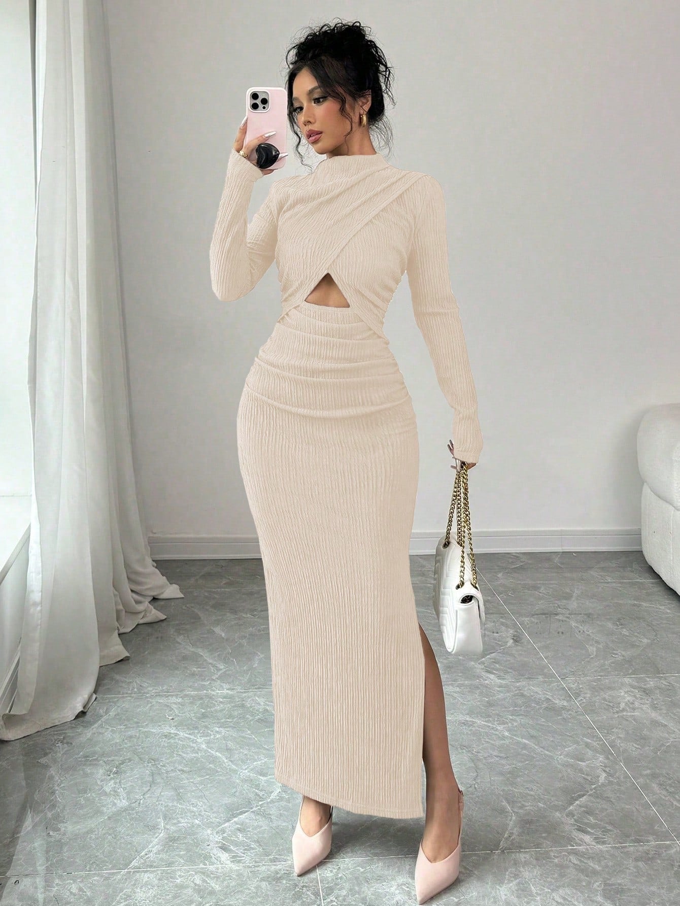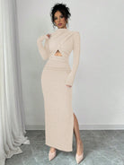 Elenzga Women's Solid Color Stand Collar Long Sleeve Ruched Waist Cutout Casual Dress