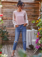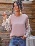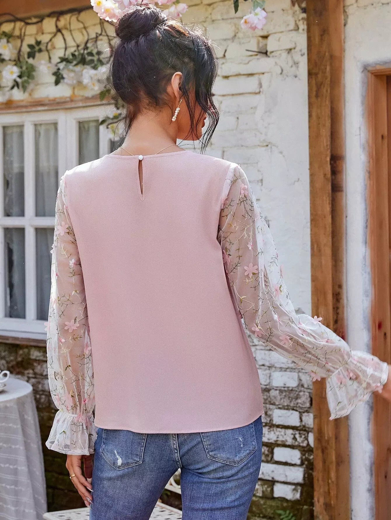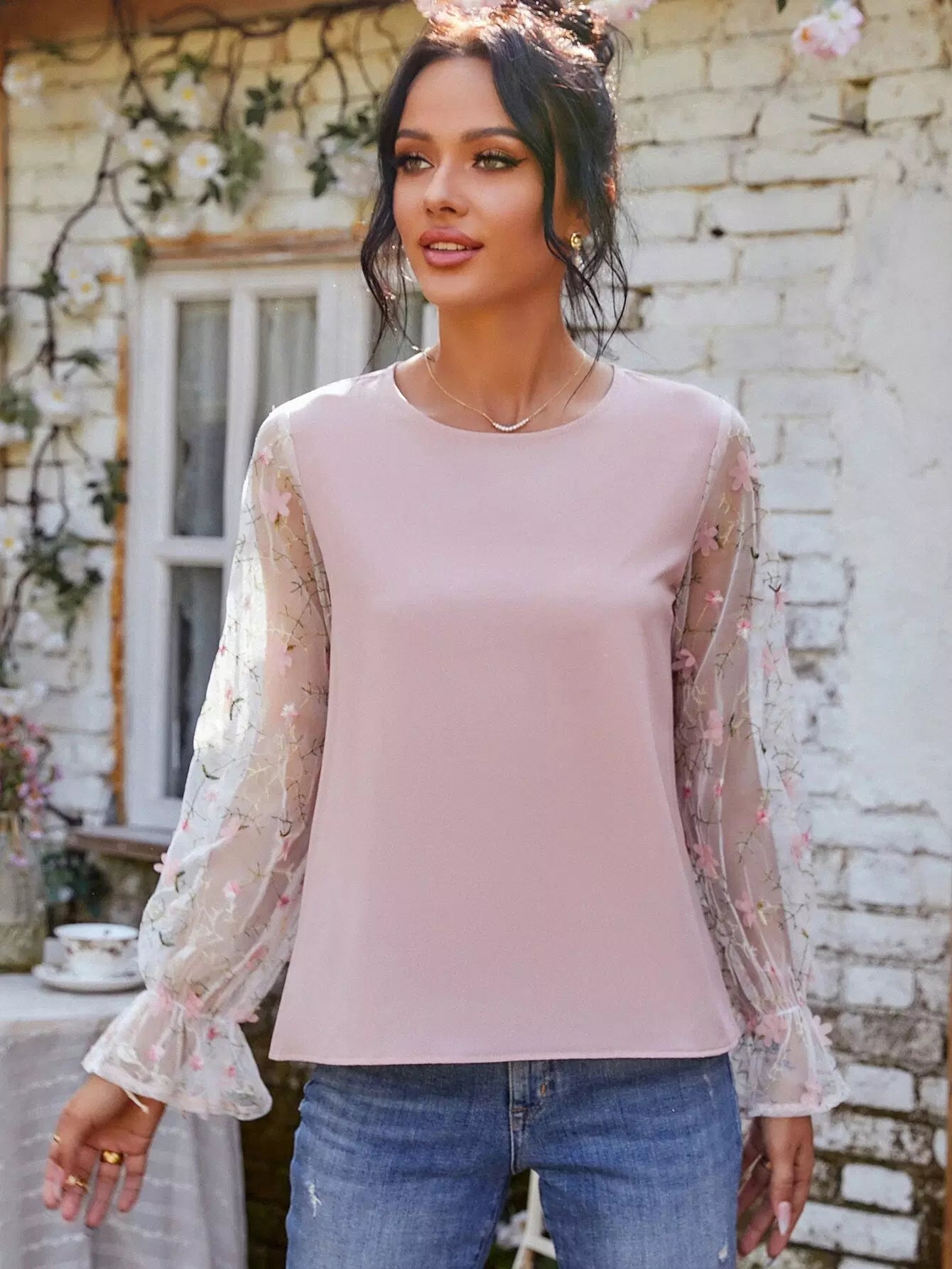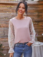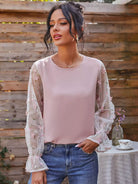 Embroidery Mesh Flounce Sleeve Blouse