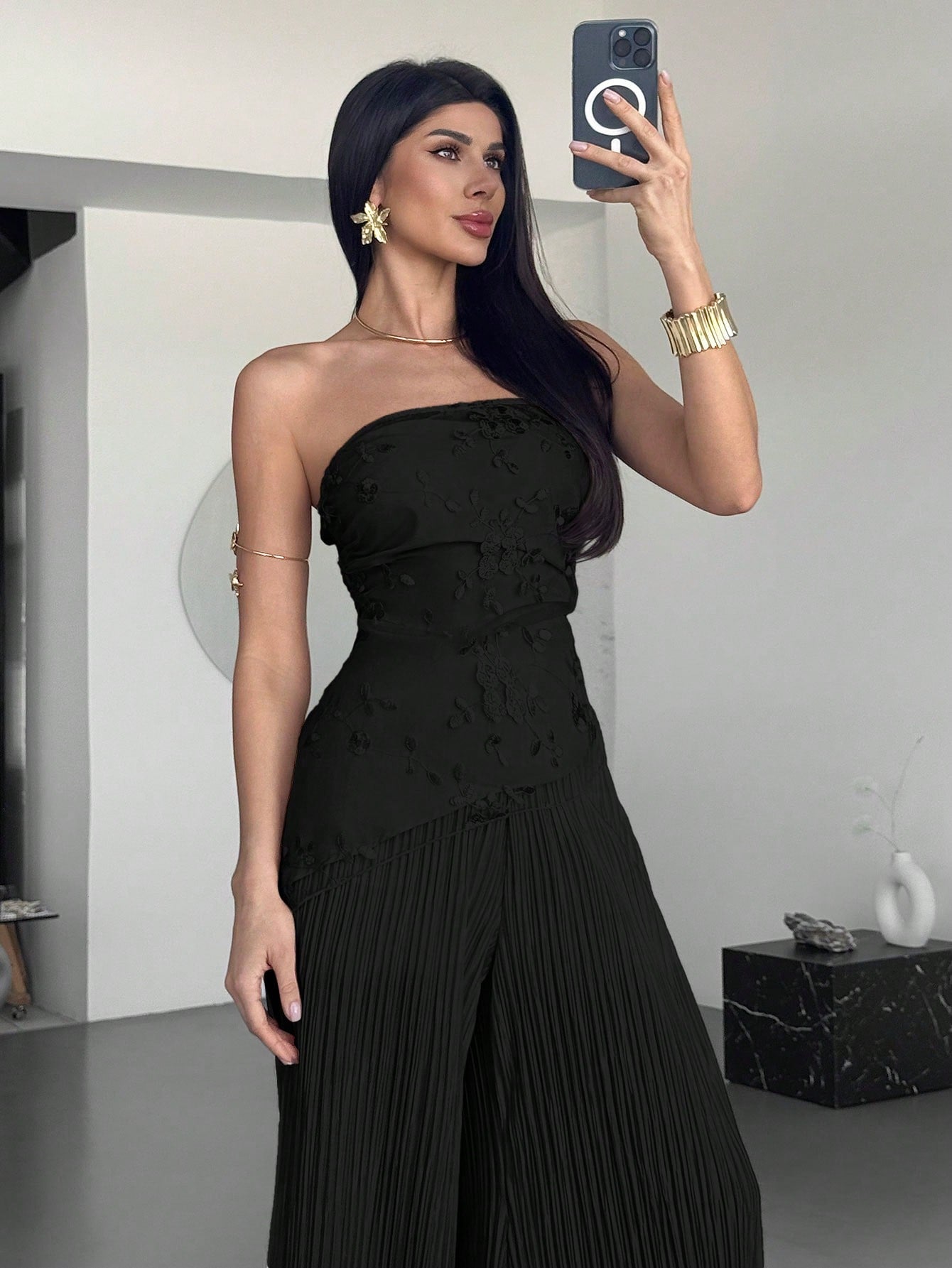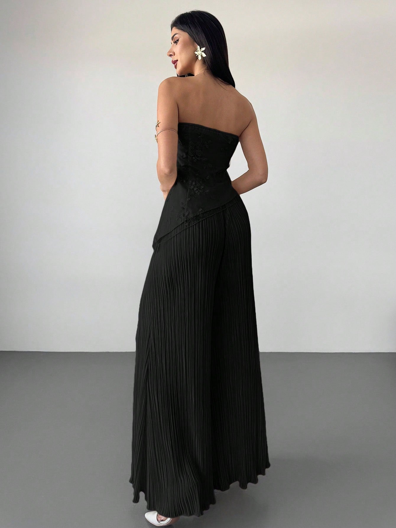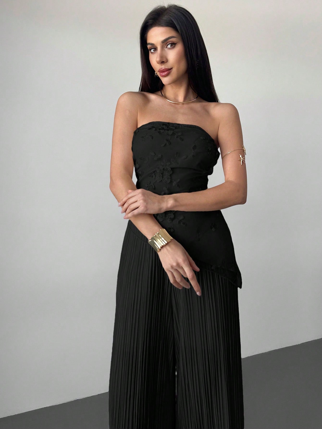 Firerie Women's Elegant Textured Metallic Finish Ruffled Hem Bandeau Top And High Waist Pleated Wide