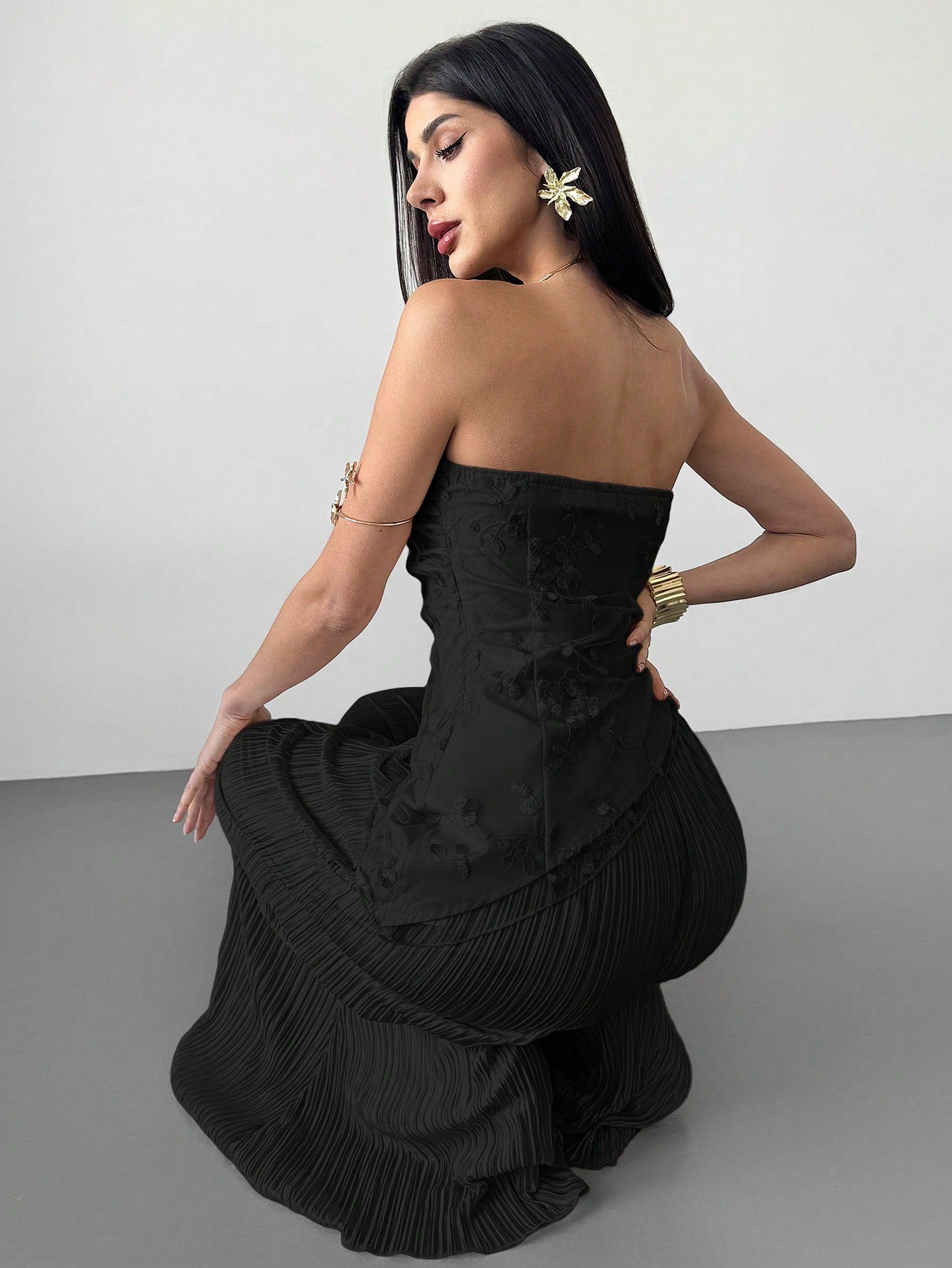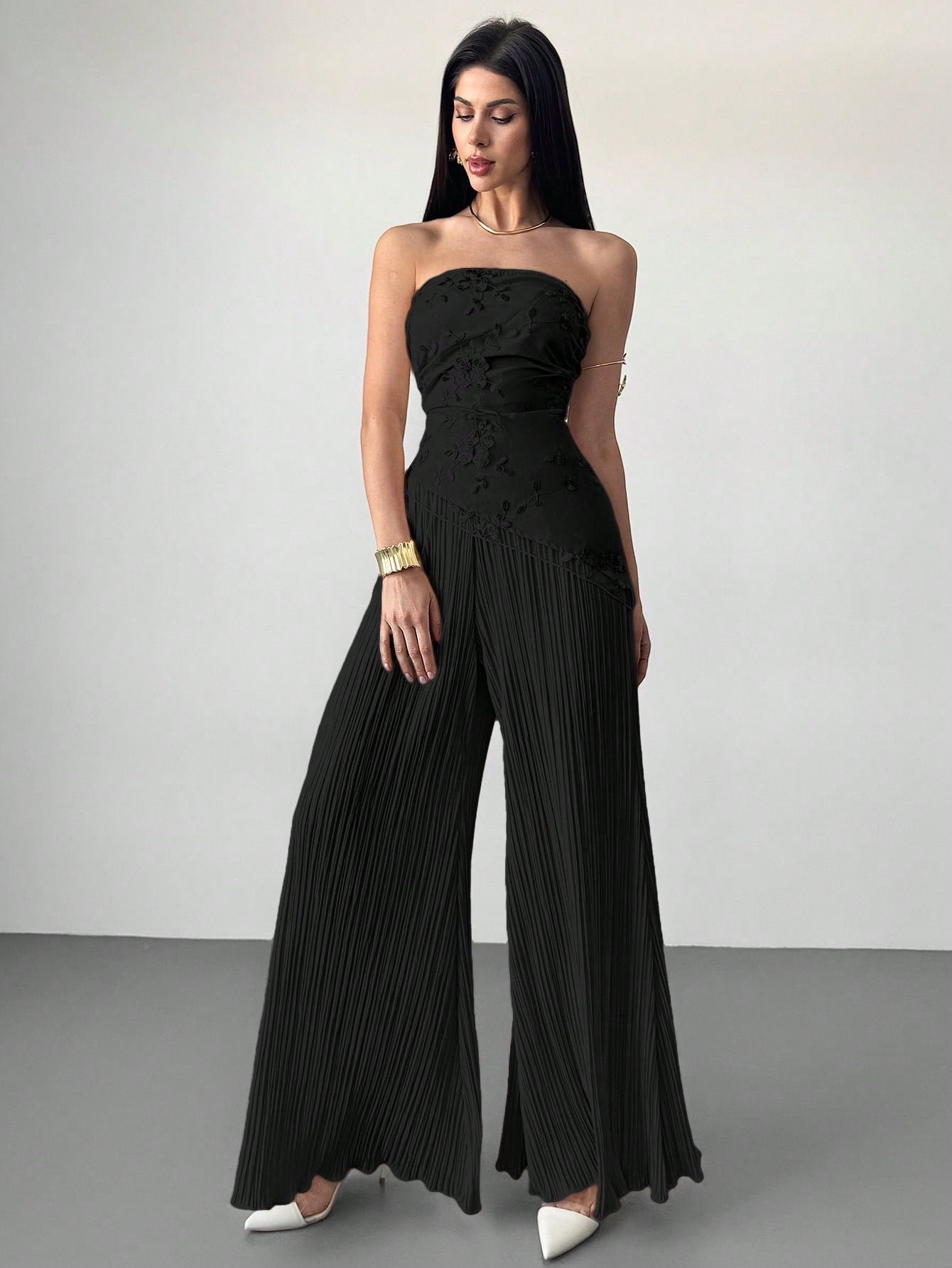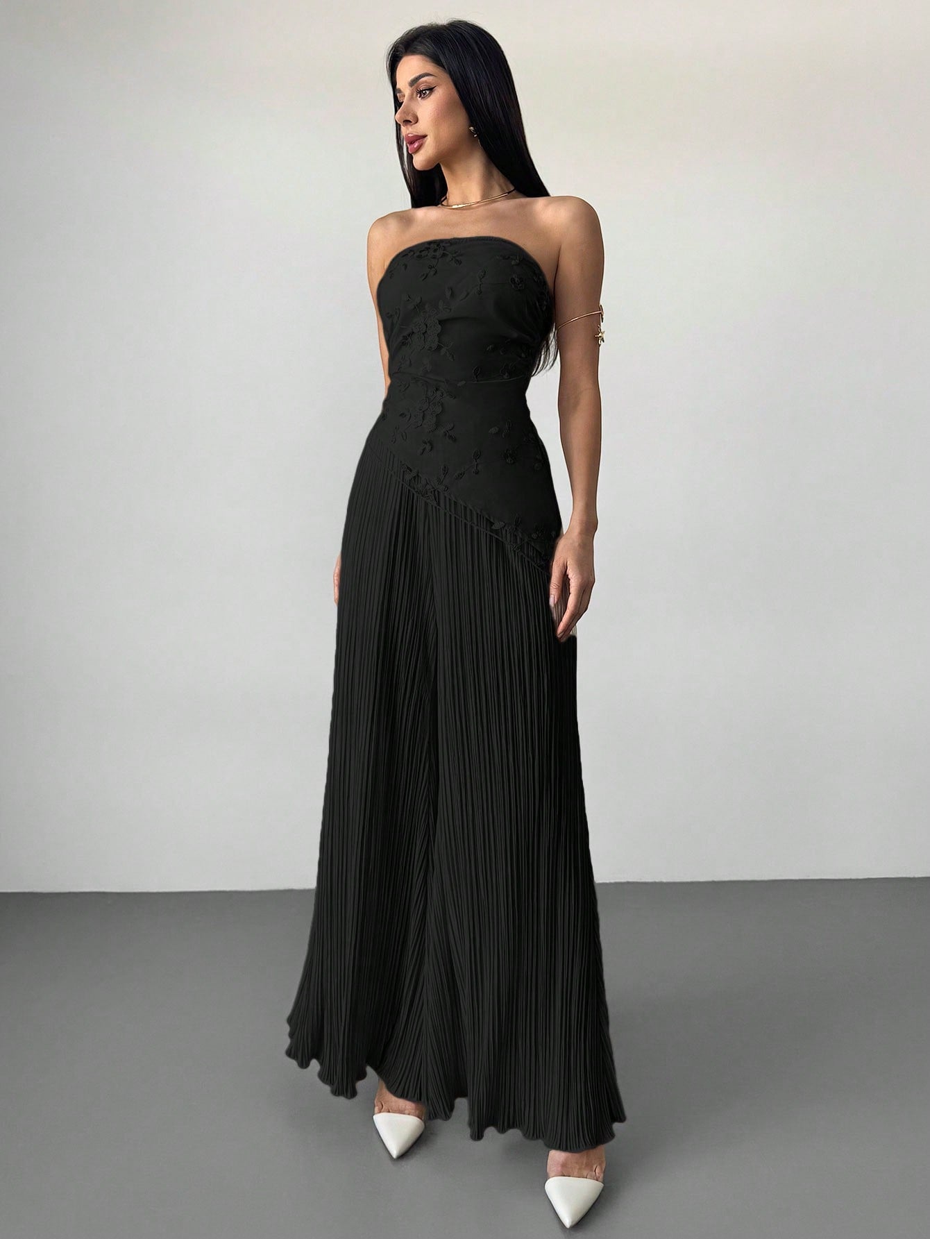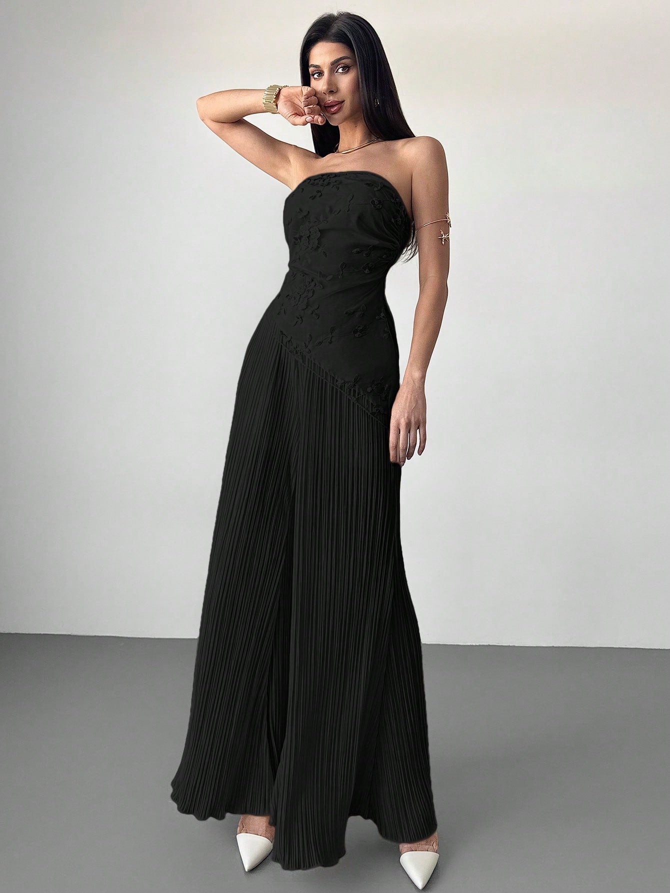 Firerie Women's Elegant Textured Metallic Finish Ruffled Hem Bandeau Top And High Waist Pleated Wide