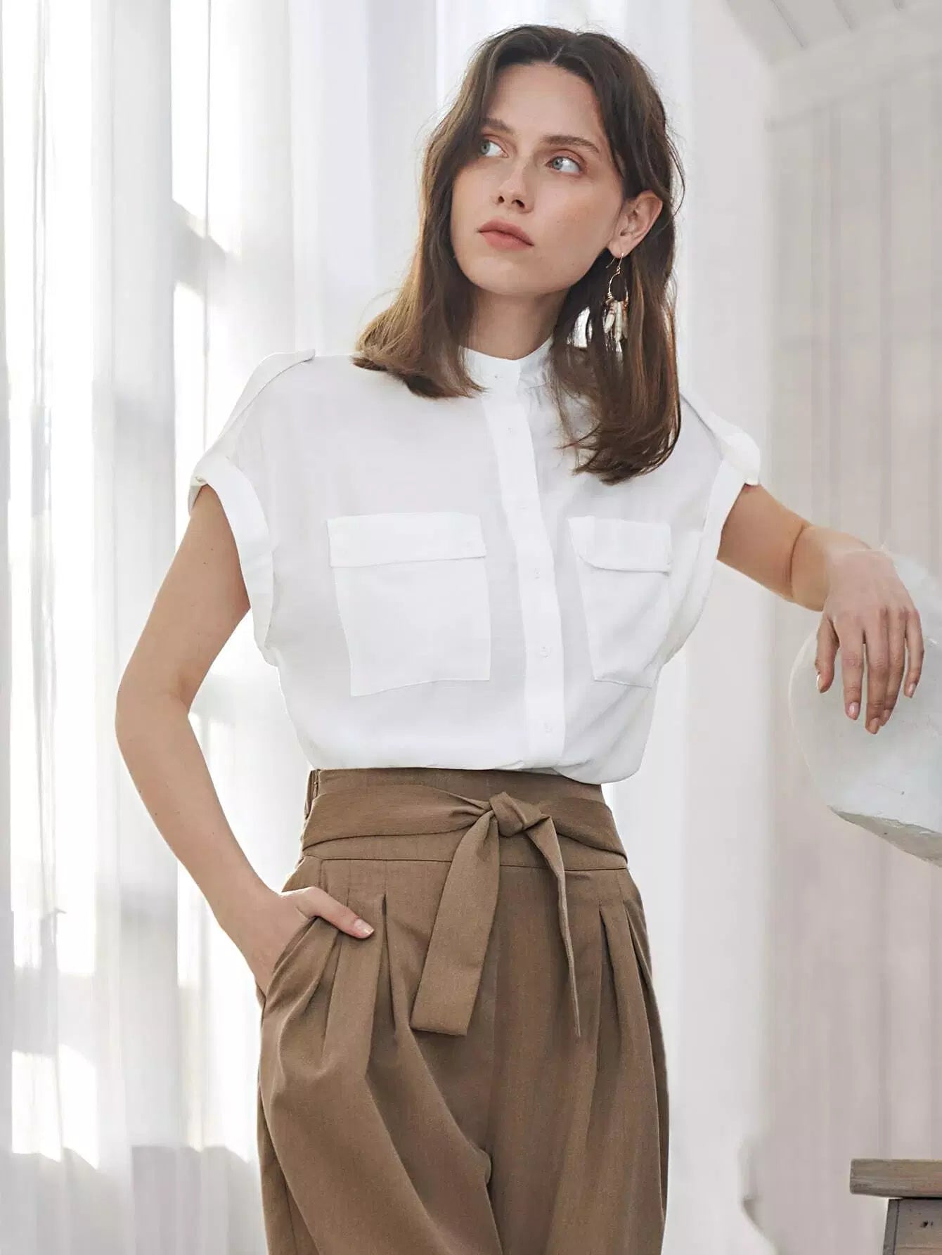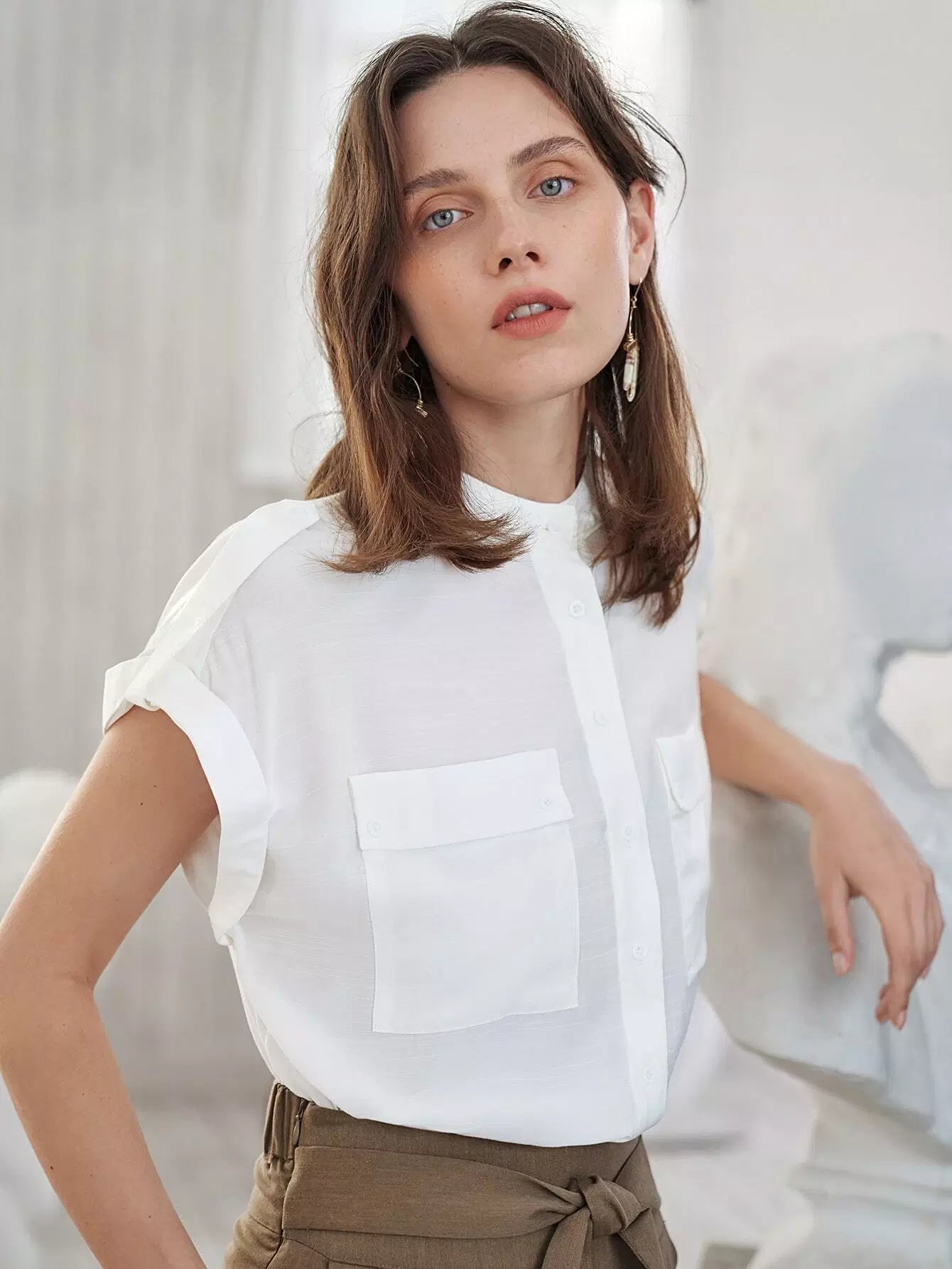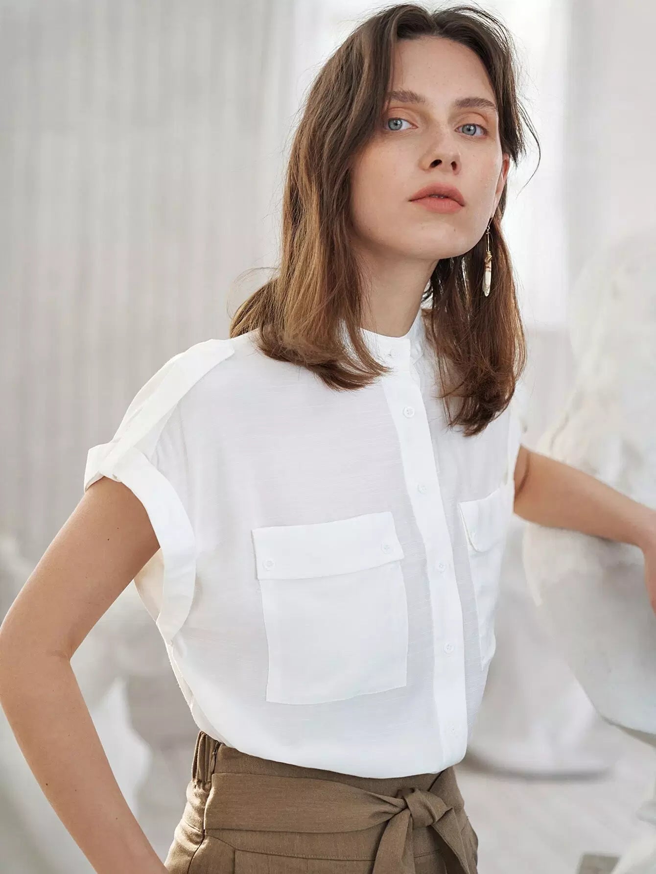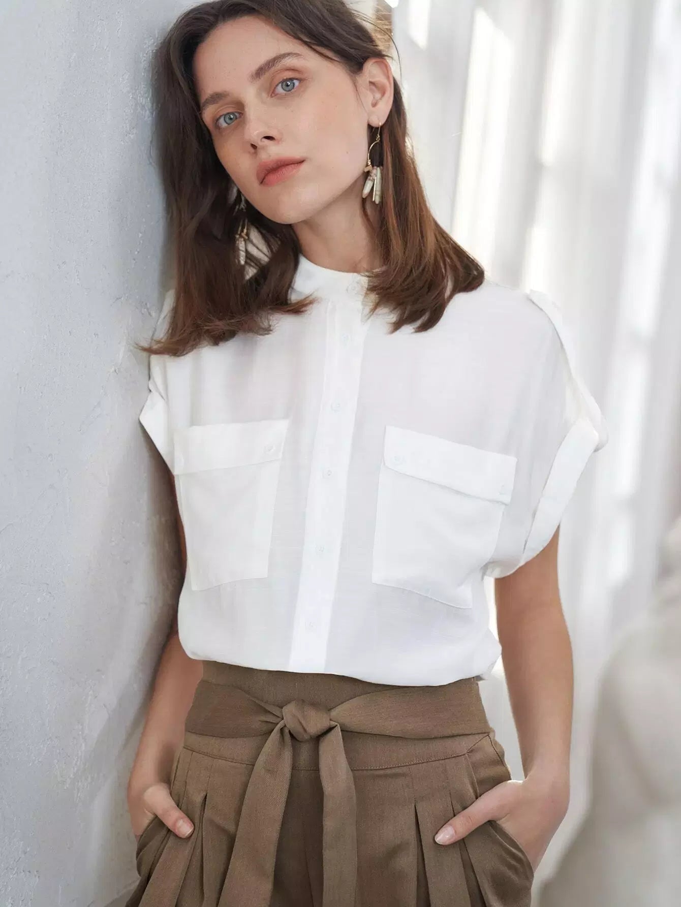 Flap Pocket Front Cuffed Blouse