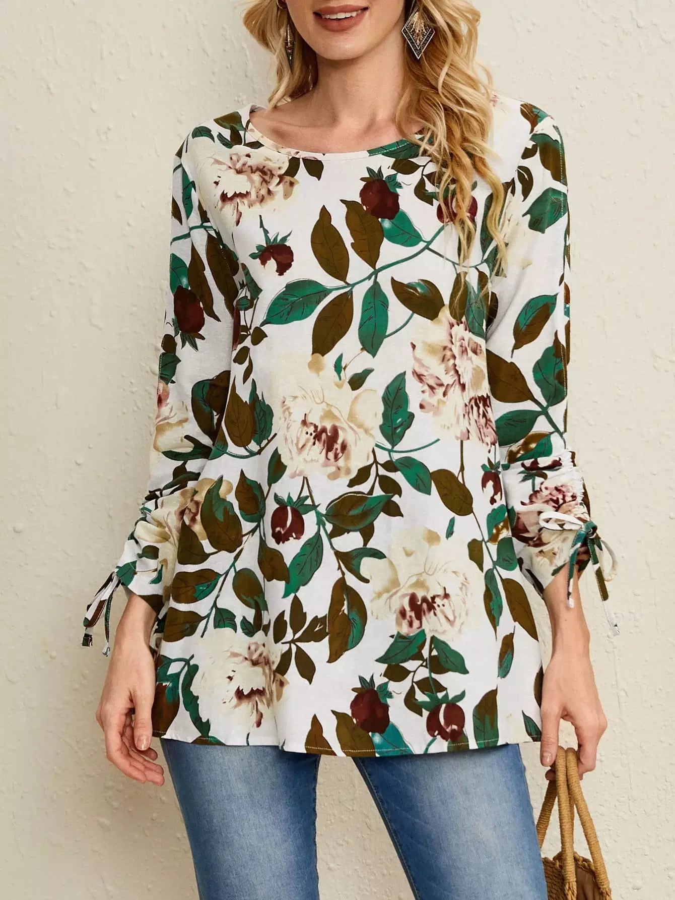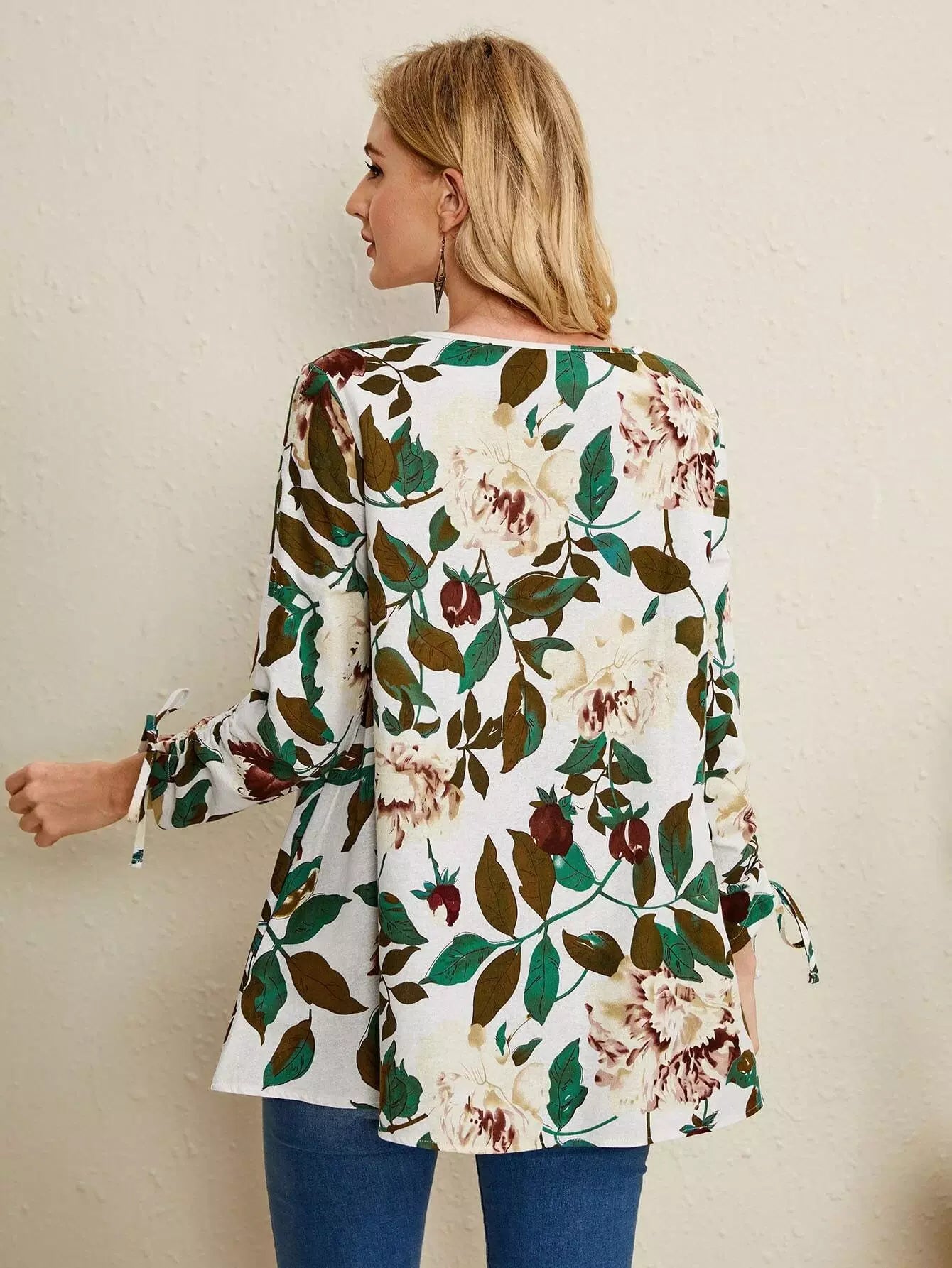 Floral Print Drawstring Cuff Blouse