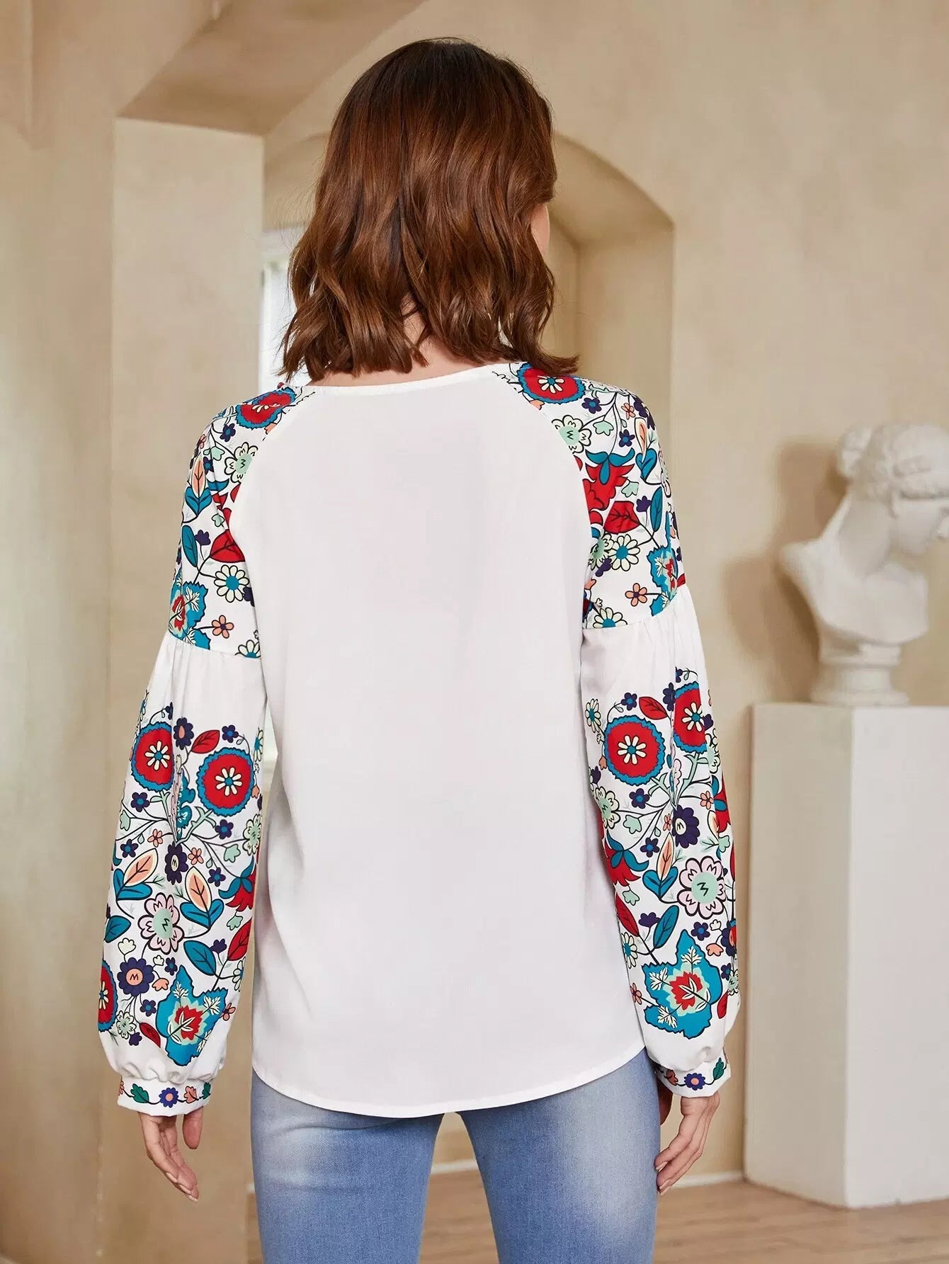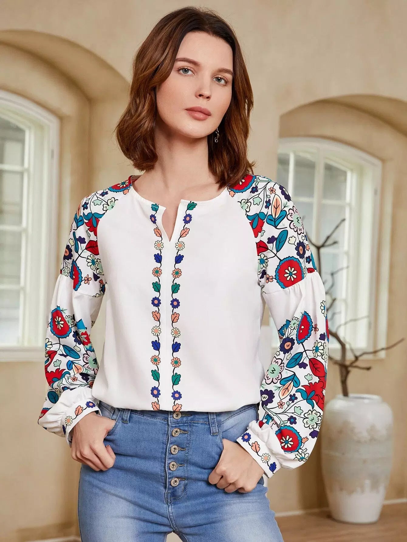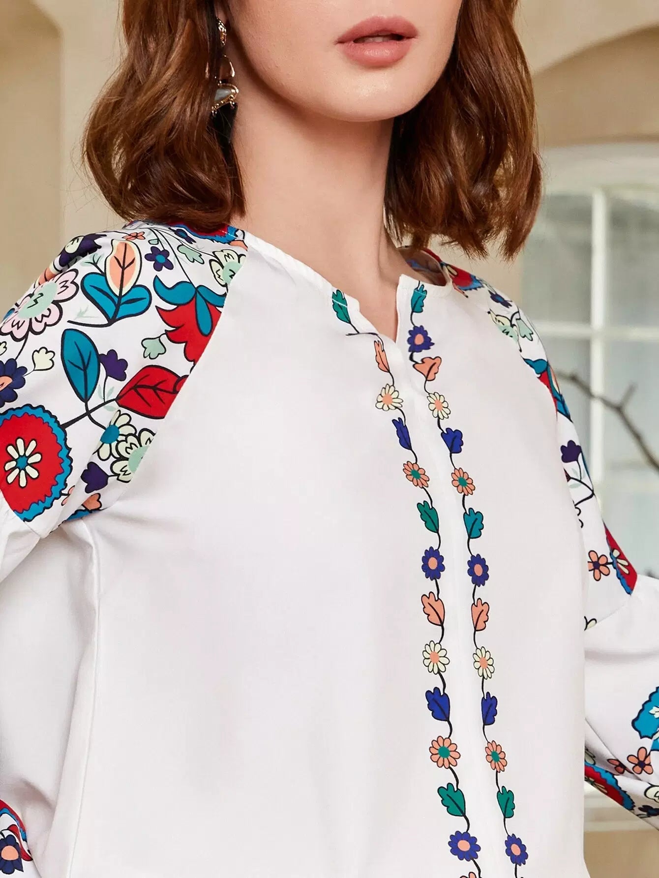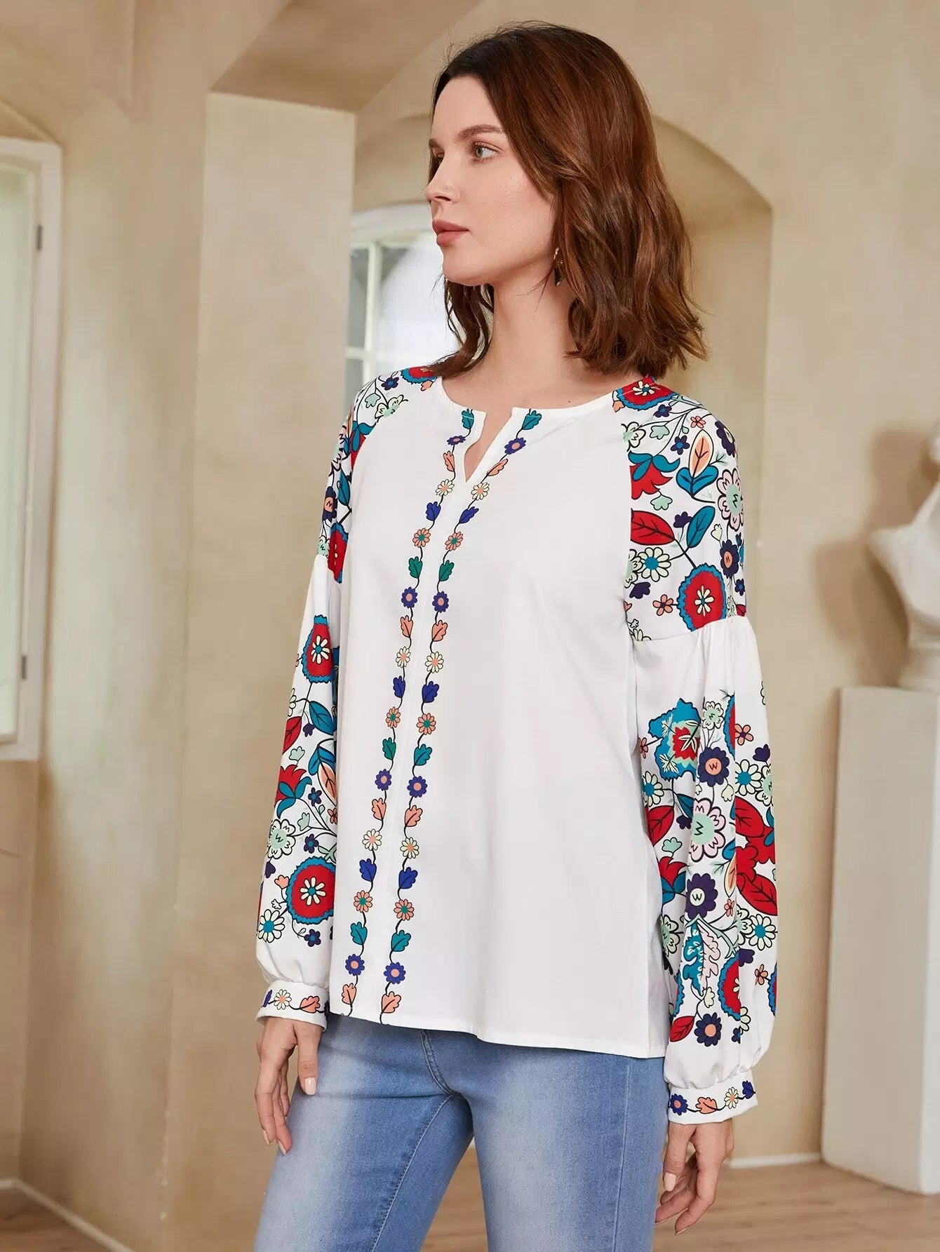 Floral Print Notch Neck Raglan Sleeve Blouse