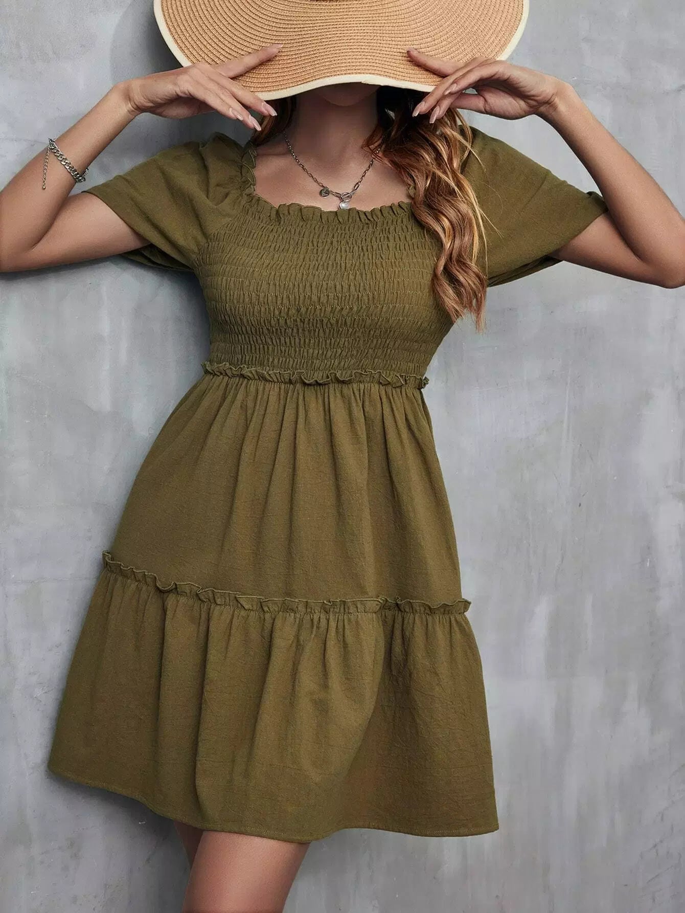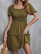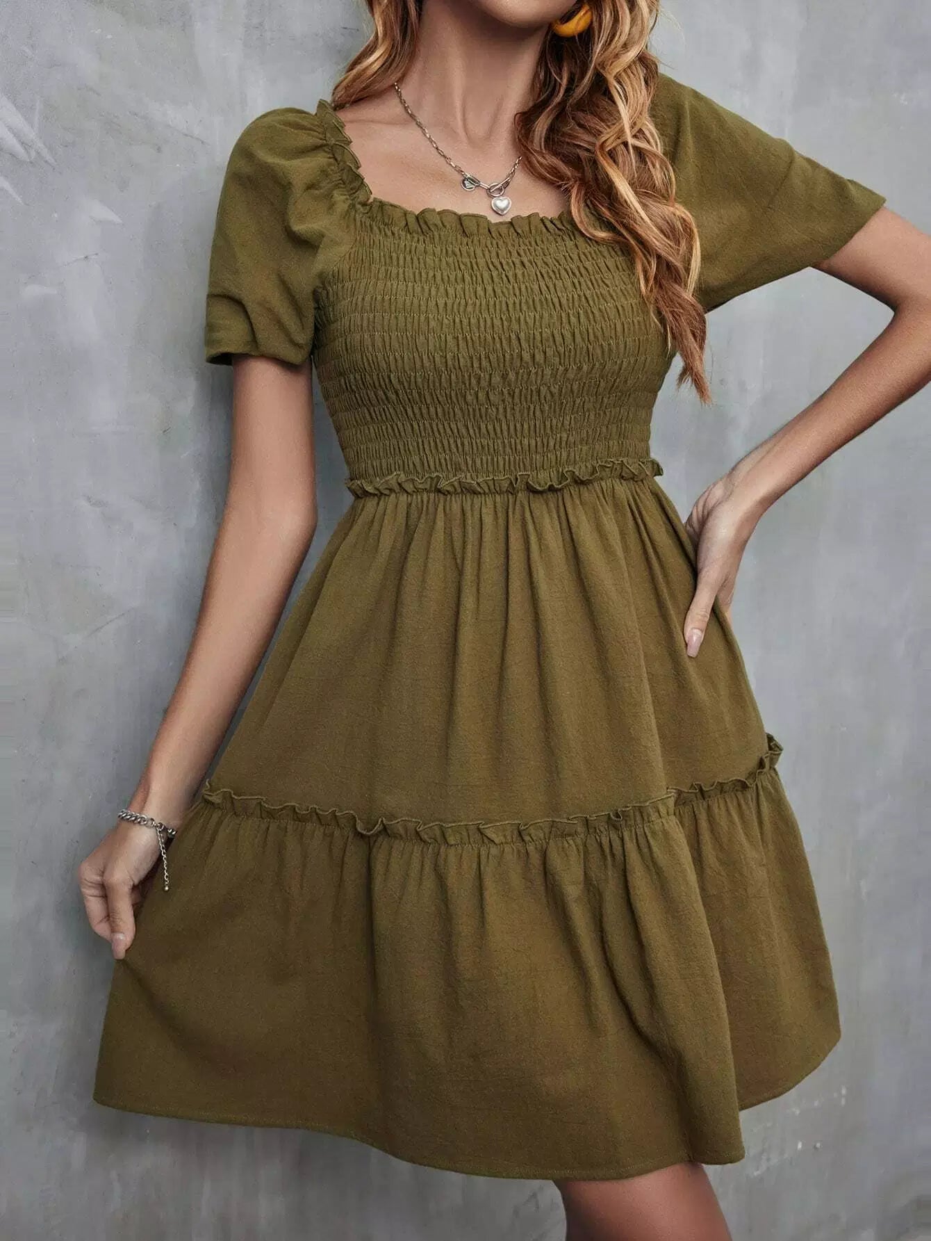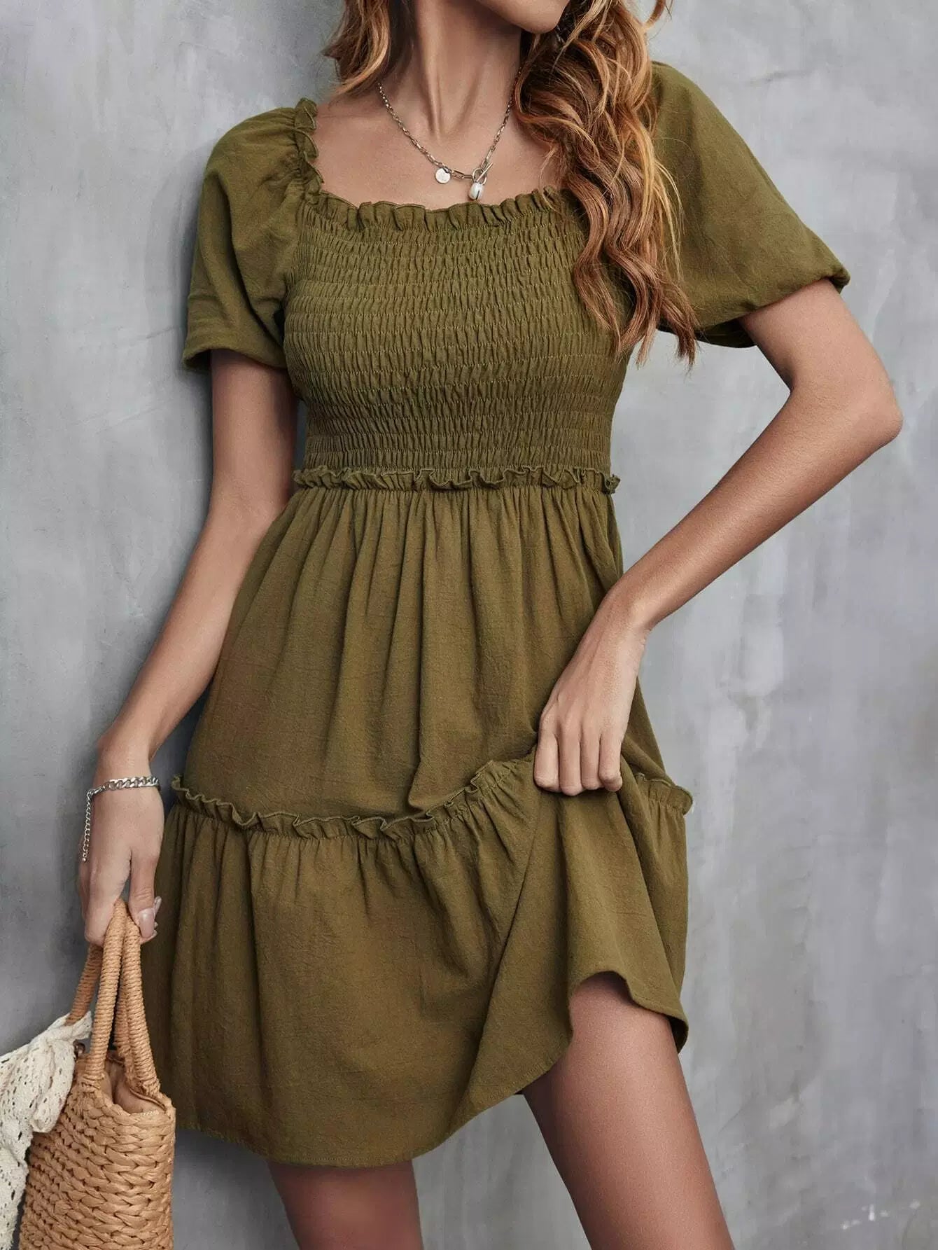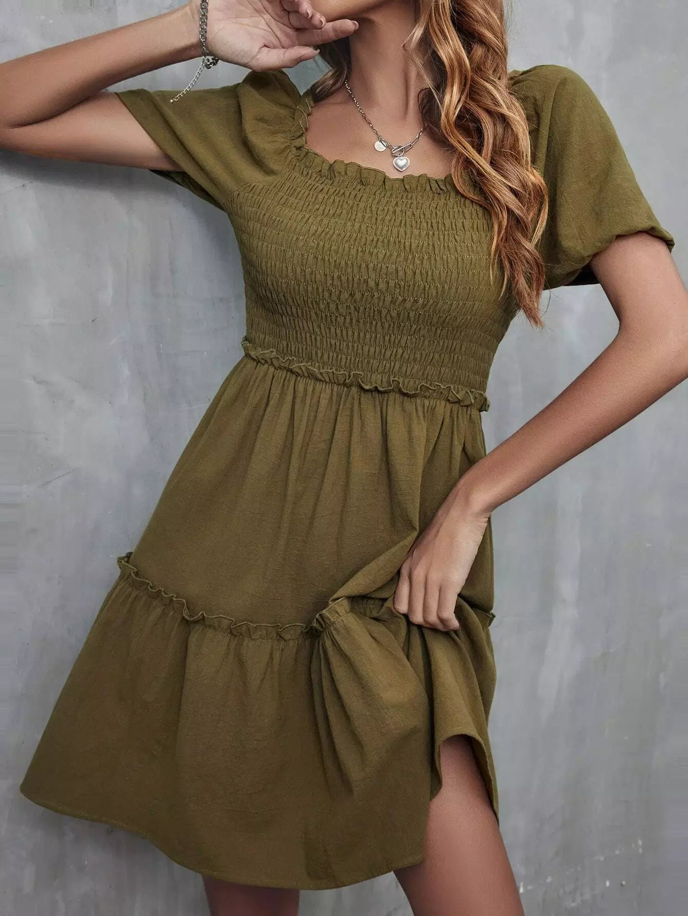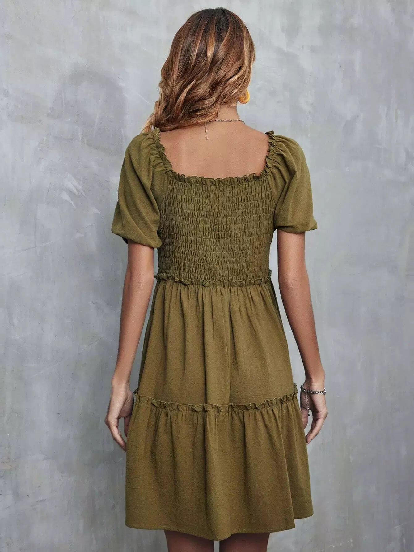 Frill Trim Shirred Bust Puff Sleeve Dress