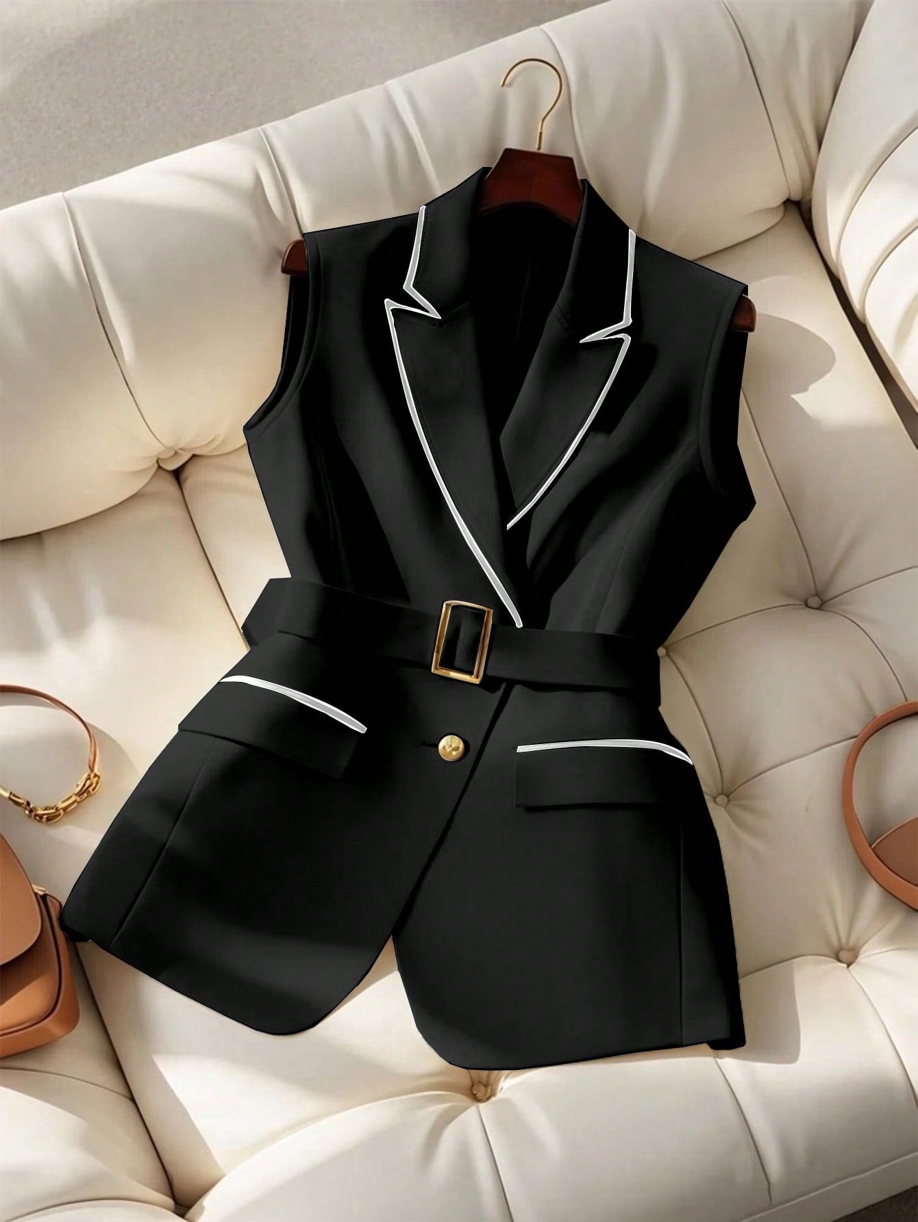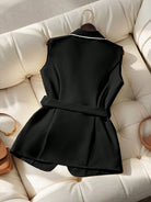 GlowEve Women's Colorblock Trim Belted Sleeveless Elegant Blazer