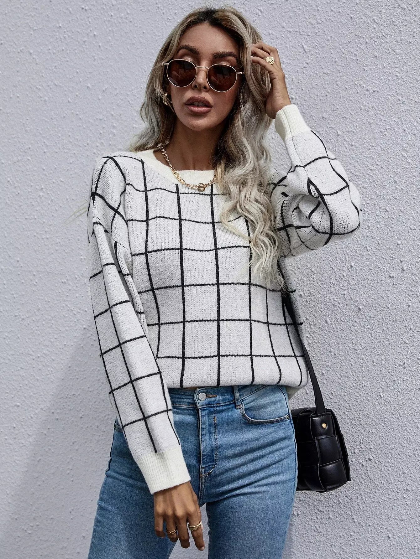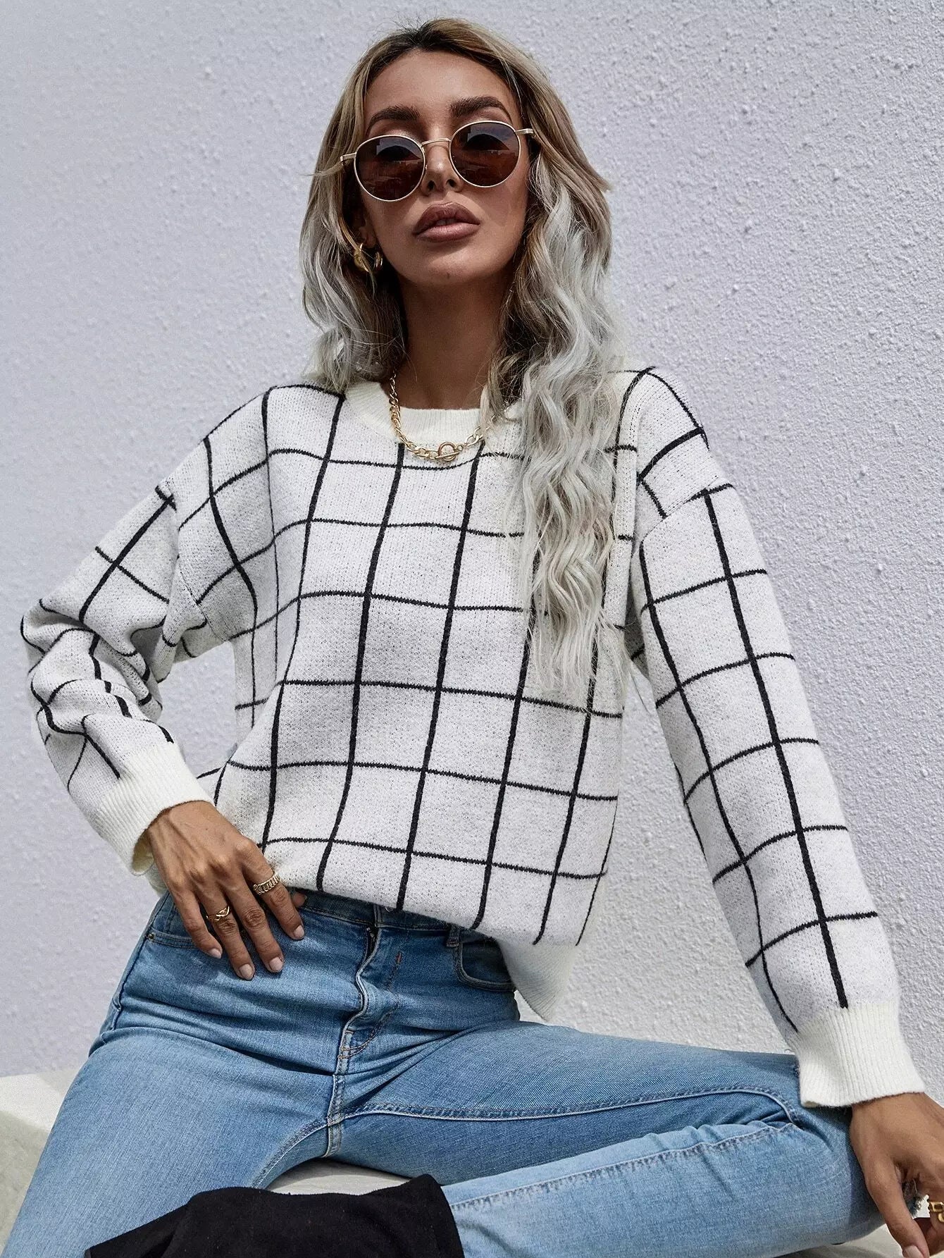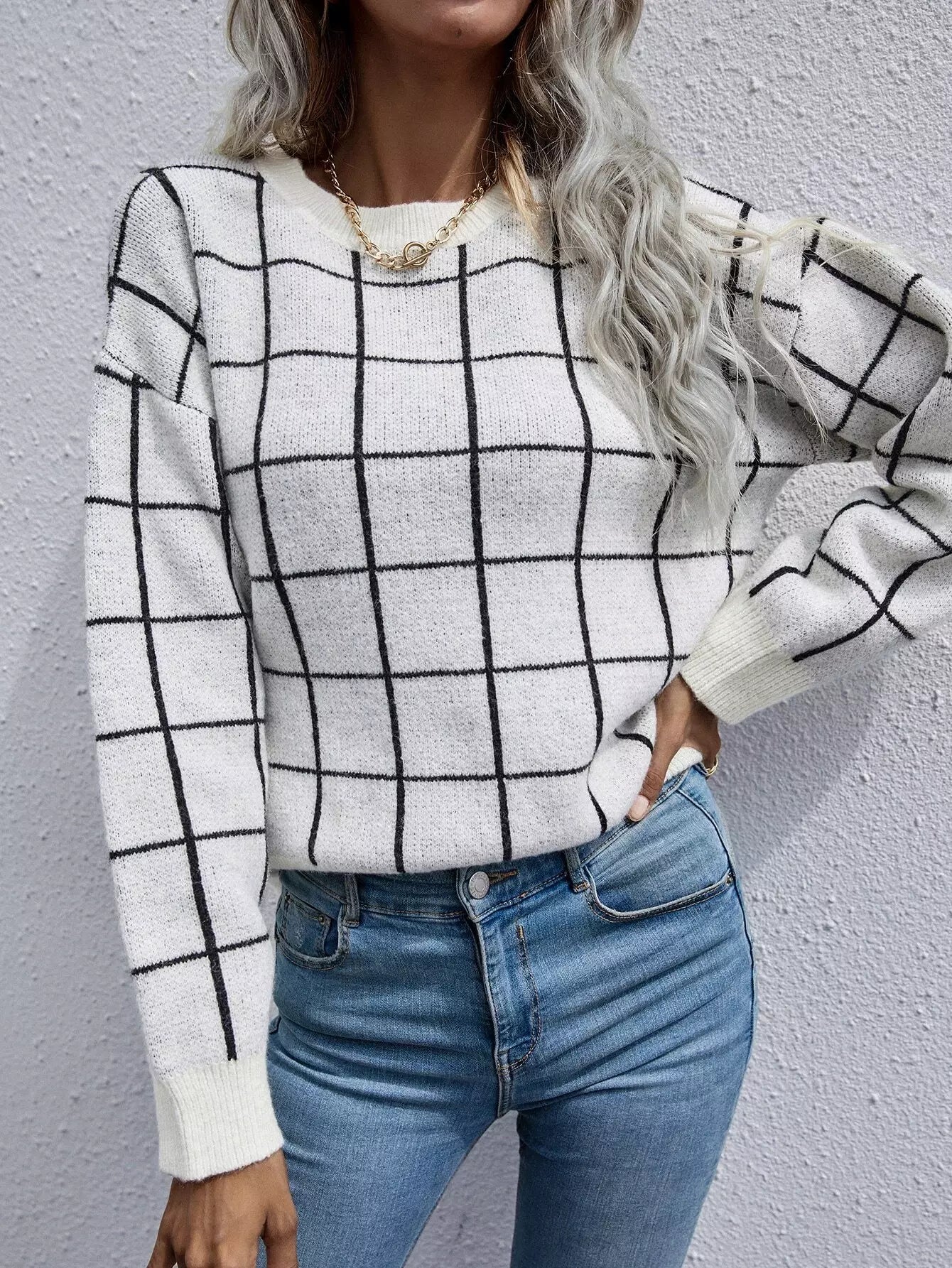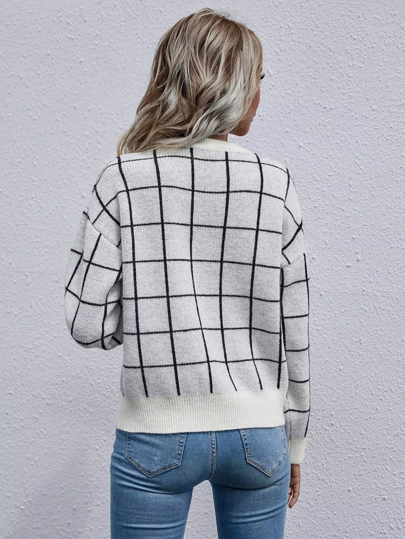 Grid Pattern Drop Shoulder Sweater