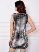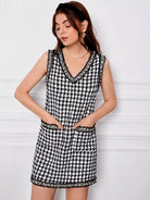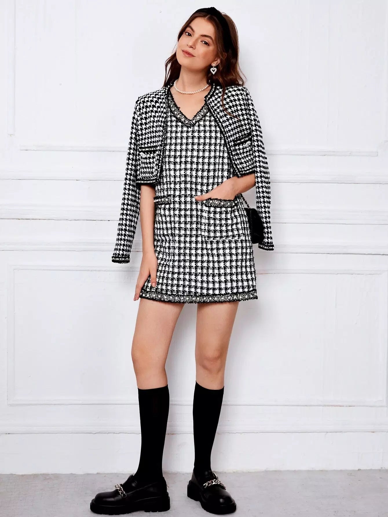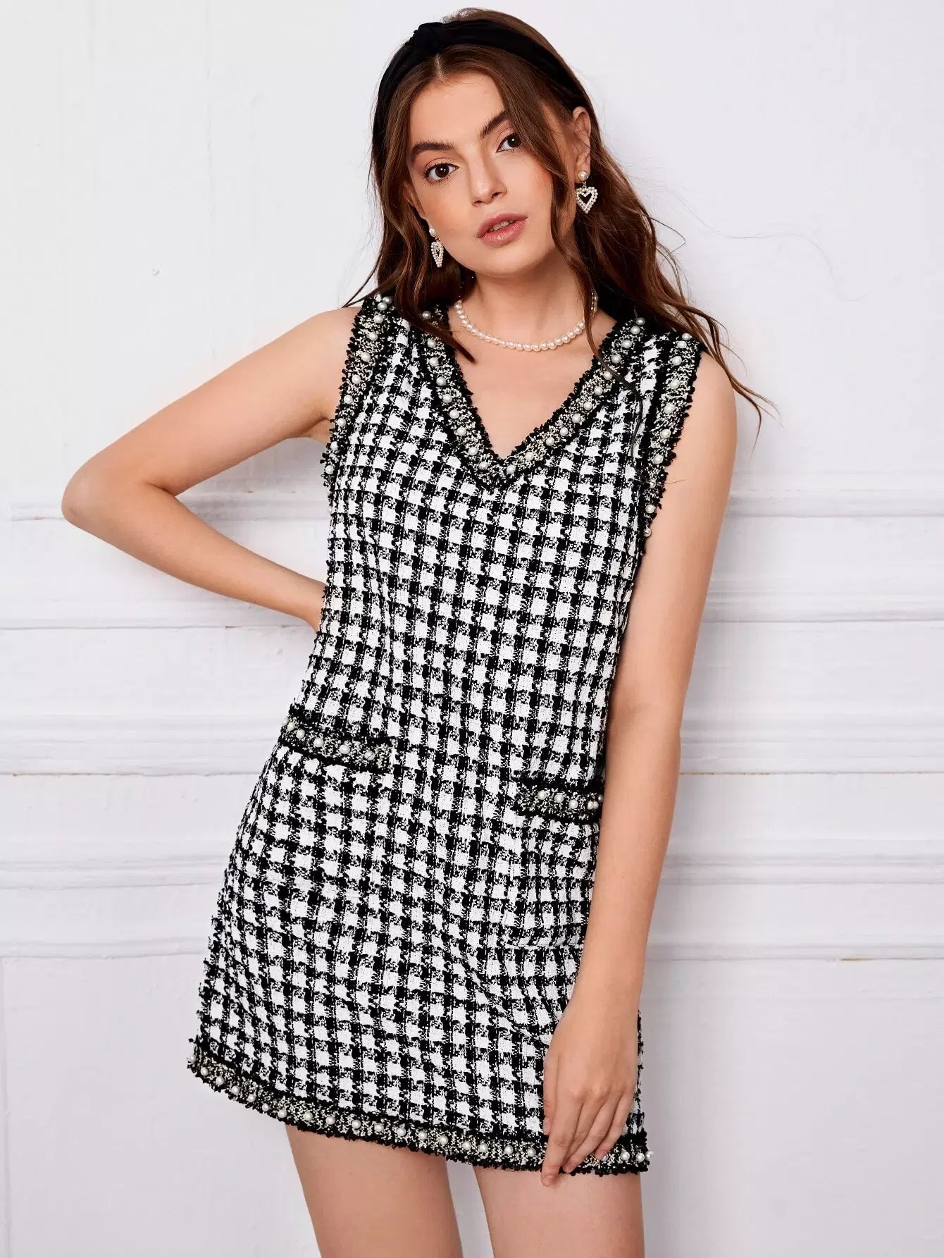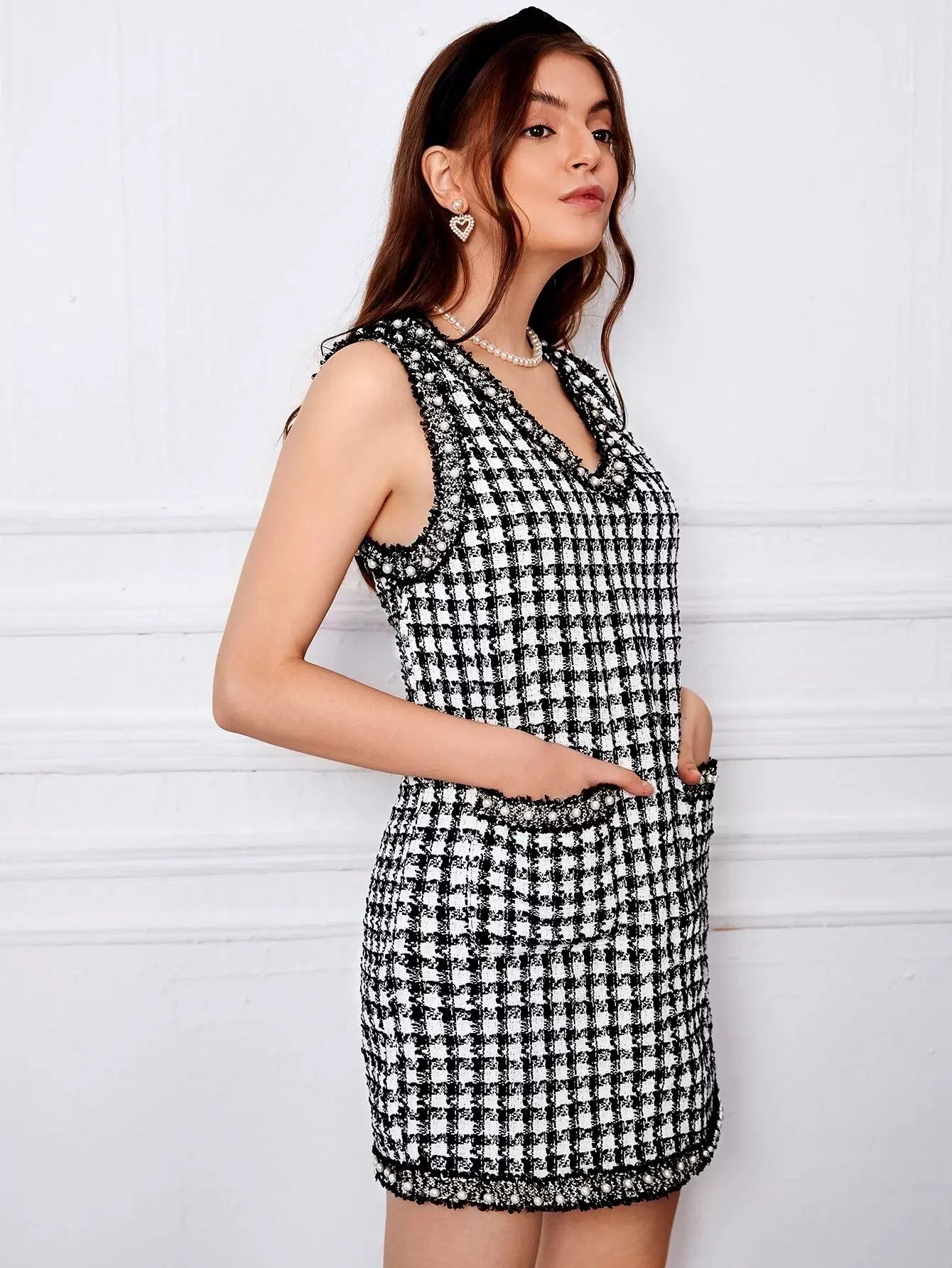 Houndstooth Pattern Raw Trim Pearl Beaded Tweed Dress