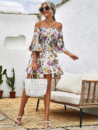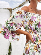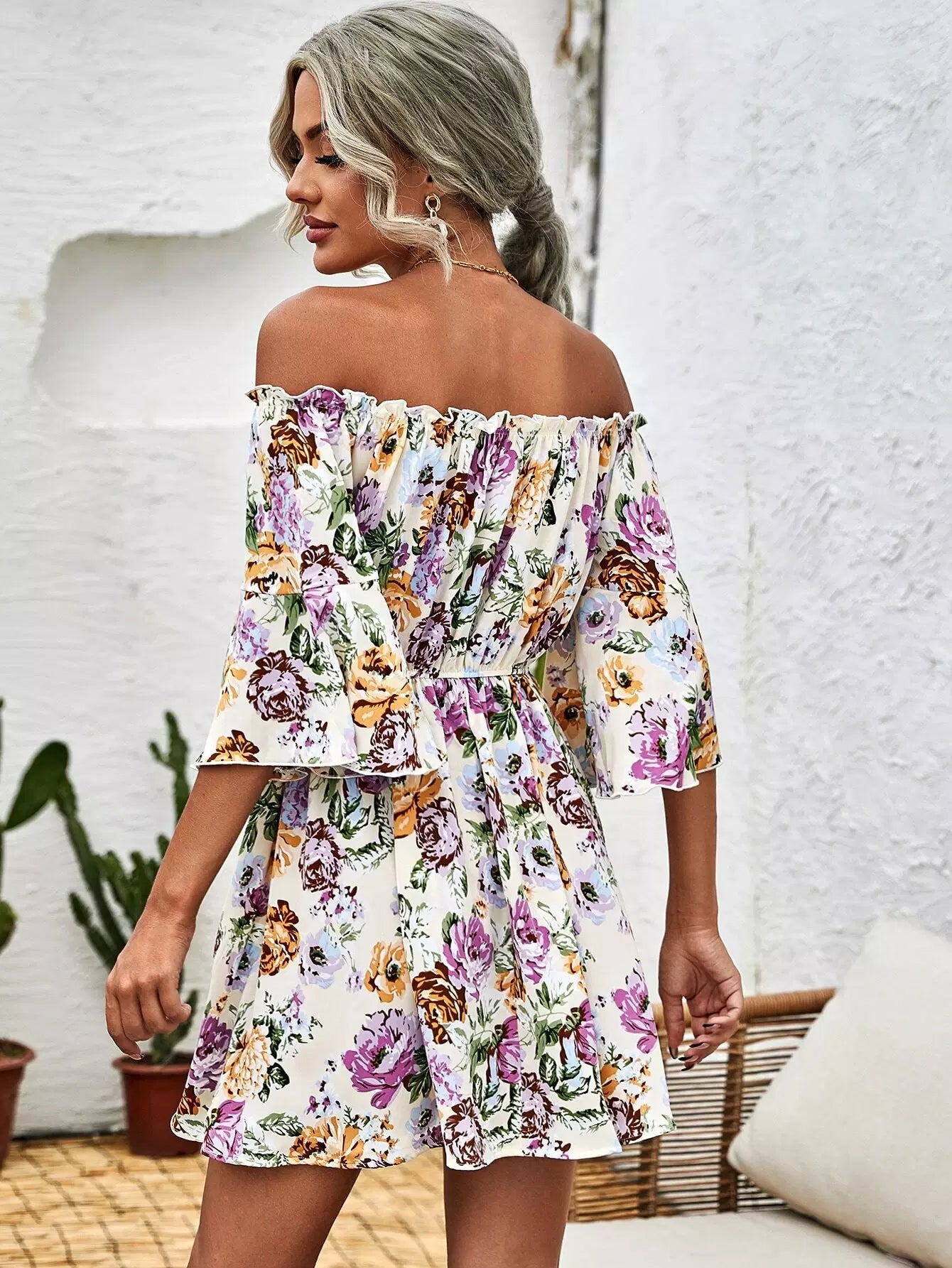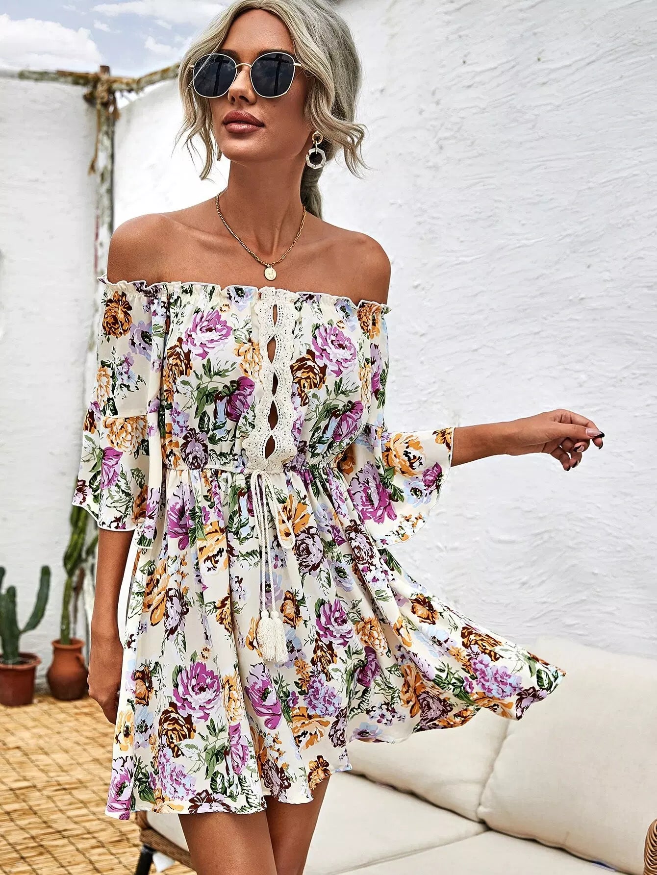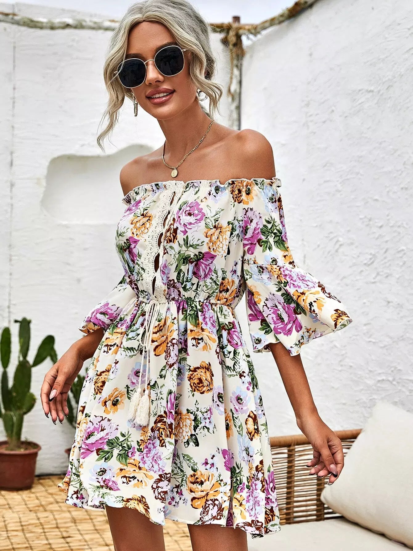 Lace Insert Fluted Sleeve Floral Bardot Dress
