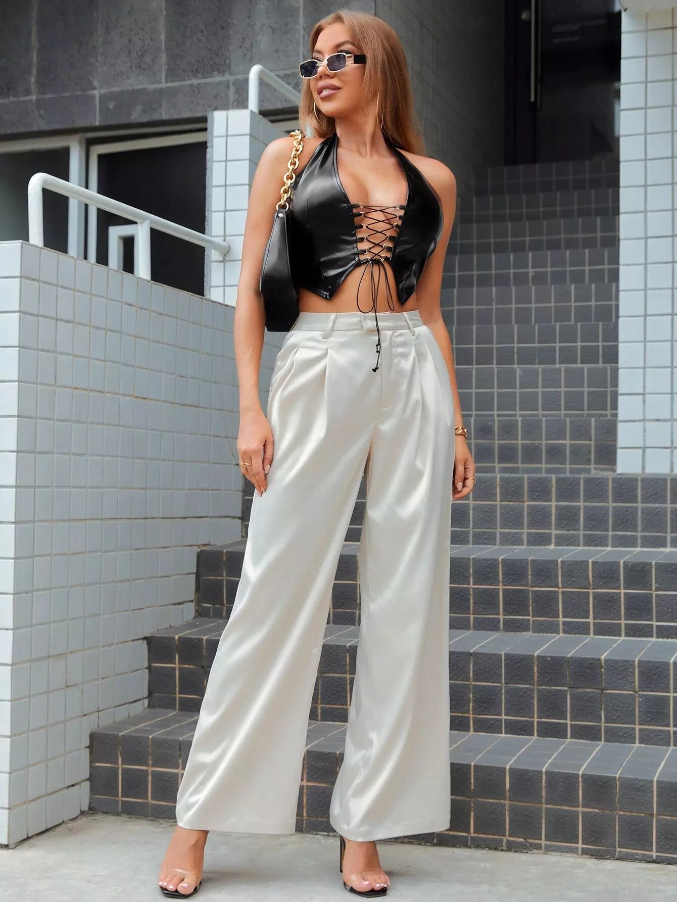 Lace Up Front PU Leather Halter Top