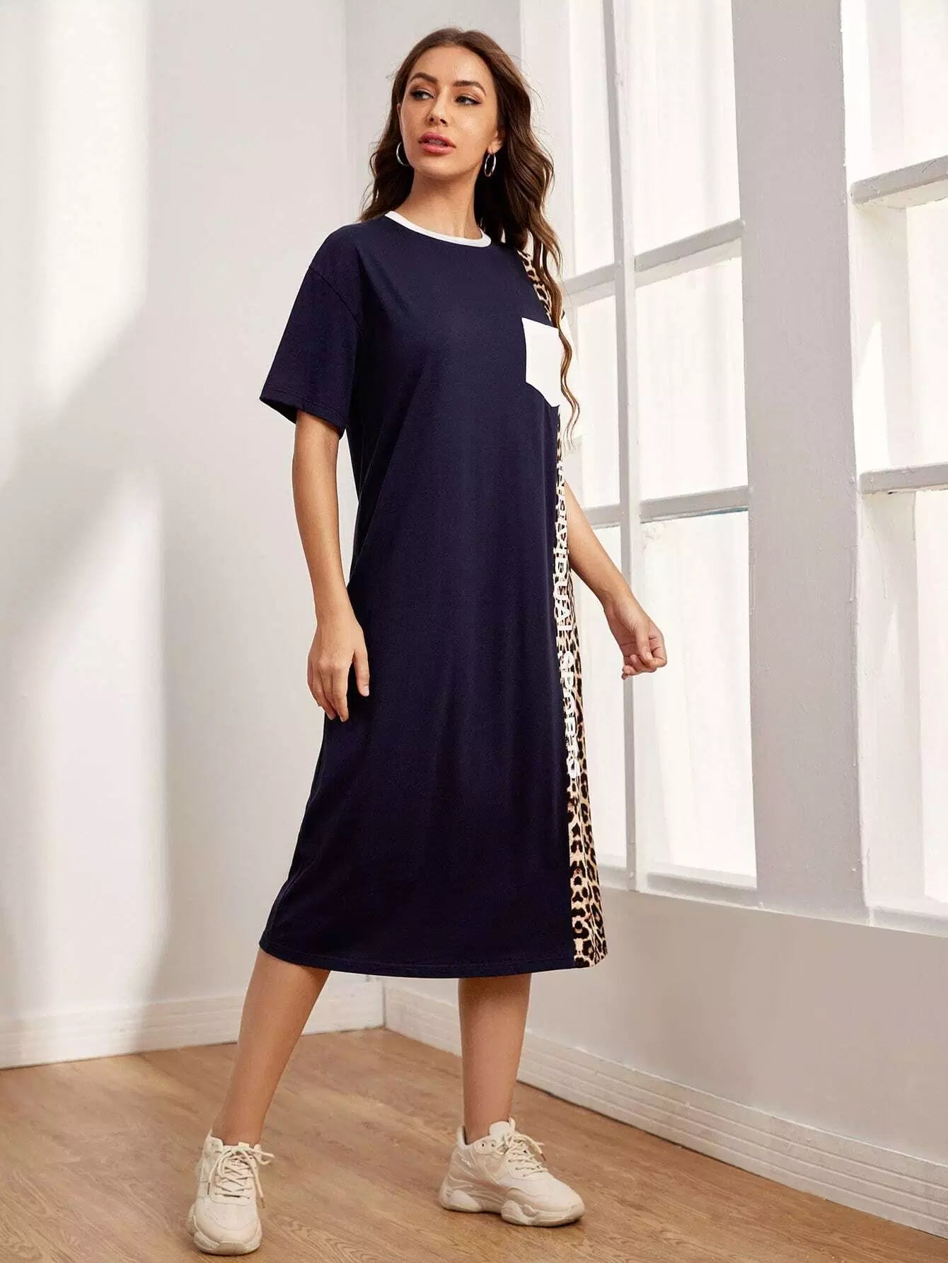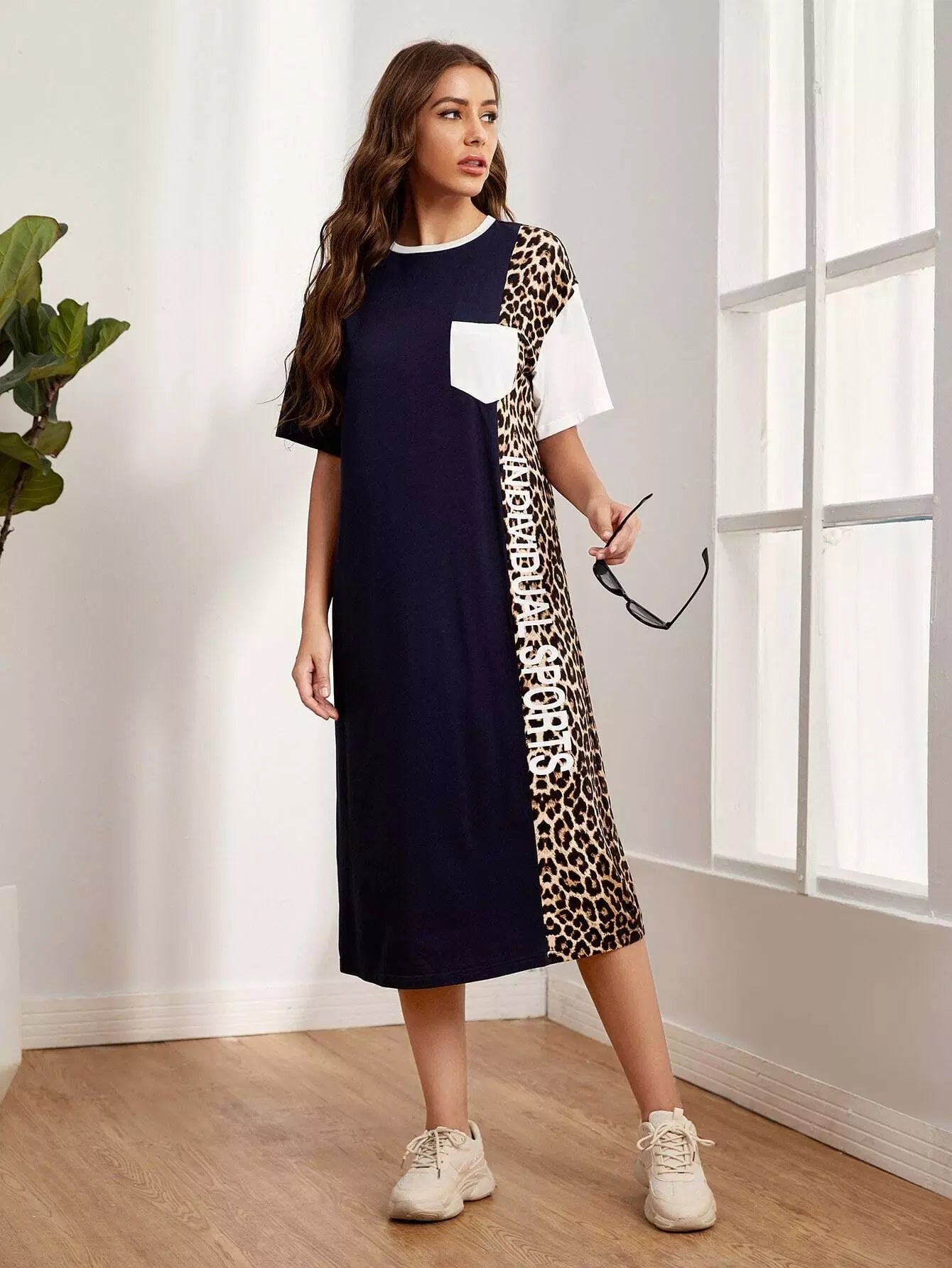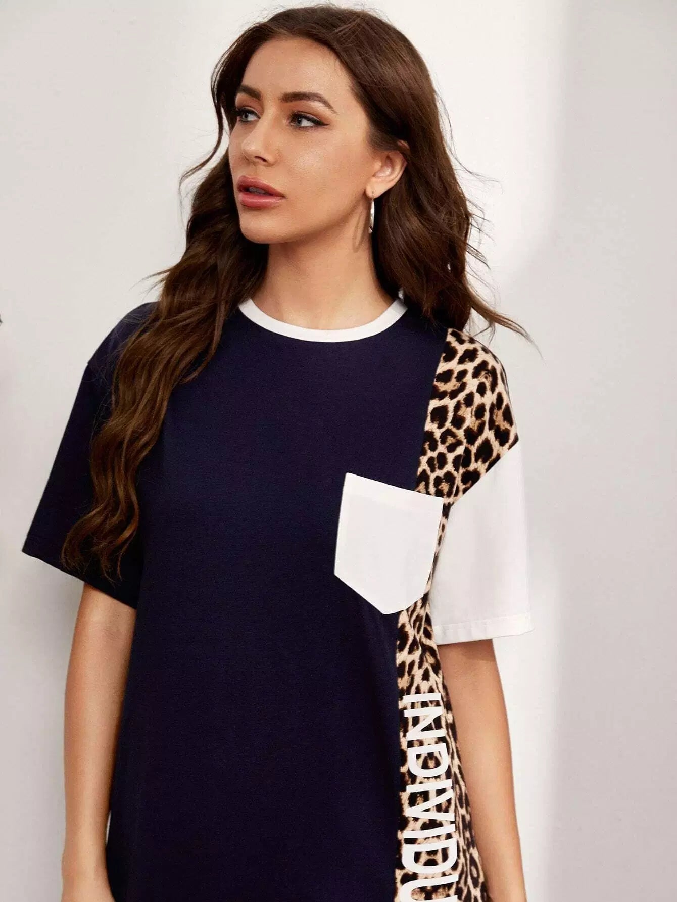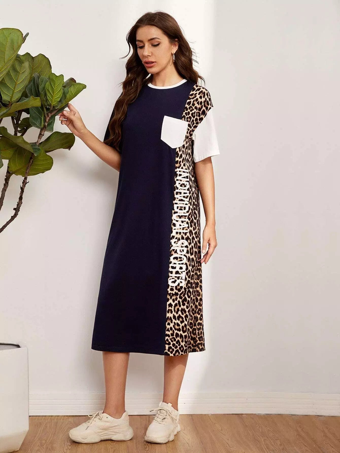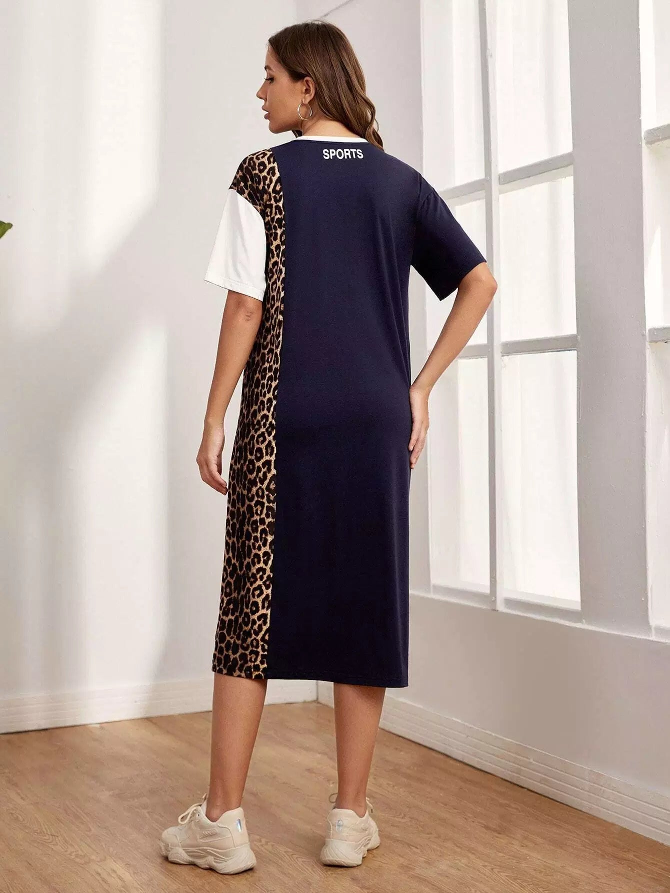 Letter Graphic Leopard Colorblock Drop Shoulder Dress