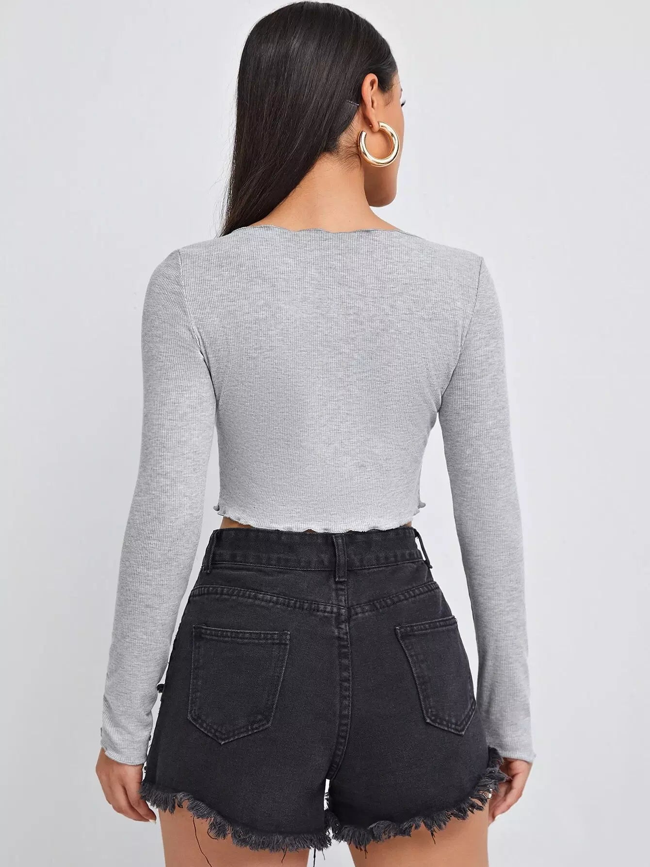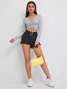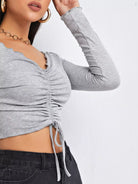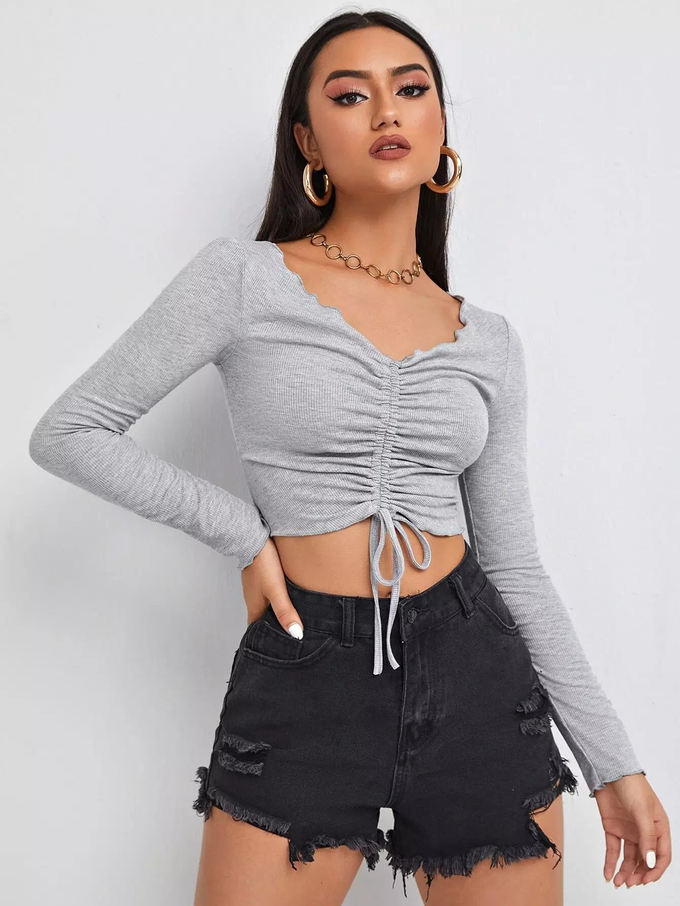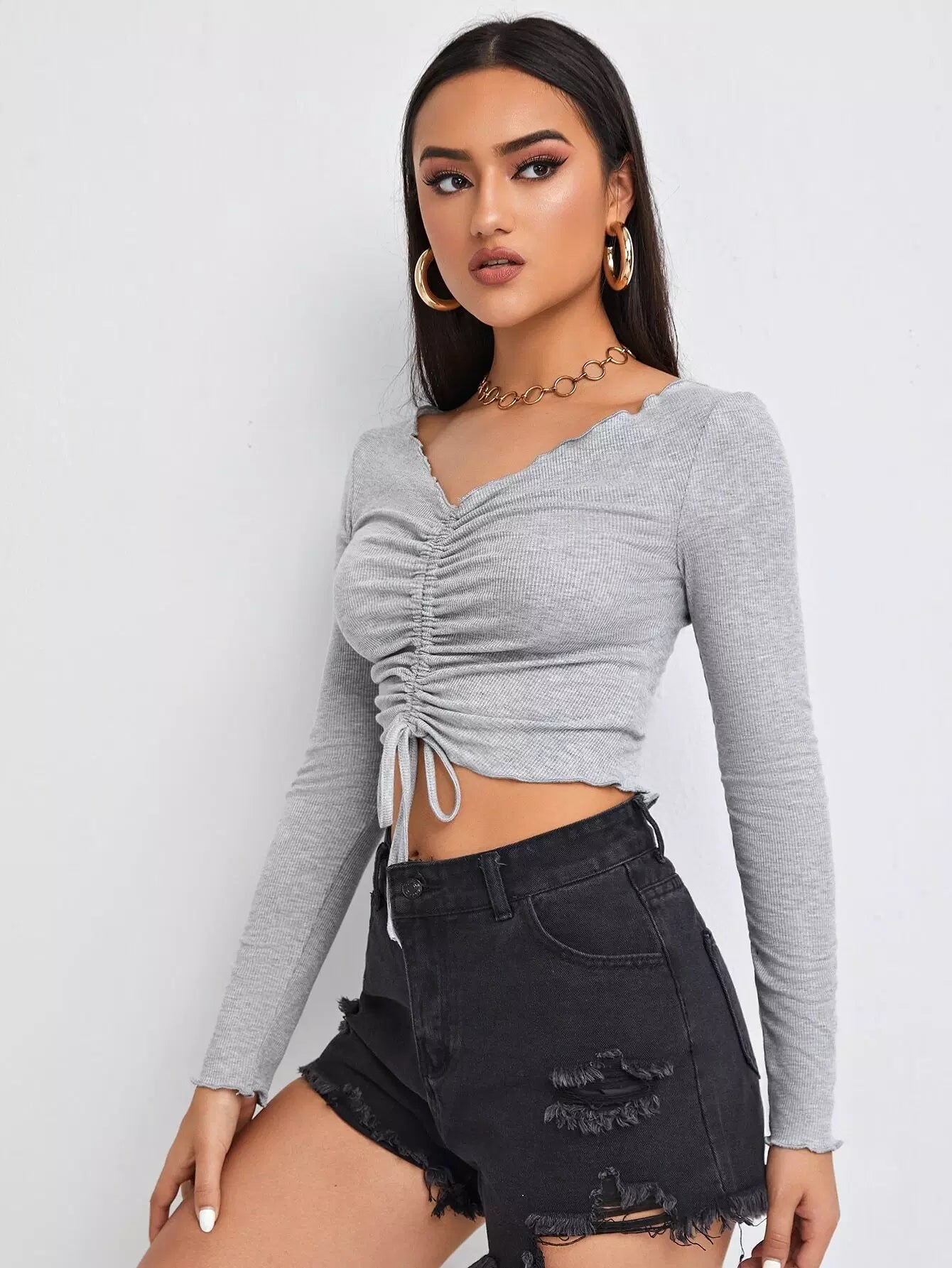 Lettuce Trim Drawstring Ruched Front Solid Tee