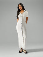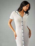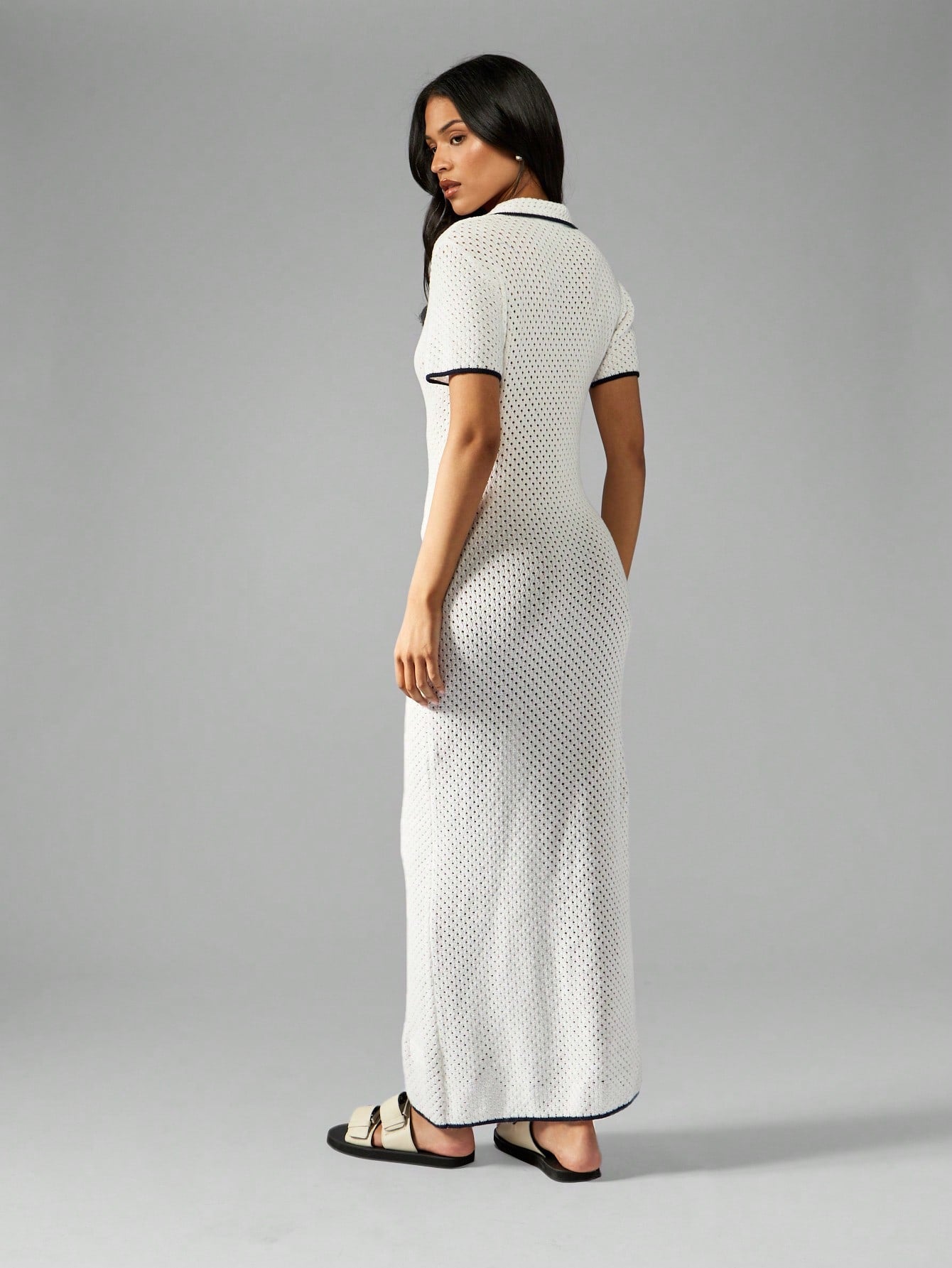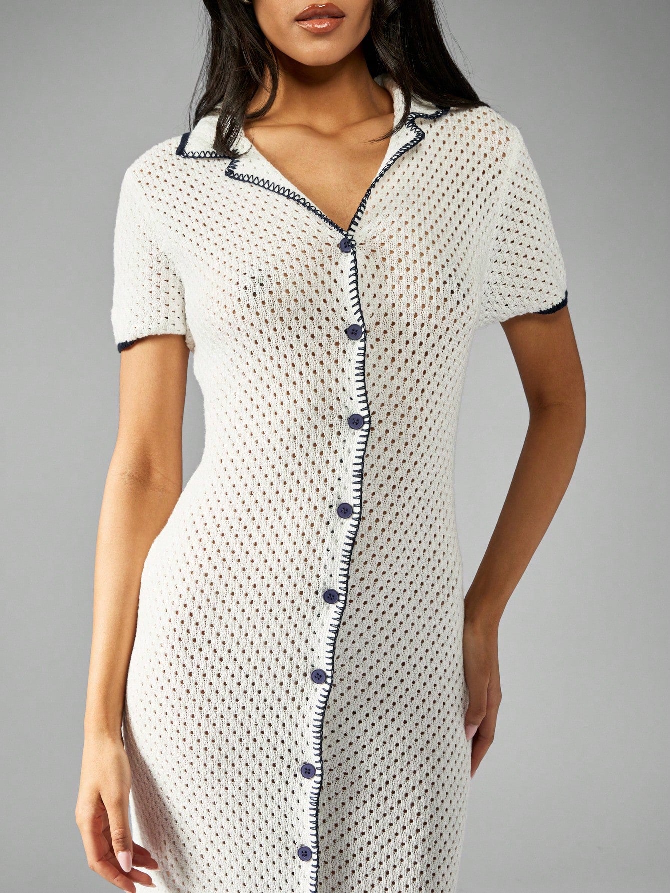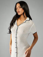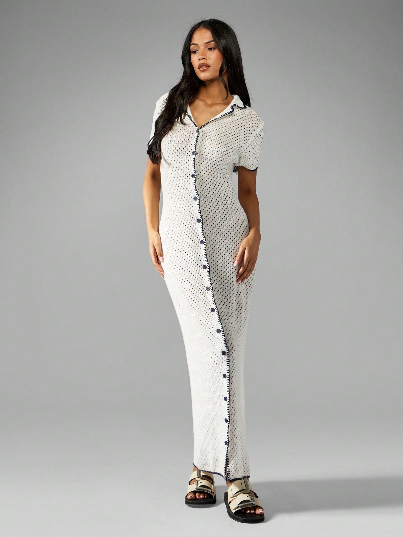 MISSGUIDED Button Through Knit Maxi Dress Pointelle Summer Beach Cover Up Resort Wear Short Sleeve Collared