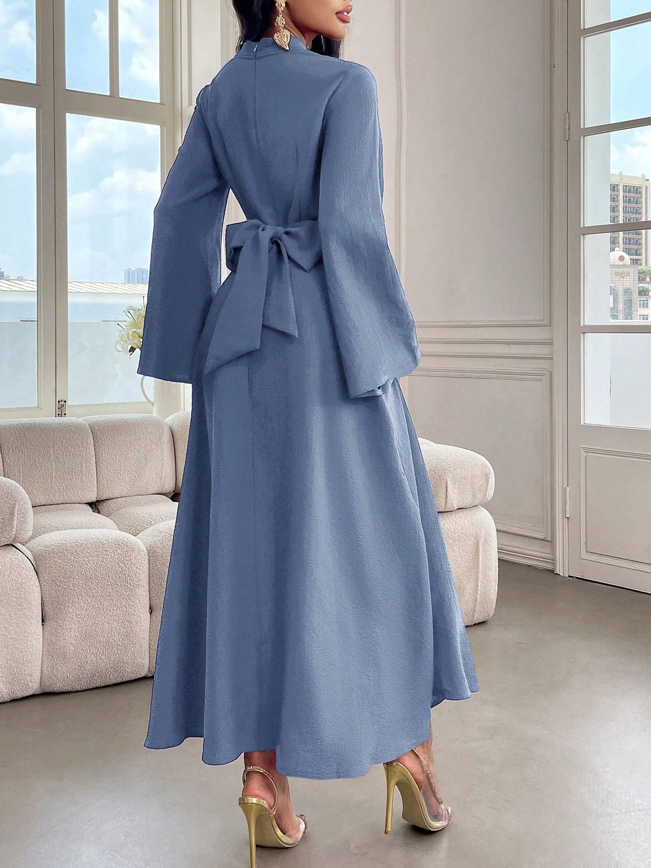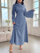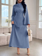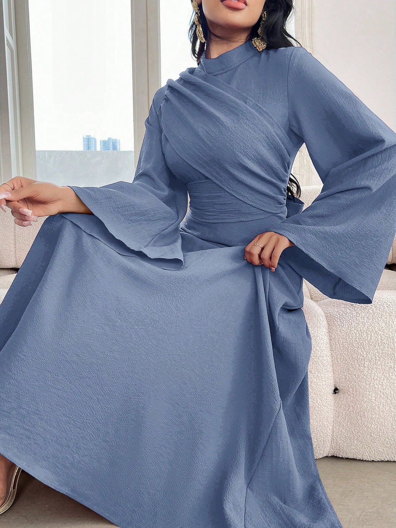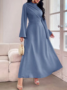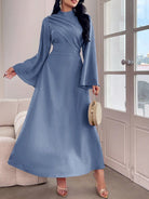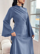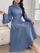 Modelyn Women's Solid Color Stand Collar Flare Sleeve Ruched Dress, Elegant