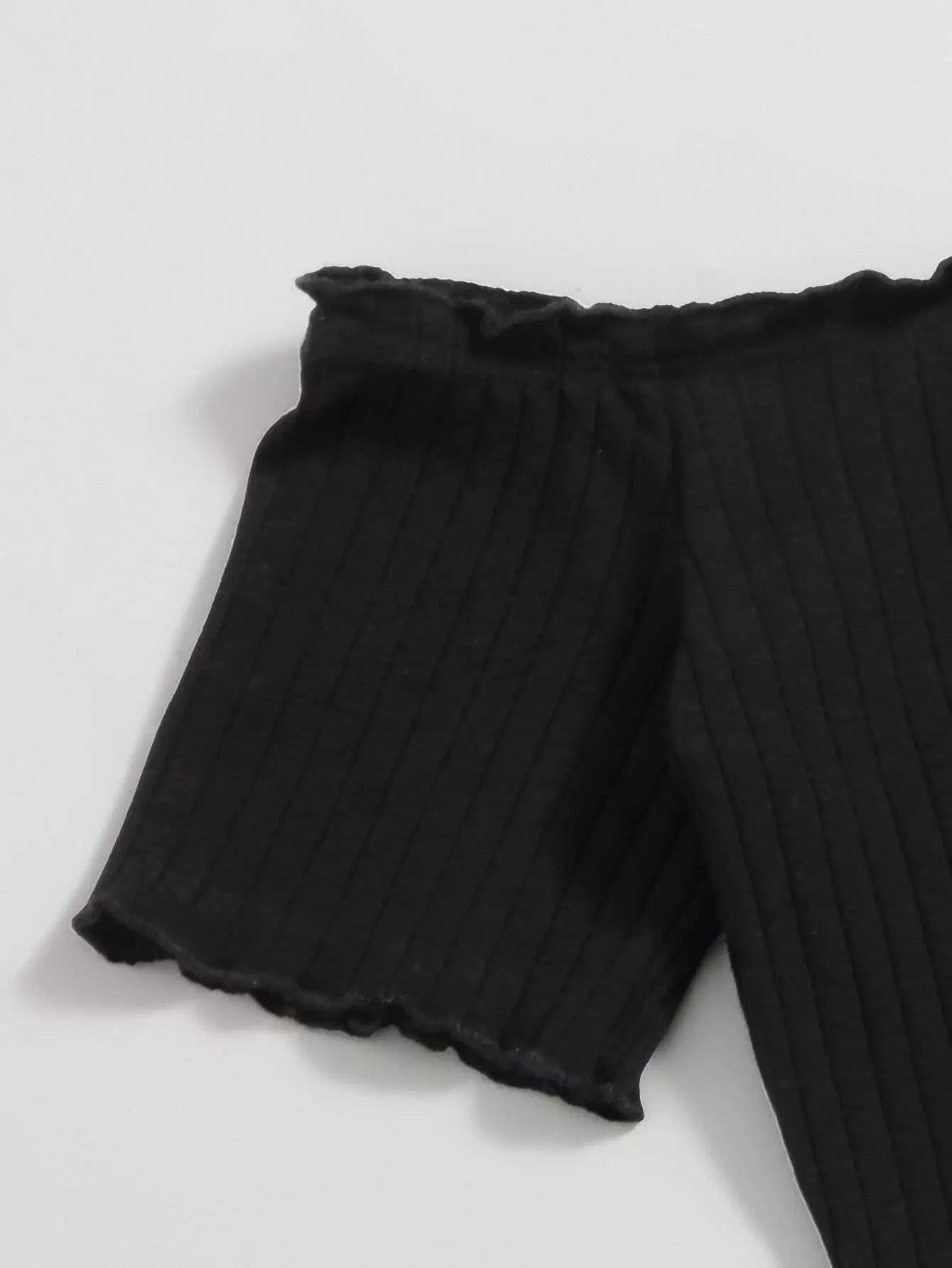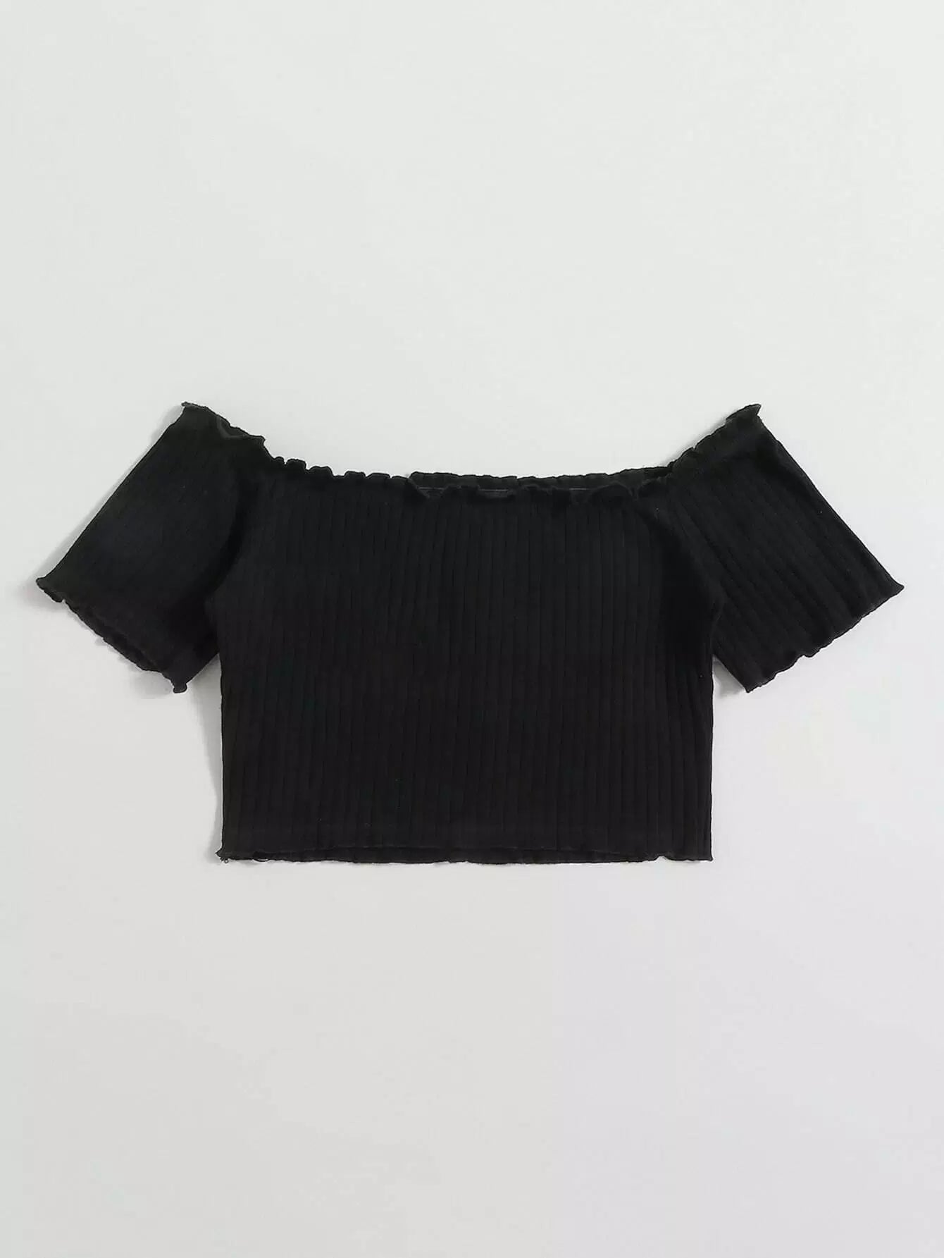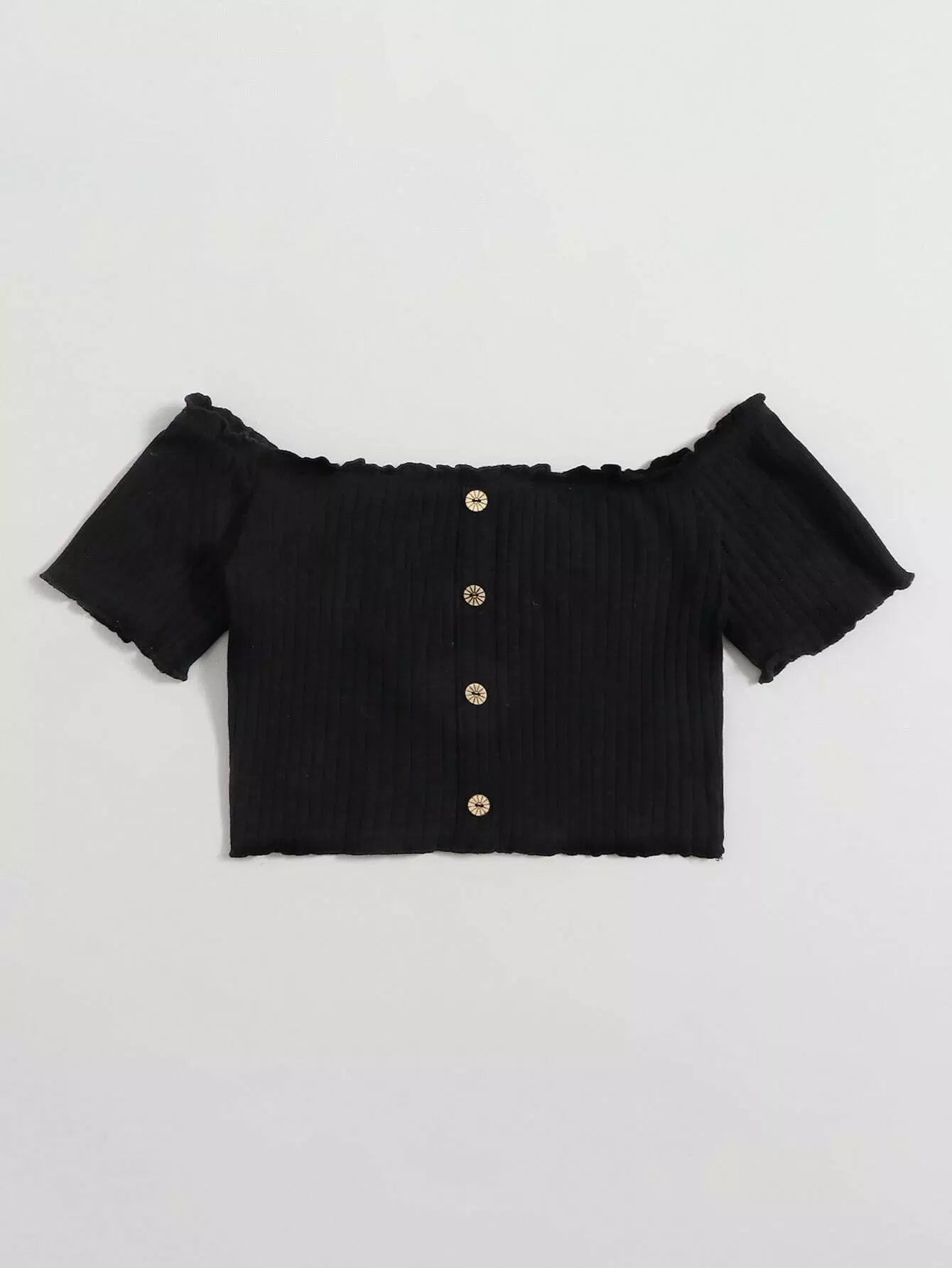 Off Shoulder Frill Trim Buttoned Front Rib-knit Top