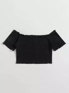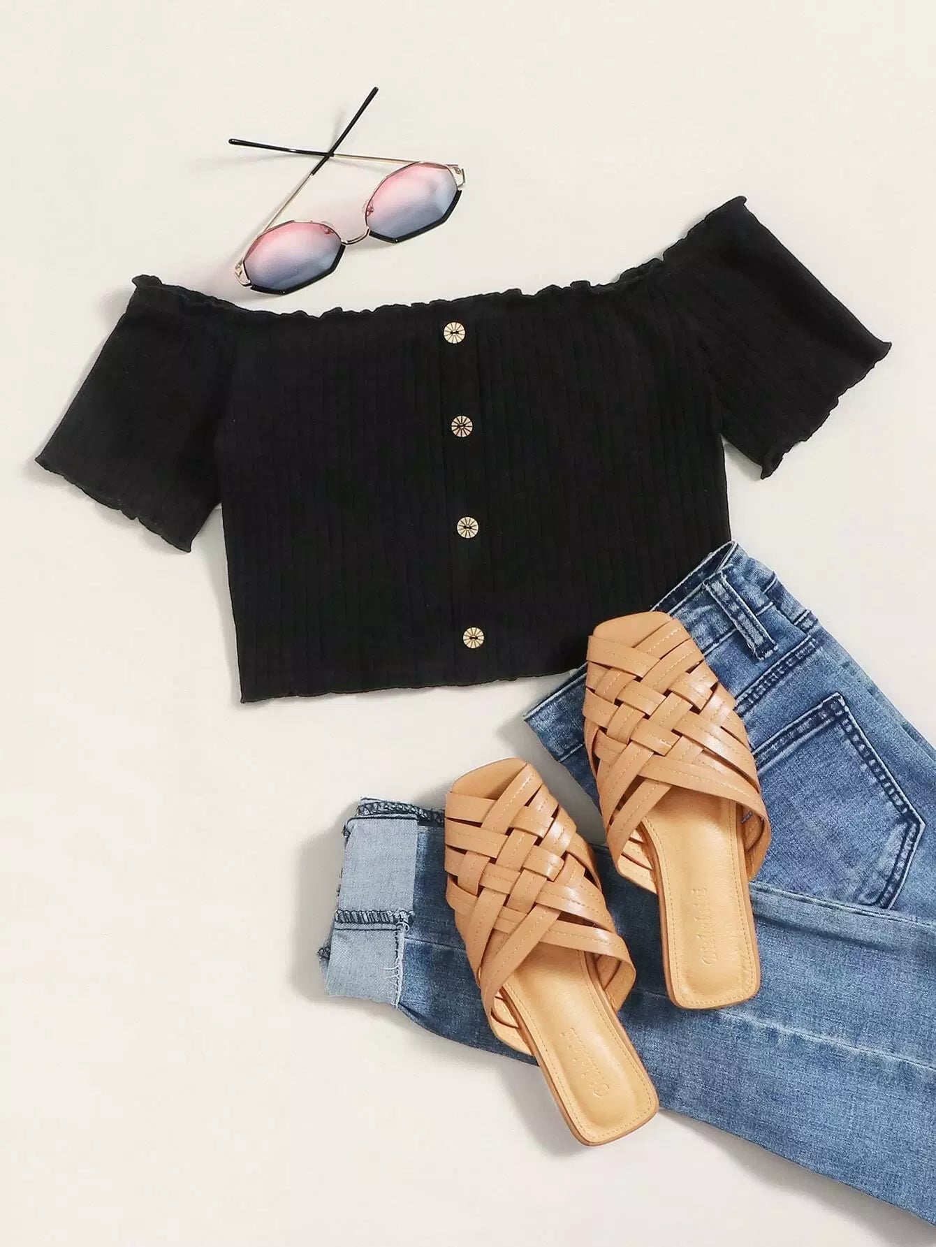 Women - Off Shoulder Frill Trim Buttoned Front Rib-knit Top