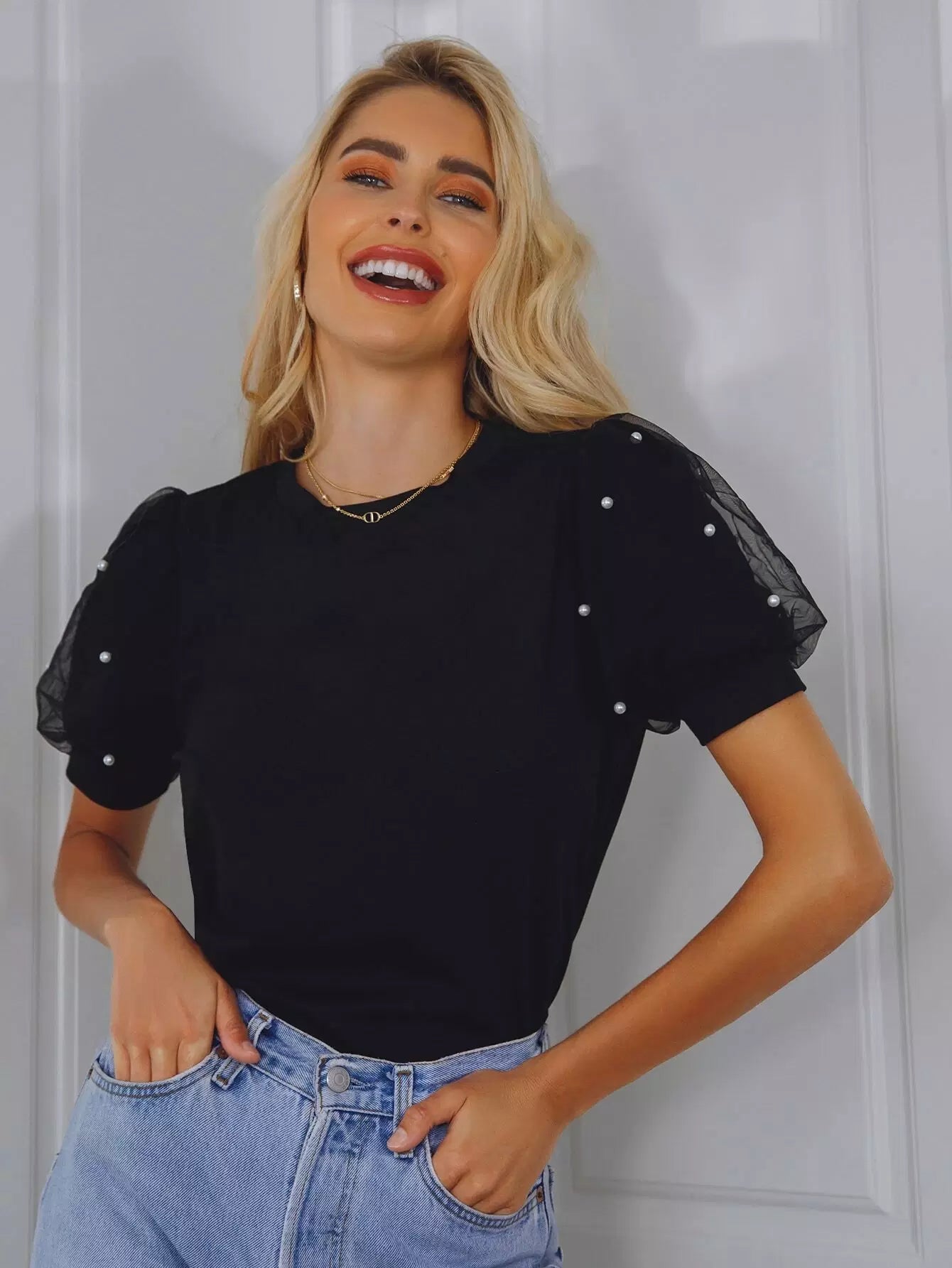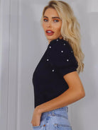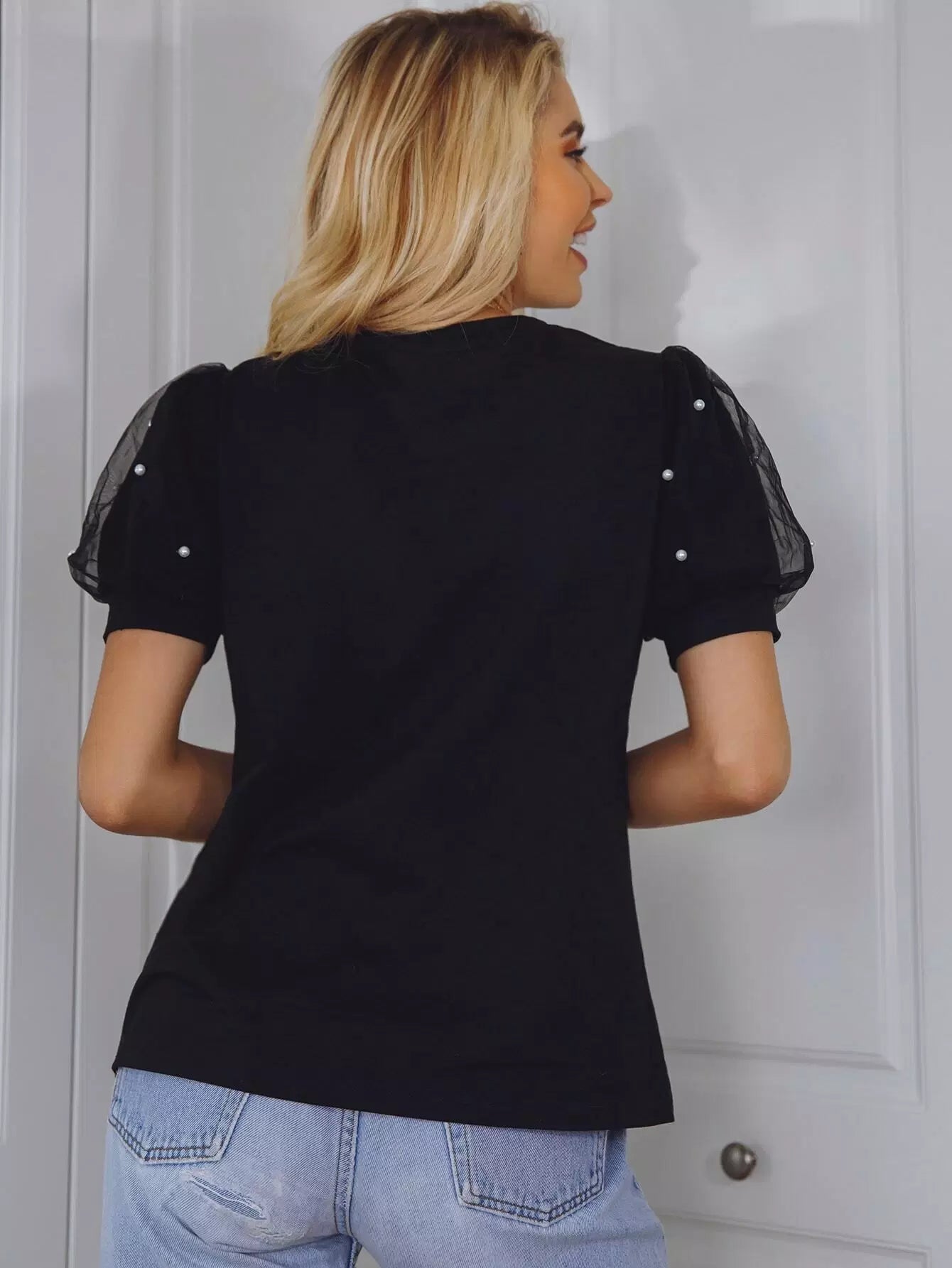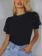 Pearls Beaded Mesh Puff Sleeve Top